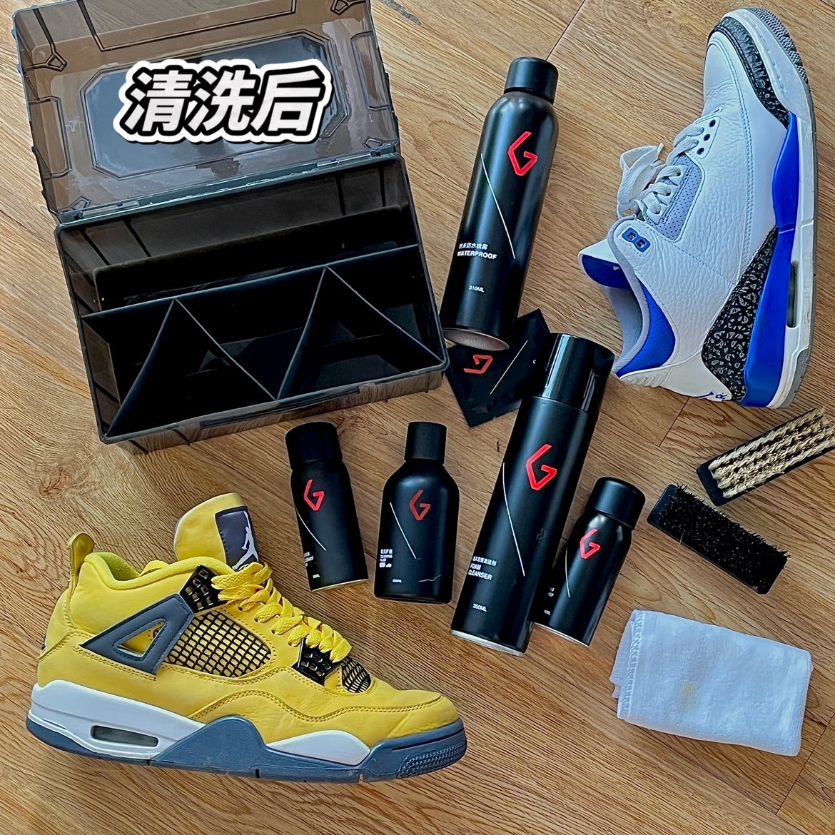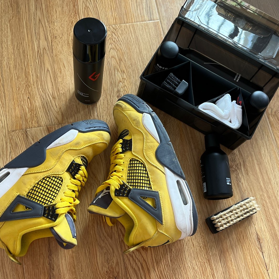 今年aj4电母太火爆啦!亮黄色的鞋身吸睛指数直接拉满。不过这黄色的牛巴哥材质的面料,弄脏了真的有点头疼。不过我我亲测用goto的高手清洗盒,能有效的洗去污渍,普通的刷洗容易让黄色褪色,这高手盒中不但有清洁用的清洁液,还有保护皮革的护理液,一套下来让你的球鞋焕然一新。有比较难清理的球鞋,建议大家都可以试一试