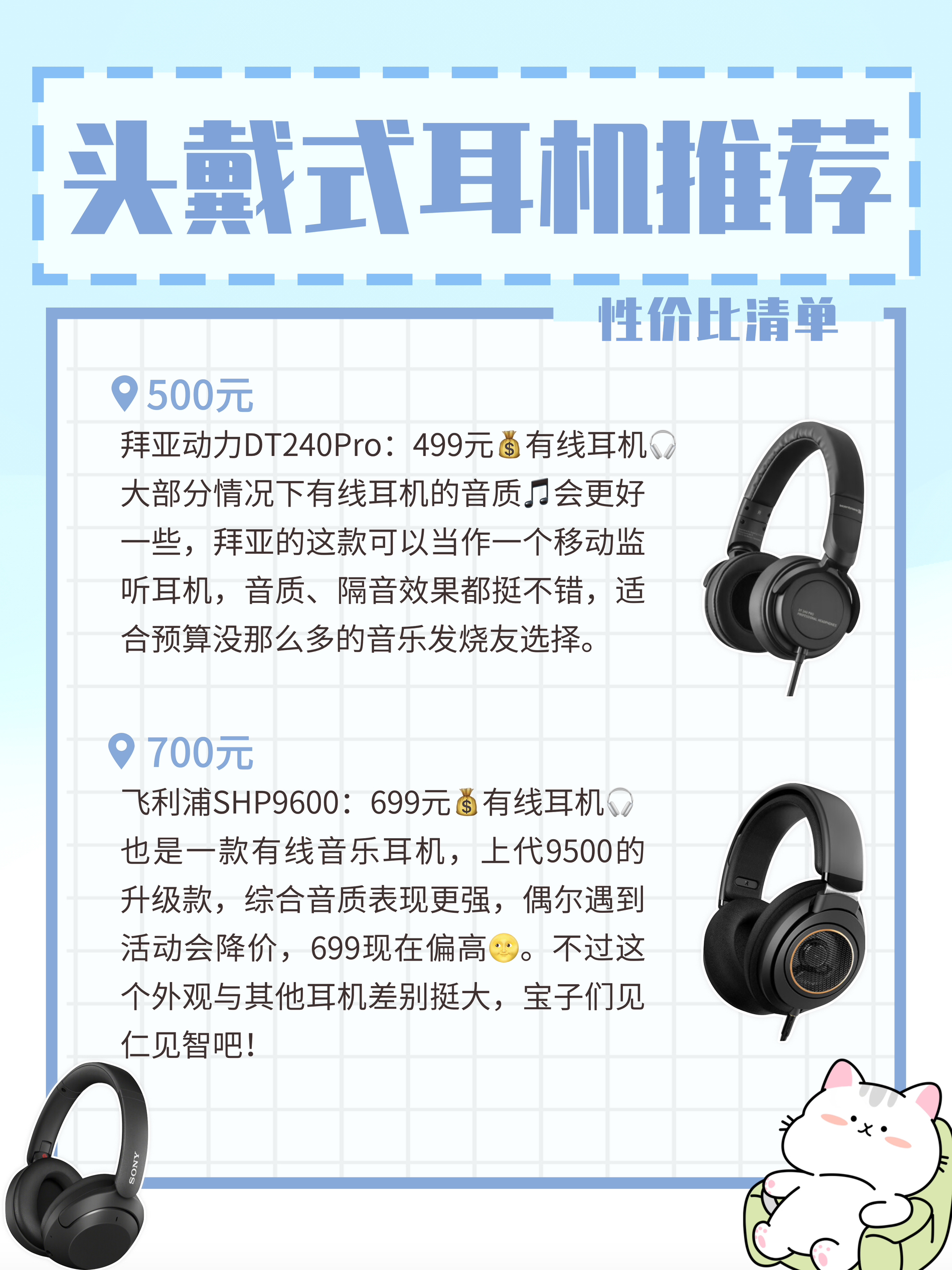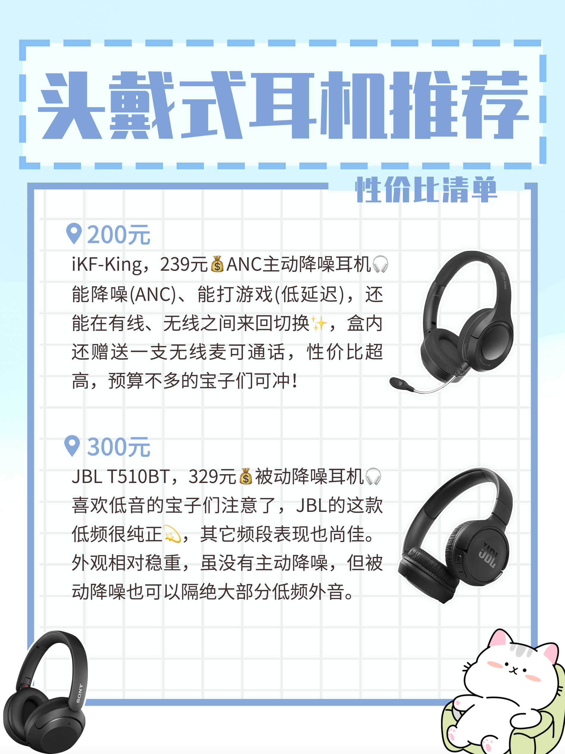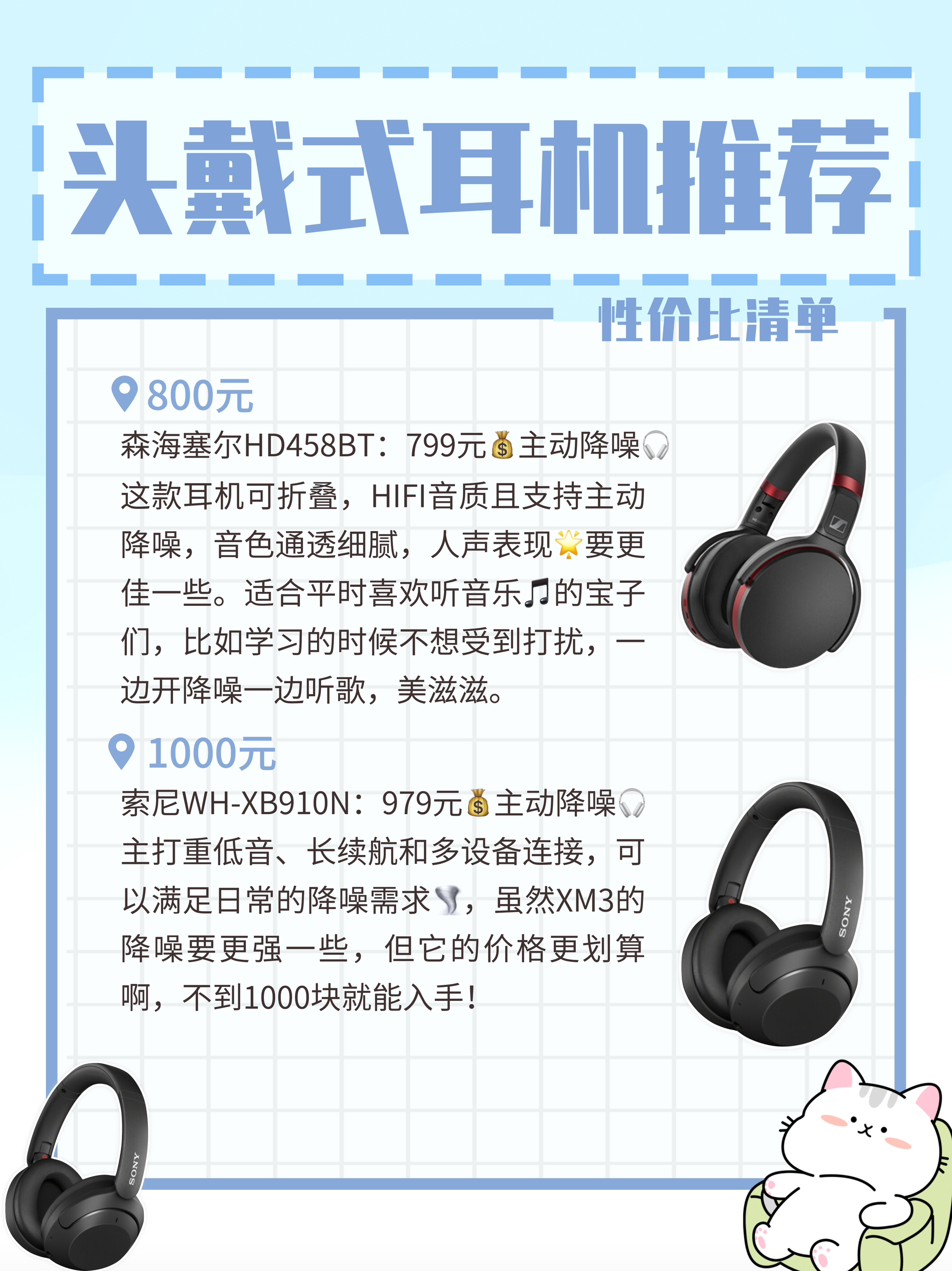如何挑选一款适合自己的头戴式耳机🎧,今天给大家分享6⃣️款性价比不错的耳机,价格💰最高不超过1000元,产品都放图里啦,需要的自取! 1⃣️头戴式耳机分类 如果从用途出发,头戴式耳机有带降噪、不带降噪、有线和无线的,注重降噪能力👂的可考虑支持主动降噪的耳机,而注重音质🎵的可考虑有线的耳机。 2⃣️无线传输规格 按照顺序由低到高,可分为SBC、ACC、APTX和LDAC,其中LDAC✨是目前...