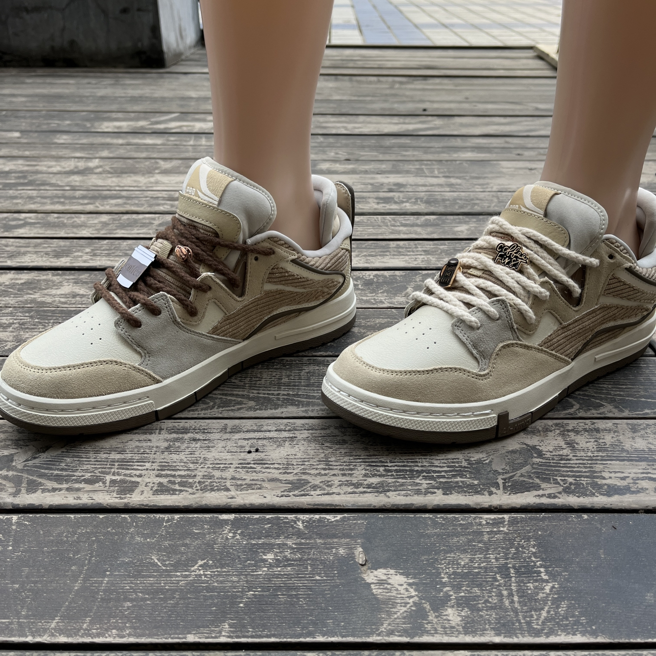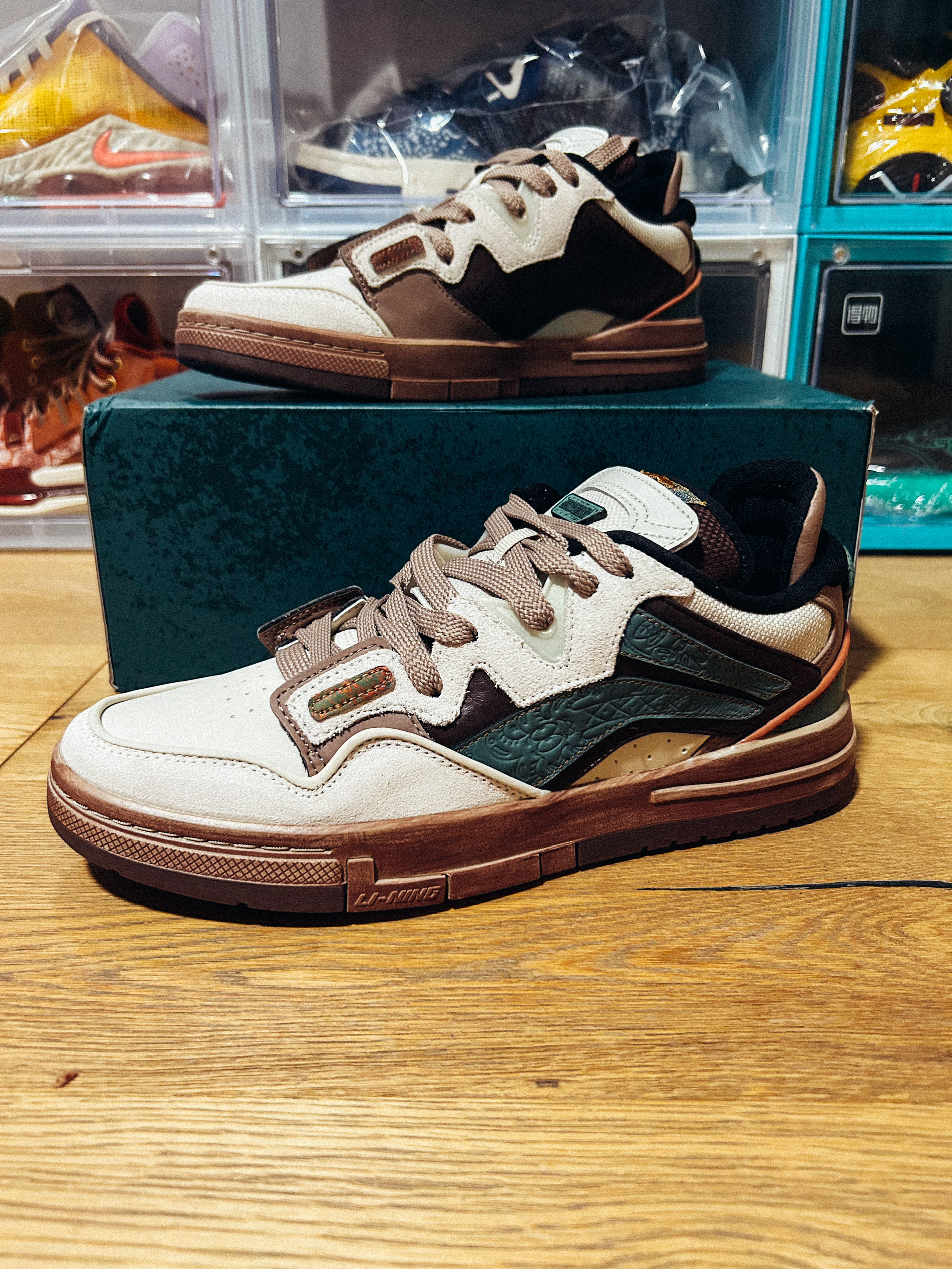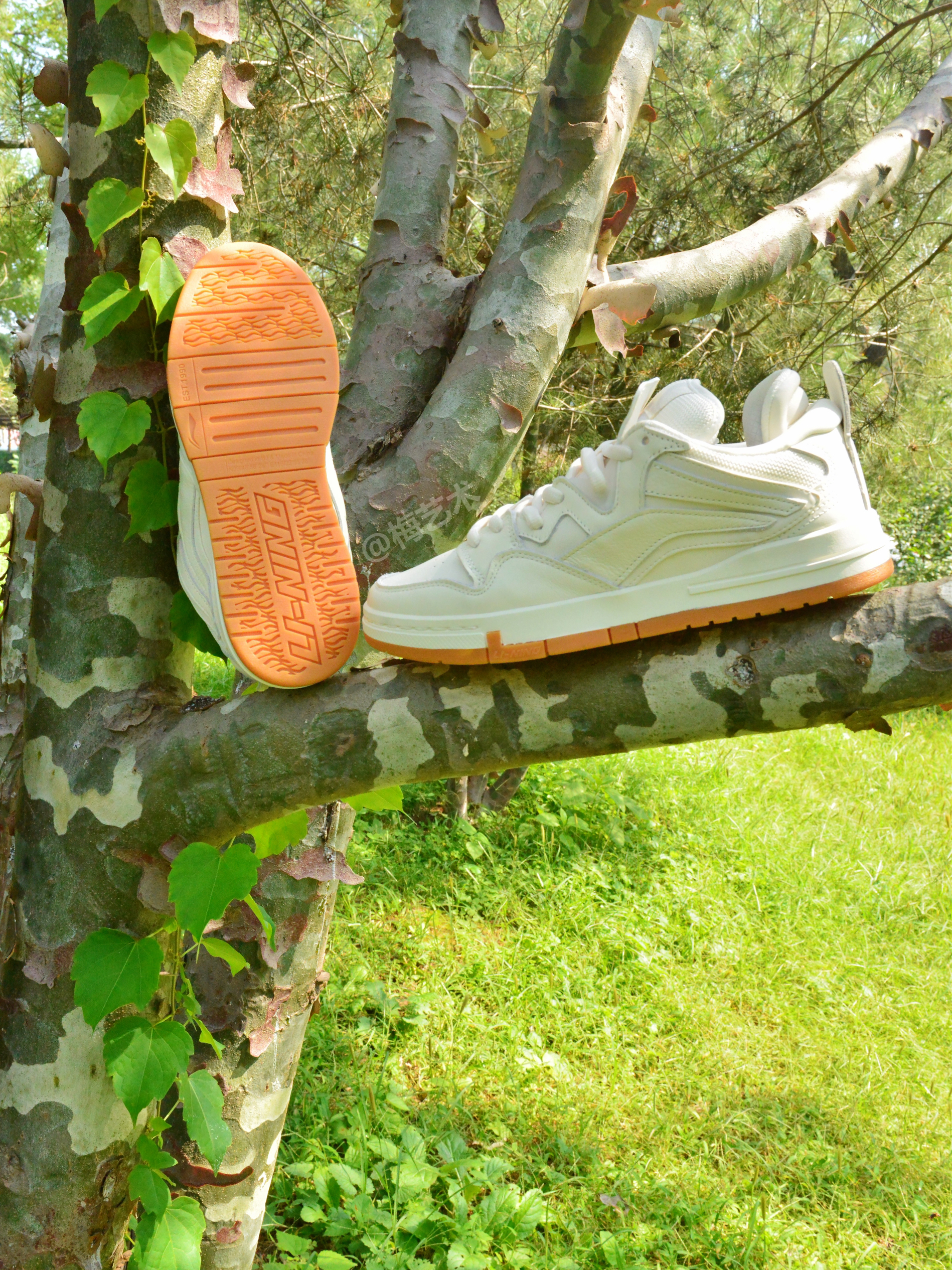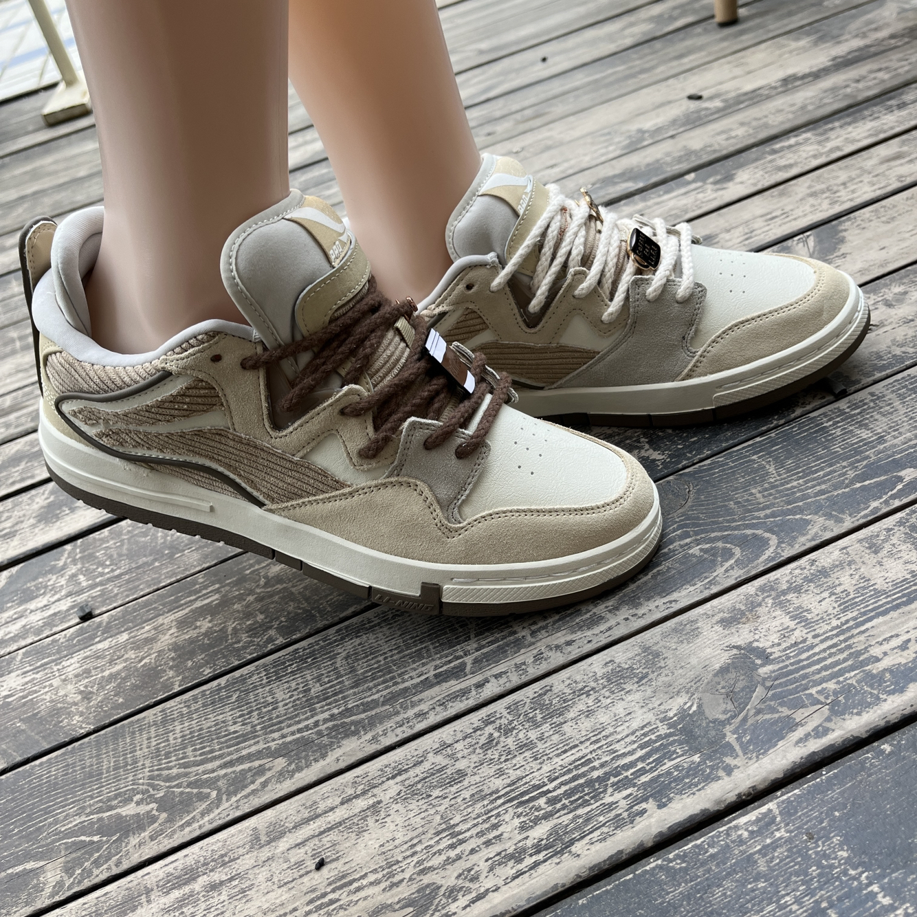 鞋带店铺:IOTS 温柔卡其色的皮革鞋身,层次分明。 中端灰色皮革一头延伸至鞋底,不对称设计风格个性十足!这款鞋侧李宁Logo以绒面革打造,很像灯芯绒的纹理和质感。同时Logo外边框及后跟处都由深棕色线条勾勒,立体感很强。这款板鞋鞋底不像其他那么硬,上脚比较舒适。