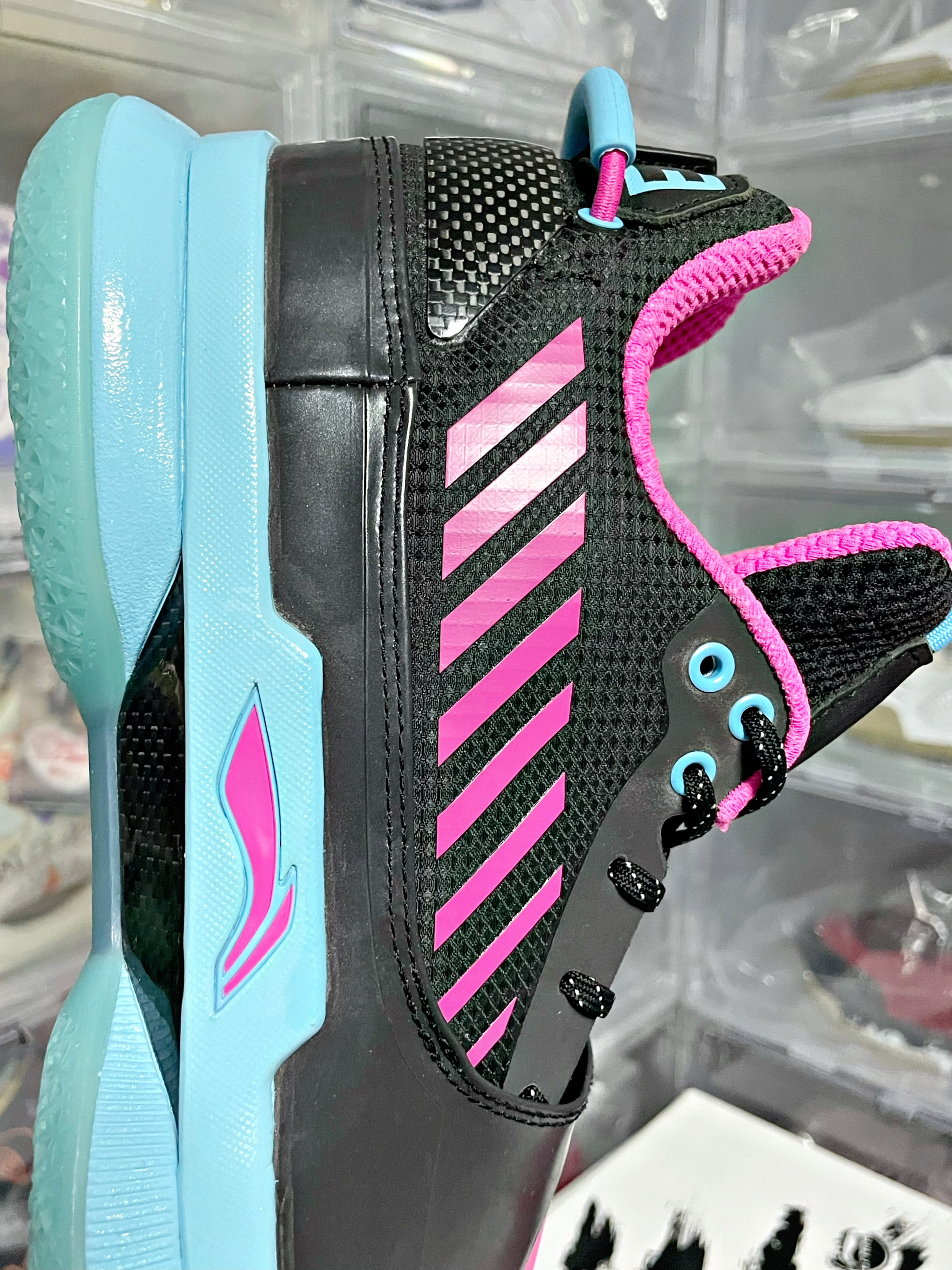 具有迈阿密特色的韦德之道7“TEB” 黑色和粉色的 完美碰撞 中底和外底的蓝色犹如迈阿密海滩的蓝 限量发售了500双 值得收藏