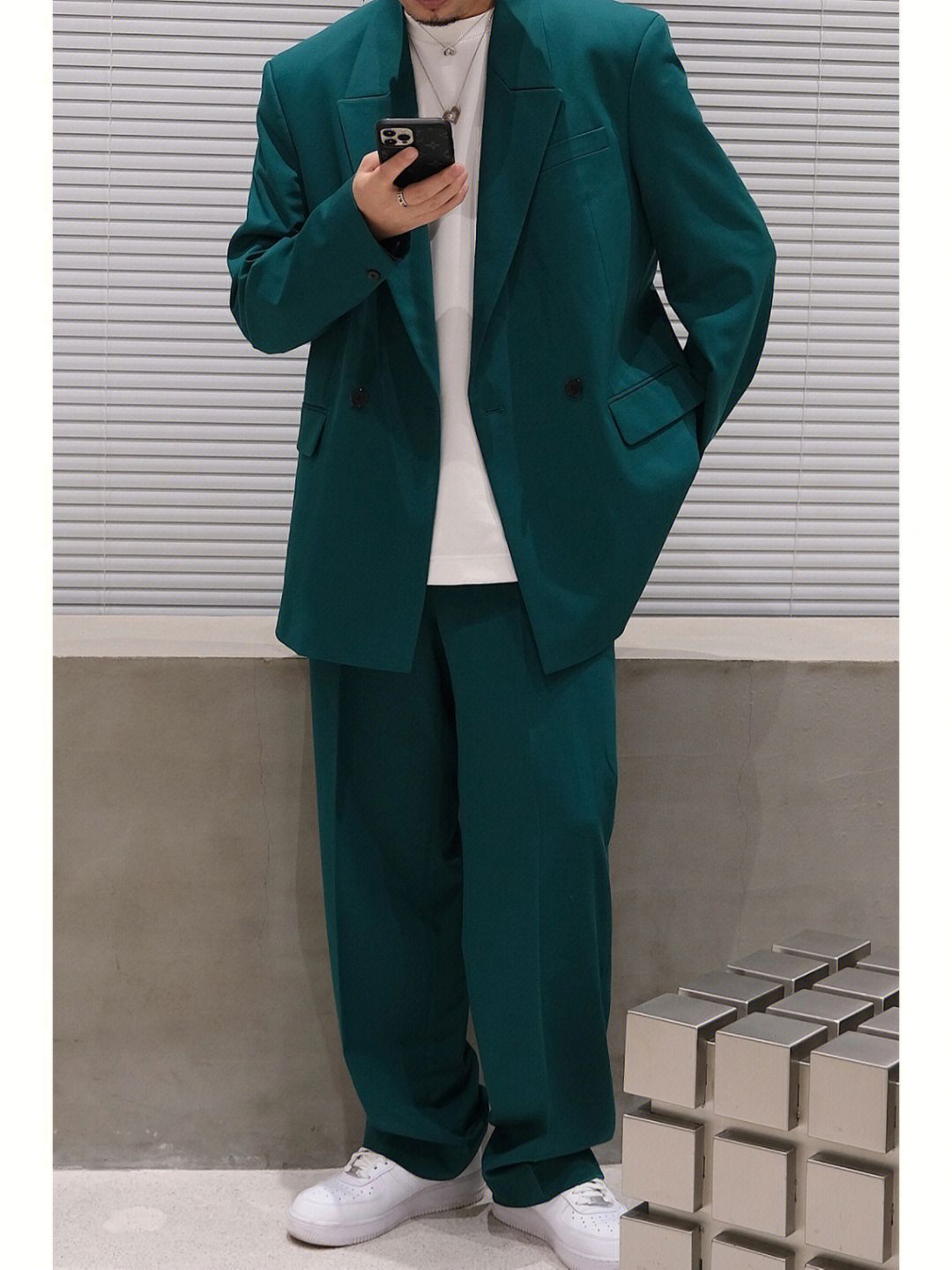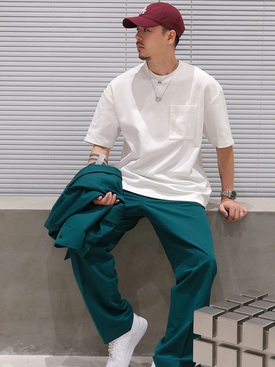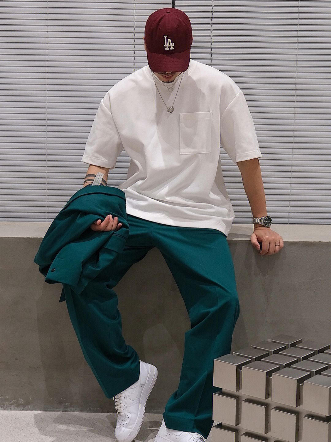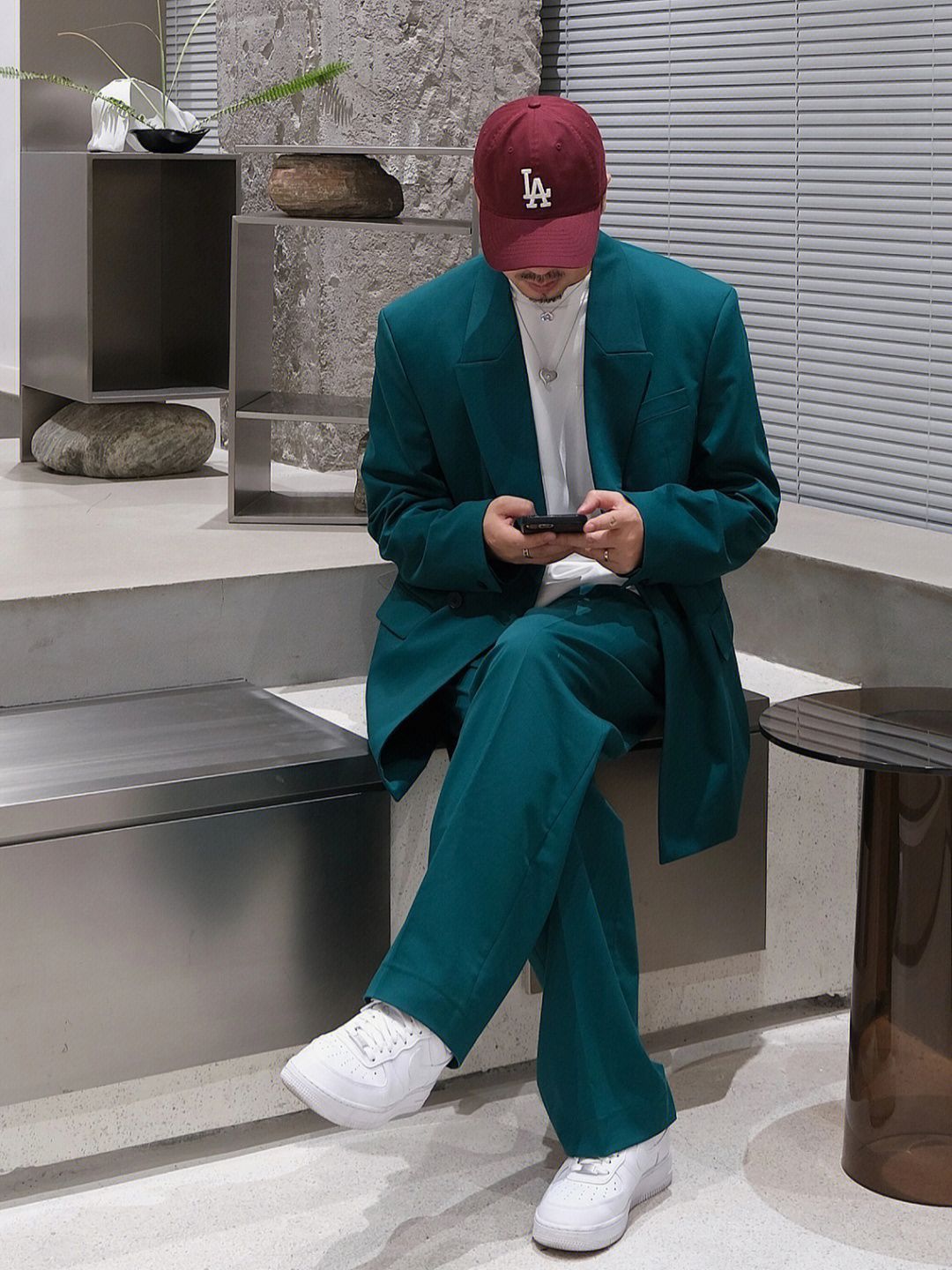 笔记灵感 绿色廓形西服套装 枣红色鸭舌帽🧢 内搭廓形白T 白色板鞋 #男朋友穿搭 #ootd每日穿搭 #休闲穿搭 #介绍一个小哥哥 #鸭舌帽 #撞色穿搭 #廓形西装 #韩系穿搭