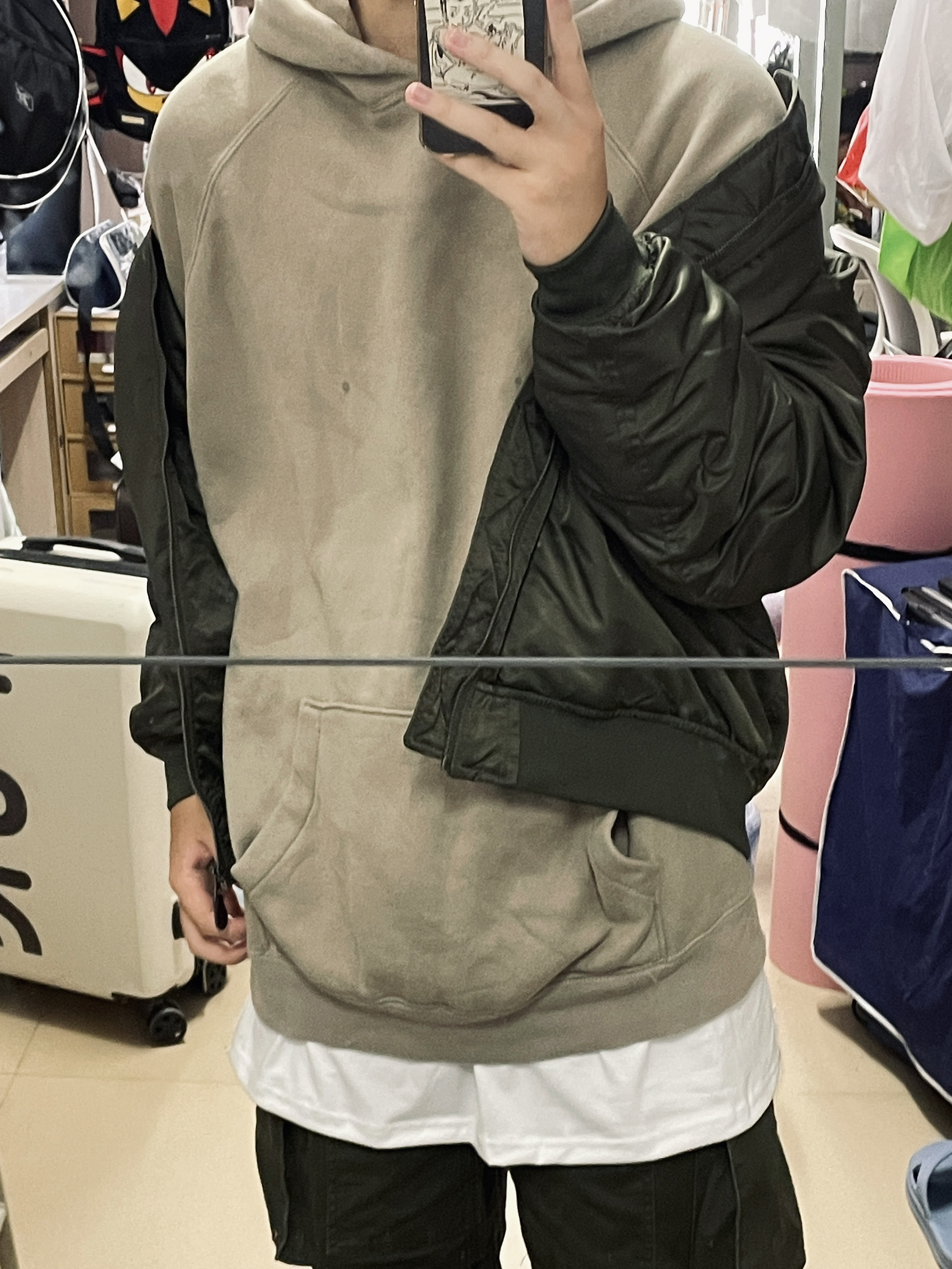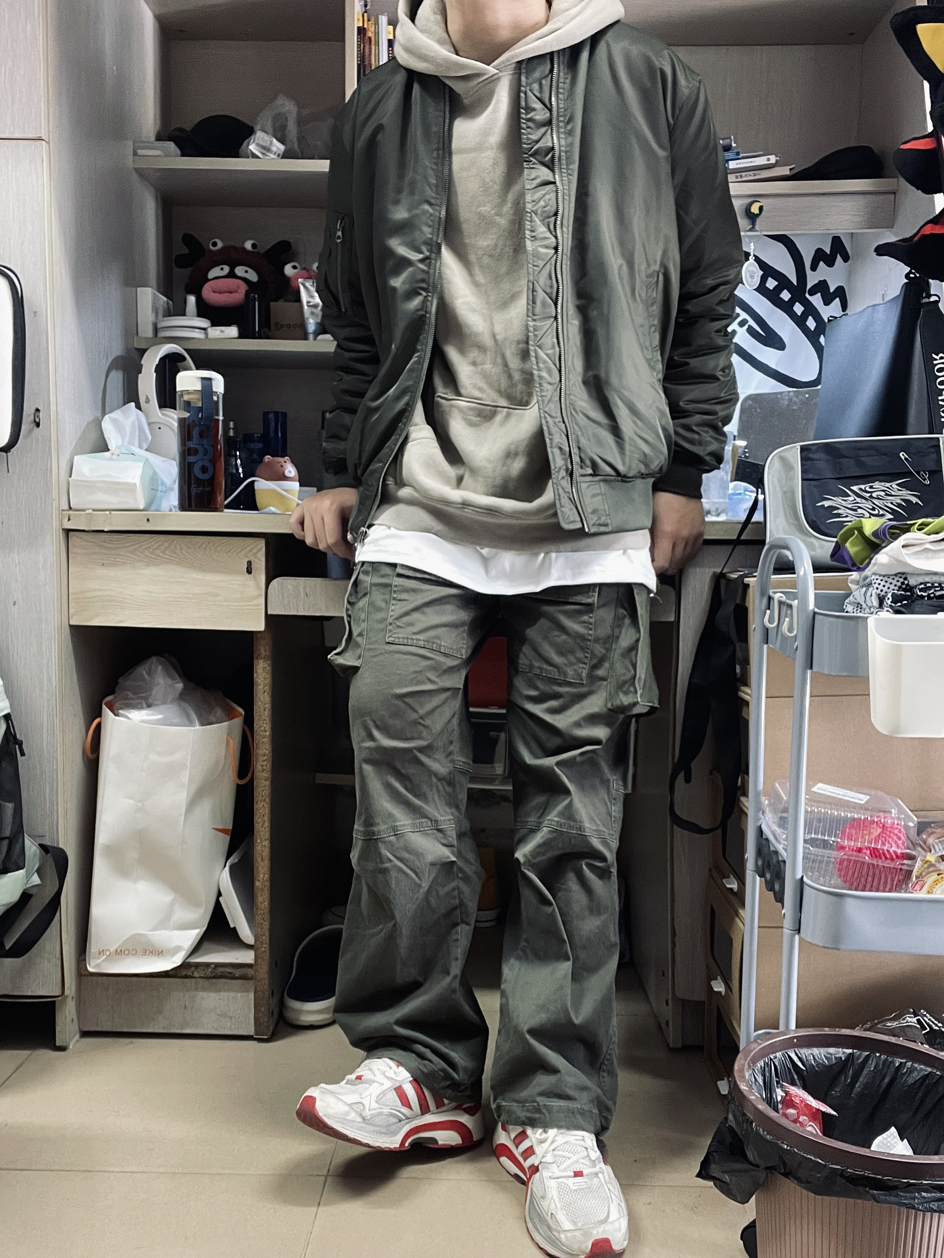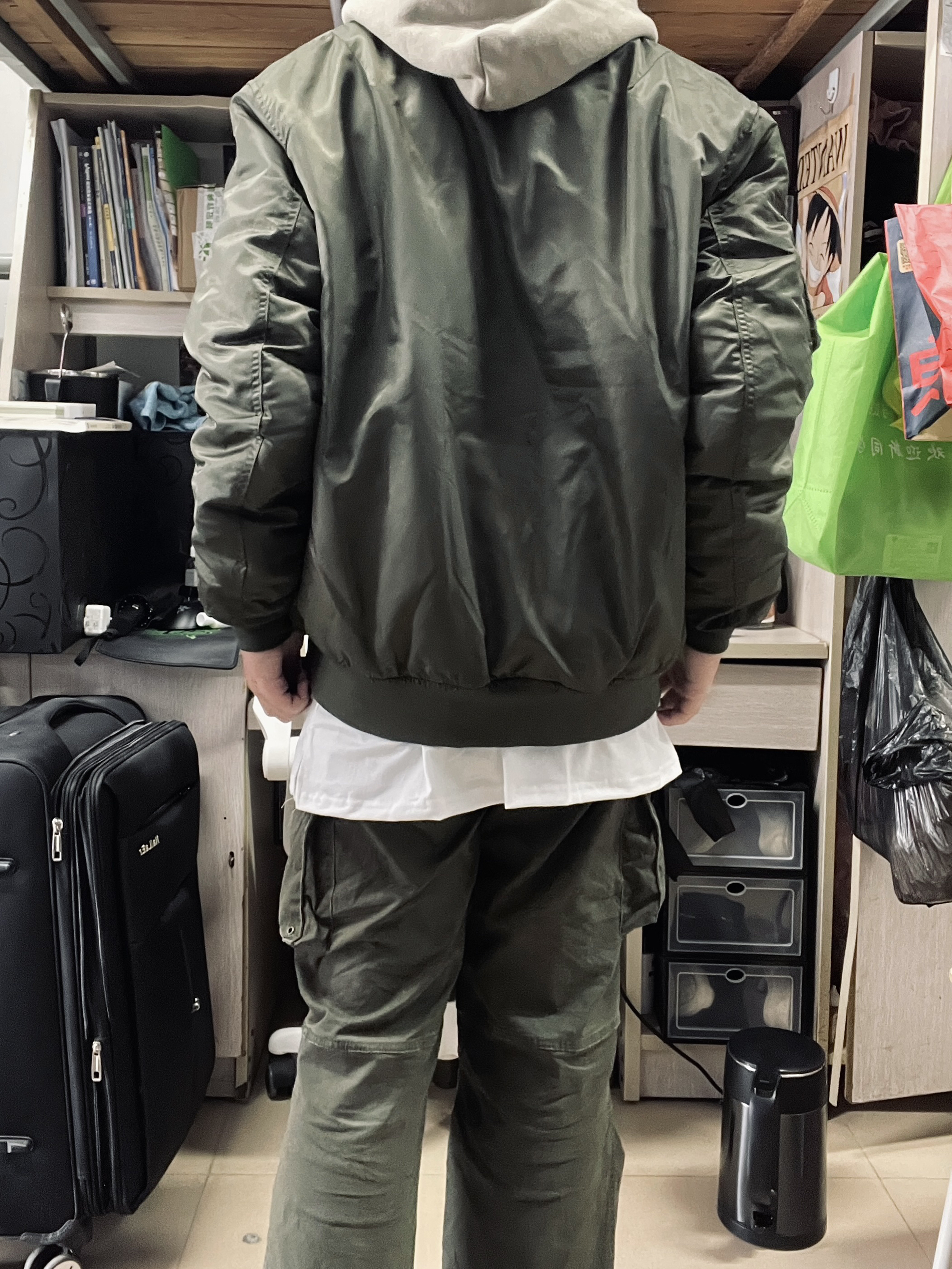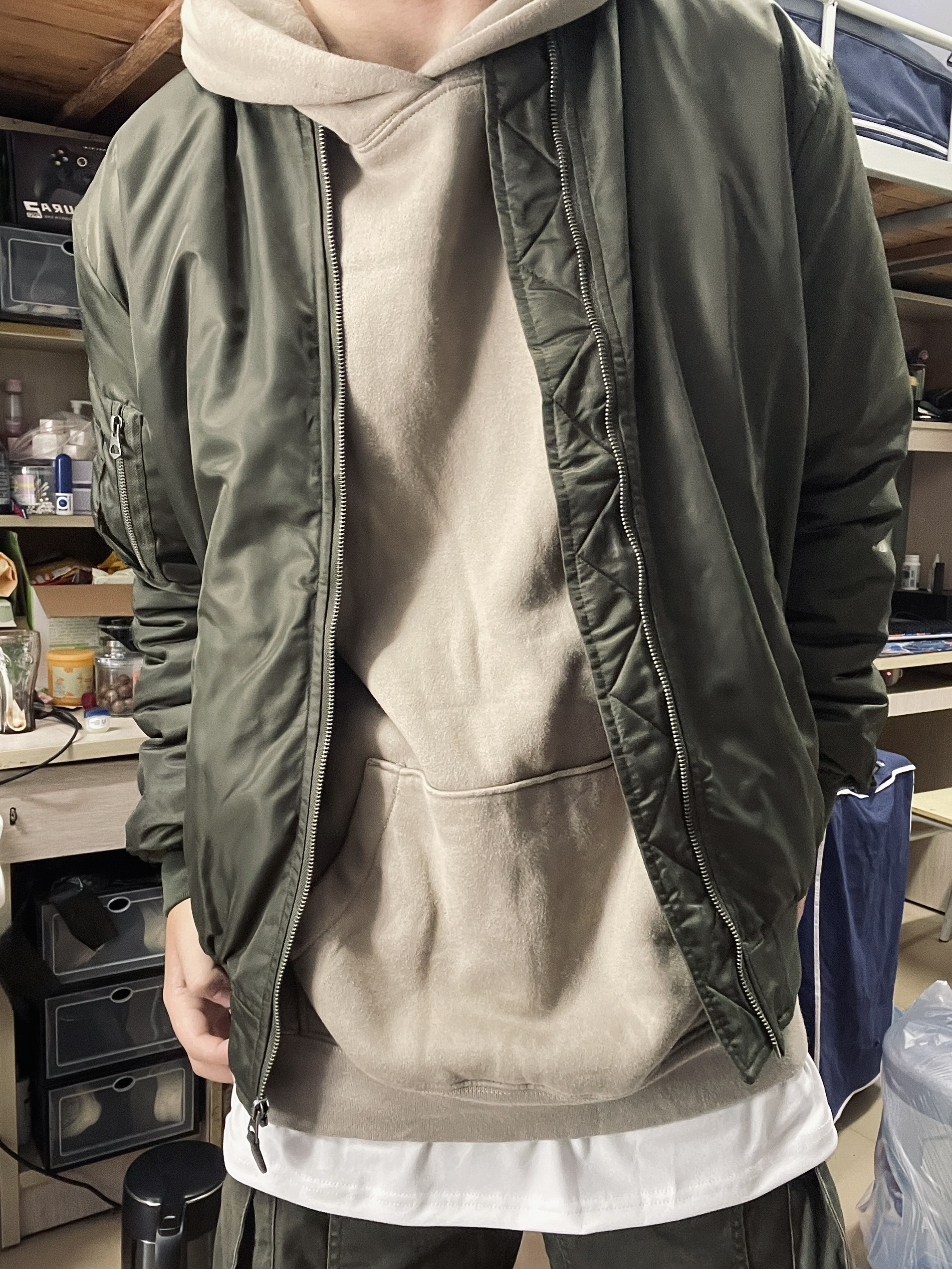u家399夹克的平替款被我找到了😭夹棉的夹克非常保暖😆做工也很好 ykk拉链 衣服找不到线头!! 绿色的夹克内搭灰绿色卫衣和白t 丰富了穿搭的层次感 下装的绿色工装裤统一了整体颜色👍这一身也太帅了吧😭