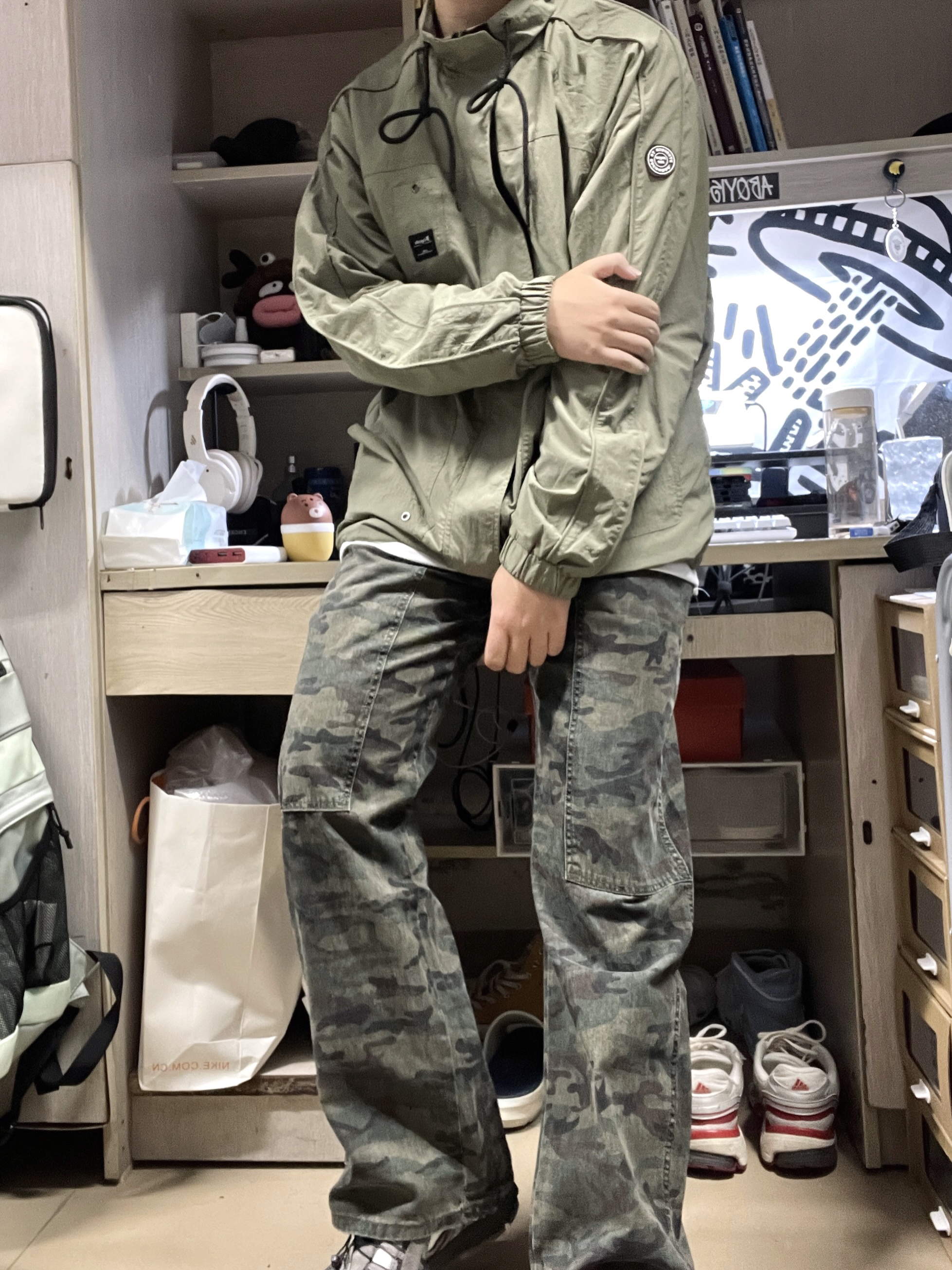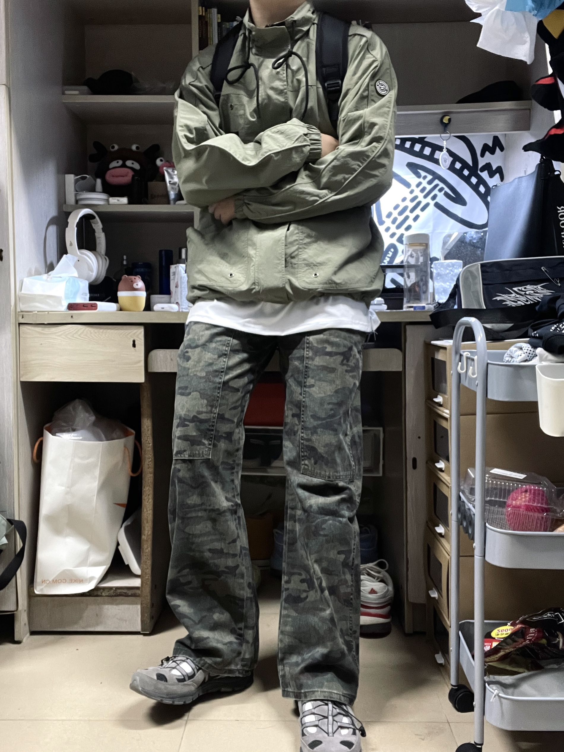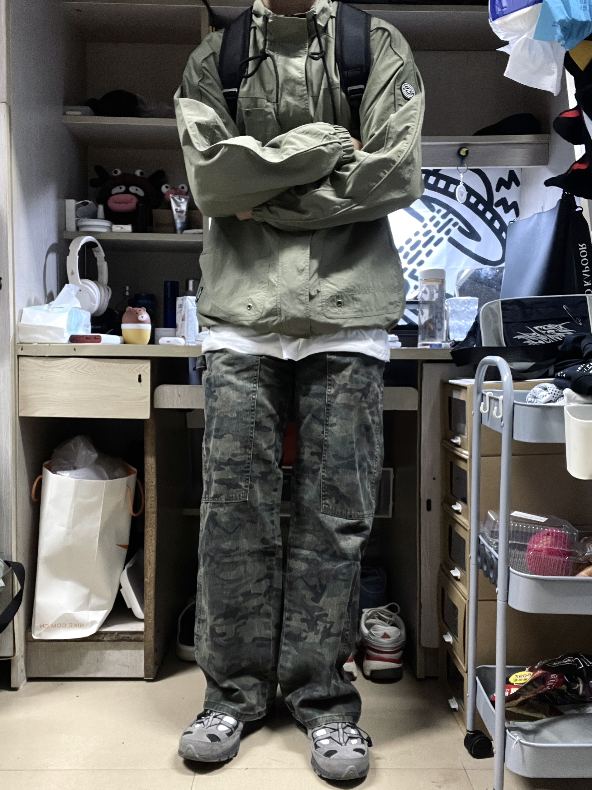出去玩当然要穿轻薄有型的冲锋衣啦⭐️ 军绿色冲锋衣版型真的很好!!因为不是亮绿色所以黄黑皮也可以驾驭的很帅‼️ 内搭白t可以丰富穿搭的层次感噢🤩 迷彩裤今年真的非常流行 这条料子很厚实 稍微水洗的迷彩更帅了🥵 来不及说了!穿上这套跟我去爬山🏃