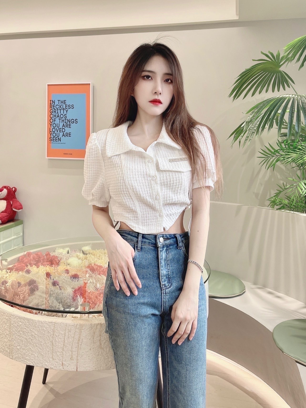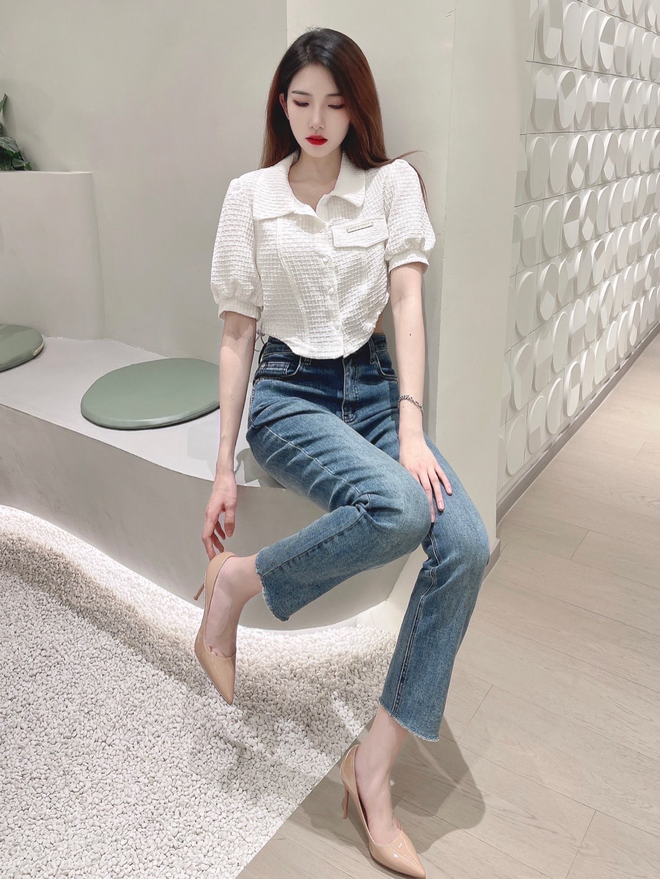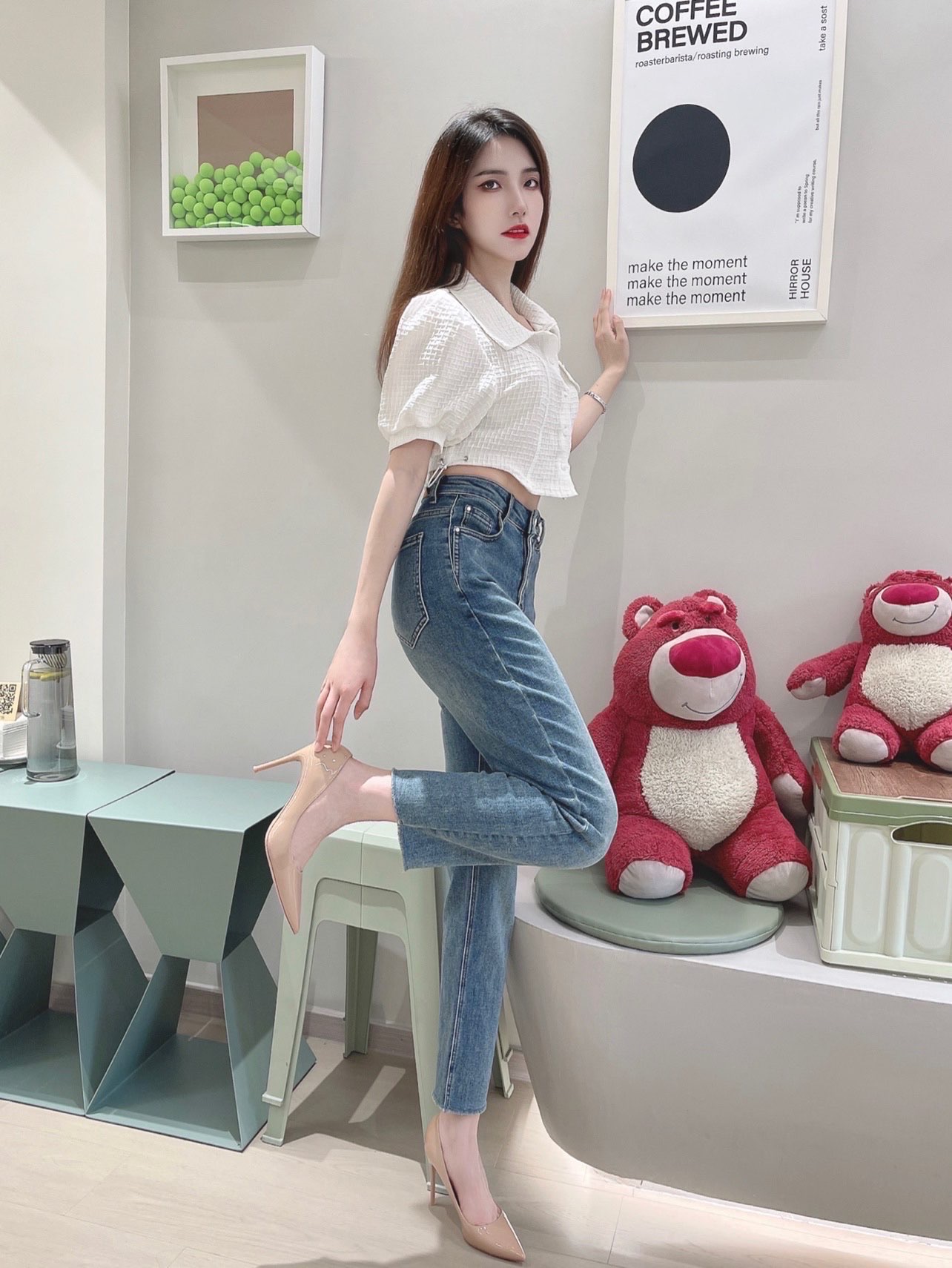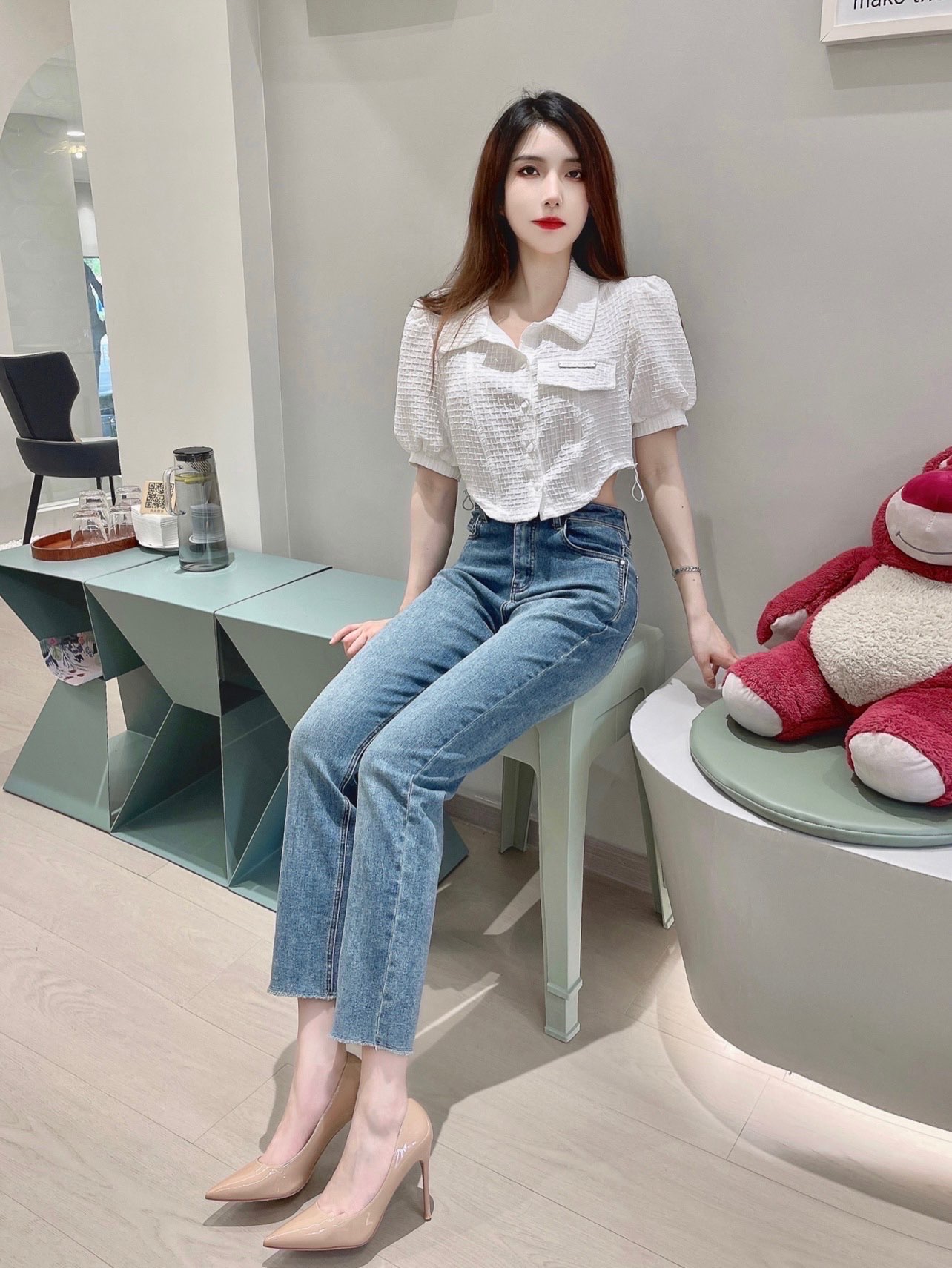尝试一下牛仔裤👖➕高跟鞋👠的搭配 烟管法棍九分裤搭配裸色高跟鞋 上衣搭配简单大方的短款白色衬衫 很拉长身材比例的通勤搭配 简单大方又温柔优雅 初秋必不能错过的穿搭喔~ #我的换季穿搭 #换季购物分享 #职场通勤这么穿