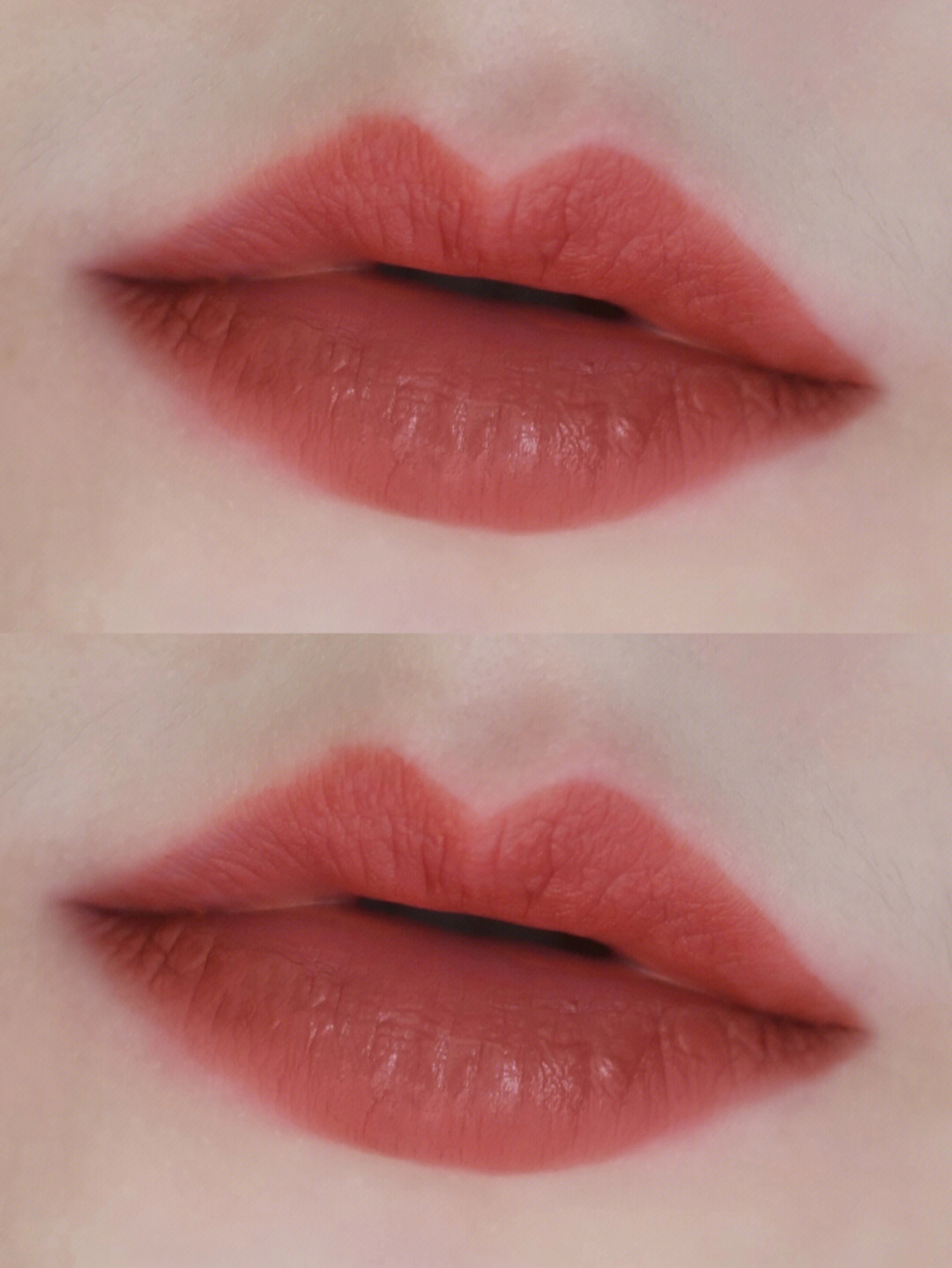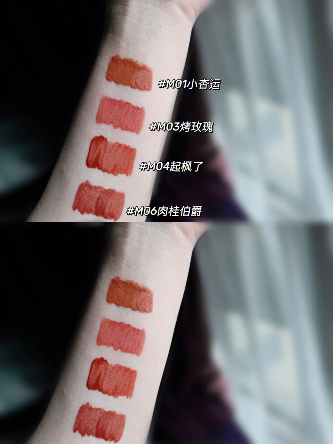 这次试色的是橘朵水雾唇釉 上嘴的是m03烤玫瑰 比较元气的一个色号 唇釉涂抹在嘴上一开始是水状转雾状 显色度ok 不沾杯 秋冬氛围感妥妥拿捏住了 无滤镜口红试色 我的口红日记