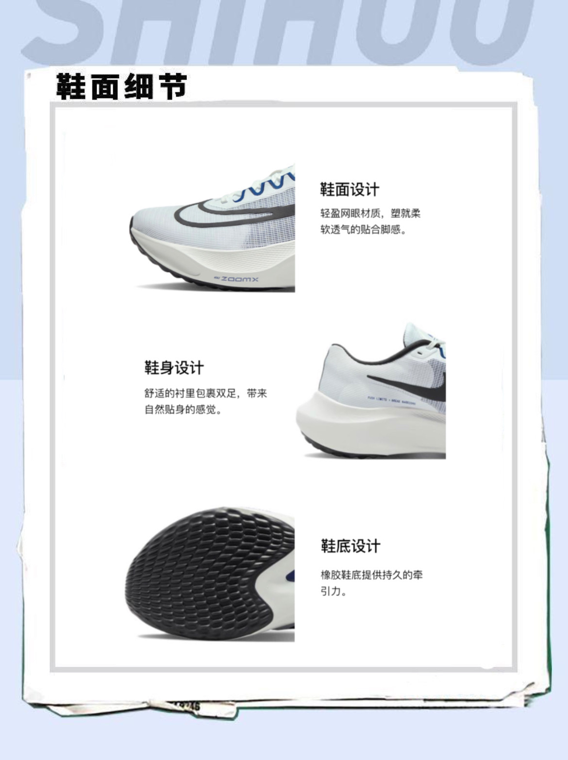 👟名称:Nike Zoom Fly5 🔍定位:缓震稳定系超慢跑鞋 🏃实际感受(缓震/包裹/抓地力): 鞋面:上层梭织内层贾卡,透气性不是特别好。用料像慢跑鞋。尺码标准但包裹不算好。后跟海绵填充不多鞋带孔的位置靠前因此鞋口很松,必须拉紧最后一个鞋带孔,整个鞋面貌似质感不错。 中底:外围了sr02。中底和鞋垫都是碎的zoomx材料。对比原生zoomx变化不大,脚感软弹,但形变量降低zoomfly5内部...