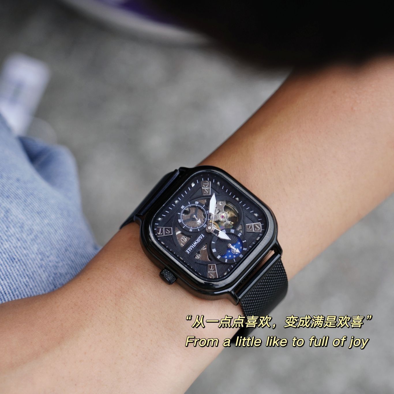 本篇笔记关联了Mark Fairwhale/马克华菲 正方形防水夜光精钢网带陀飞轮镂空自动机械男士手表 黑壳黑面黑网带 等商品,为用户提供真实的使用体验和购买参考。