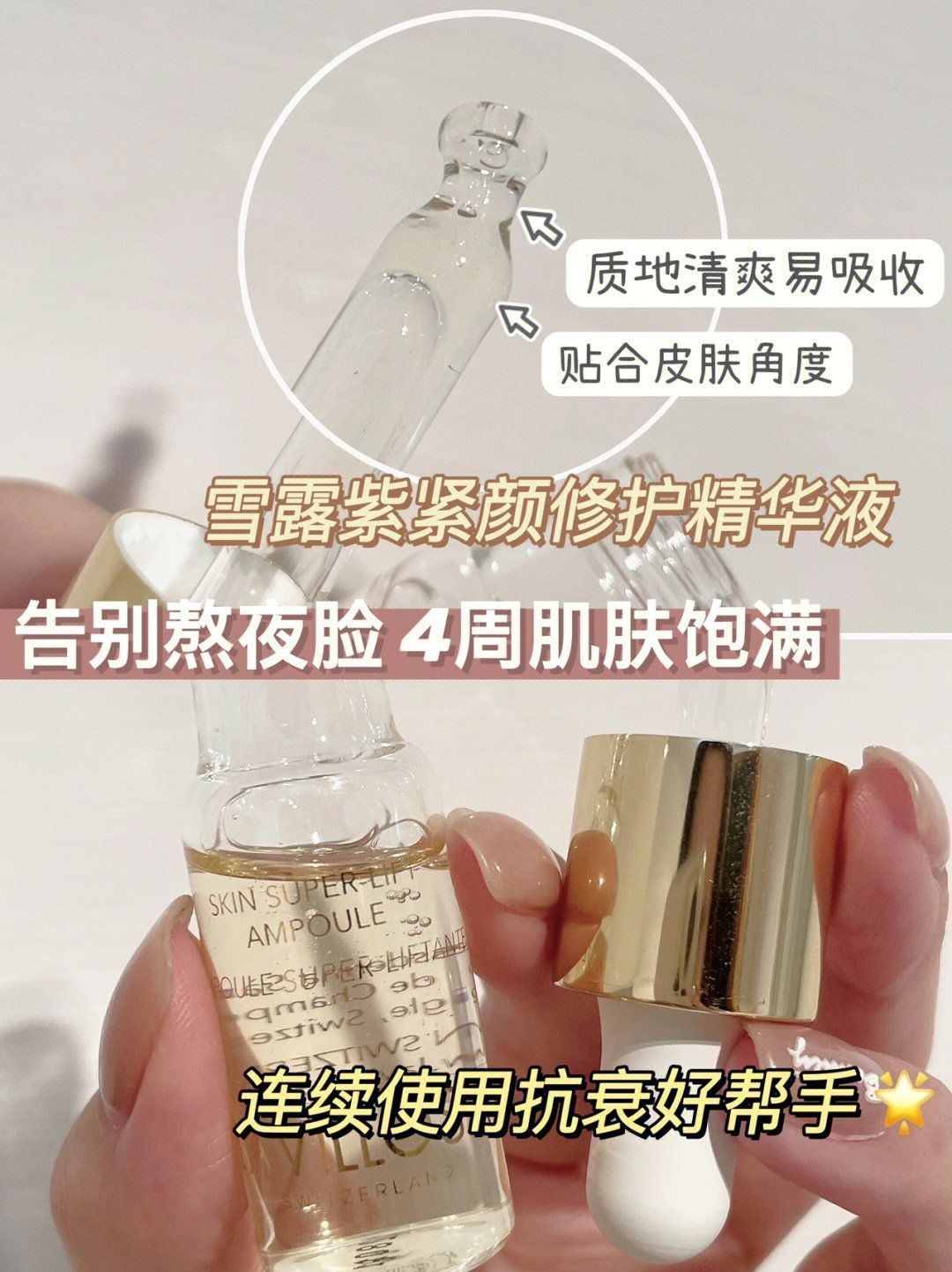 换季敏感对于油皮来讲真的是个大问题 每次都要各种折腾 这次我就给大家分享我在换季的时候,油皮敏感肌会用的好物 雪露紫精华液清透不黏腻,肌肤吸收快,使用后第二天肌肤弹嫩光滑,抚平干燥起皮,急救效果明显。 采用安瓶精华,帮助提拉肌肤、屏障修护,减少皱纹 含有烟酰胺帮助美白 积雪草提取物镇静修复 乙酰基六肽-8帮助肌肤补水保湿 不仅可以在补水保湿的基础上抗衰,换季敏感的季节用它也可以!