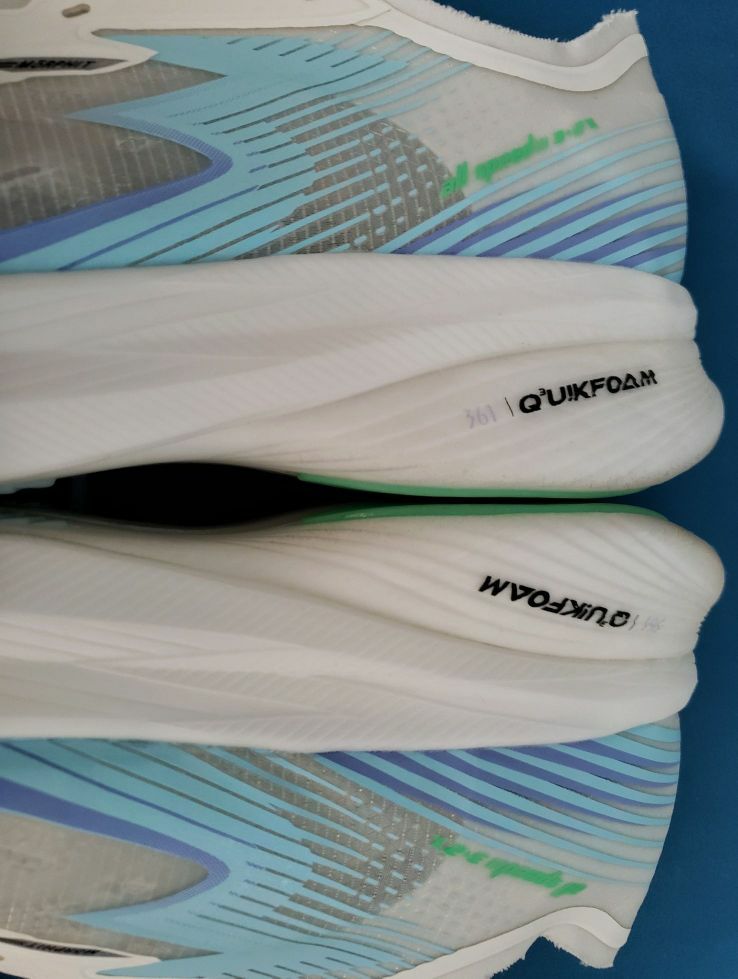 碳板位置偏上靠近足部。 脚感软弹,碳板上方泡棉容易被踩实,下方澎湃依旧。 稳定性差,非前掌跑法勿入。 鞋楦很迷。