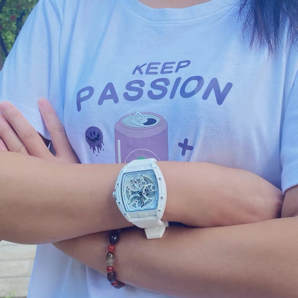 这款手表休闲又百搭,戴在手上很有质感,开学 季或者男朋友的生日时,送给男朋友当开学季礼 物或者生日礼物,男朋友一定很开心,应该不会有男生可以抵抗这种机械的魅力吧,我的腕围是13cm,试戴一下也很好看呢, 图源网络侵删