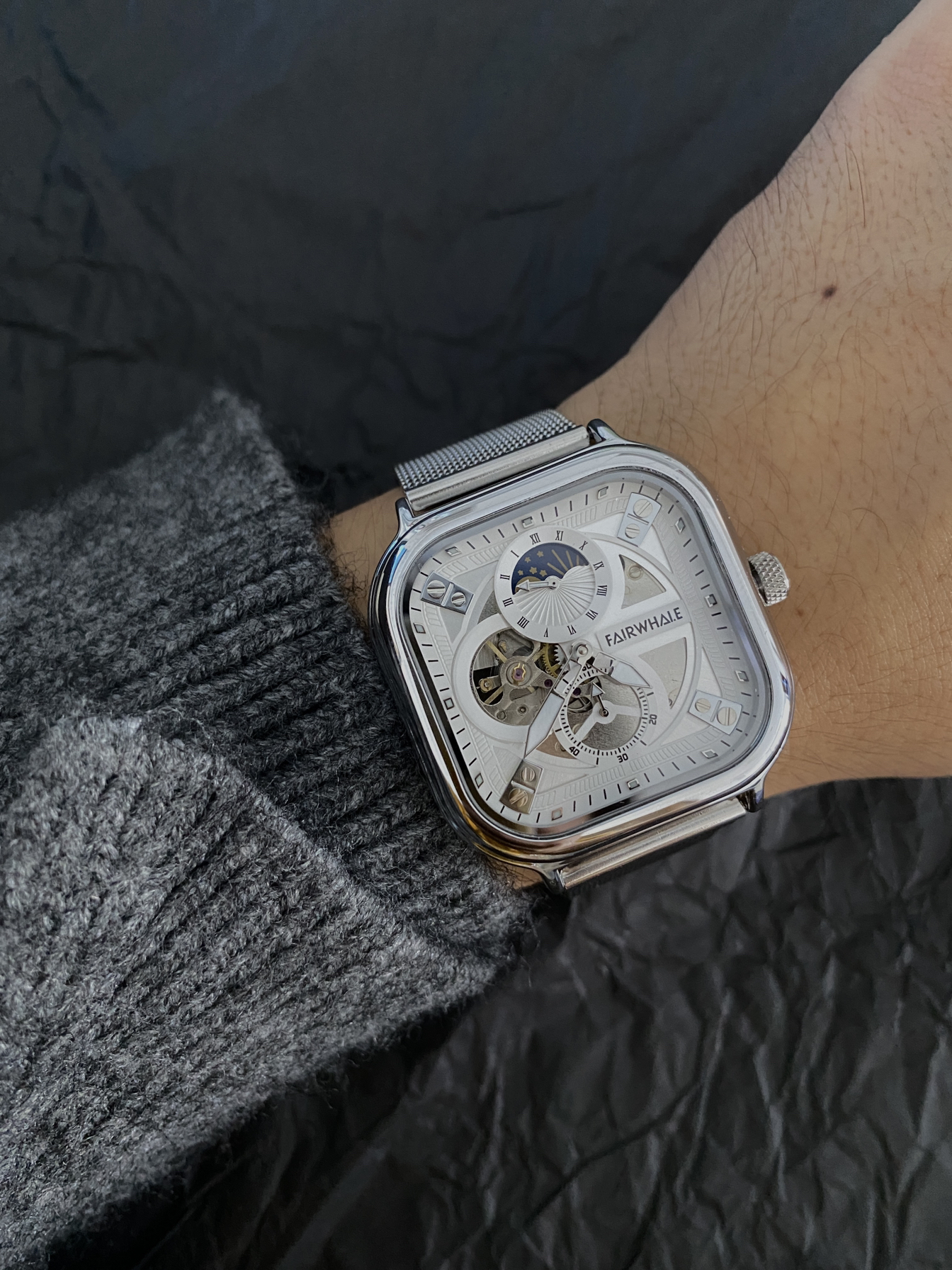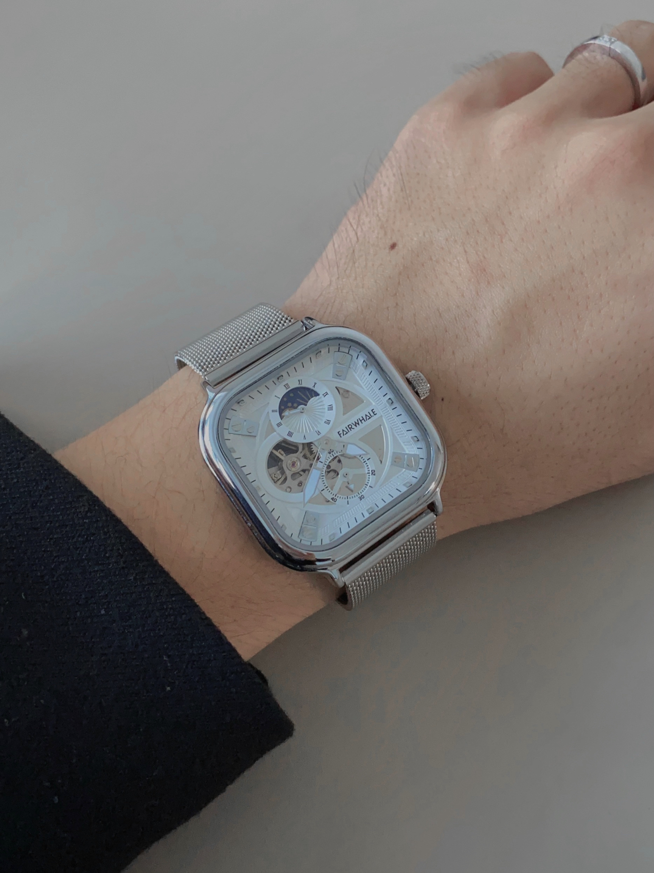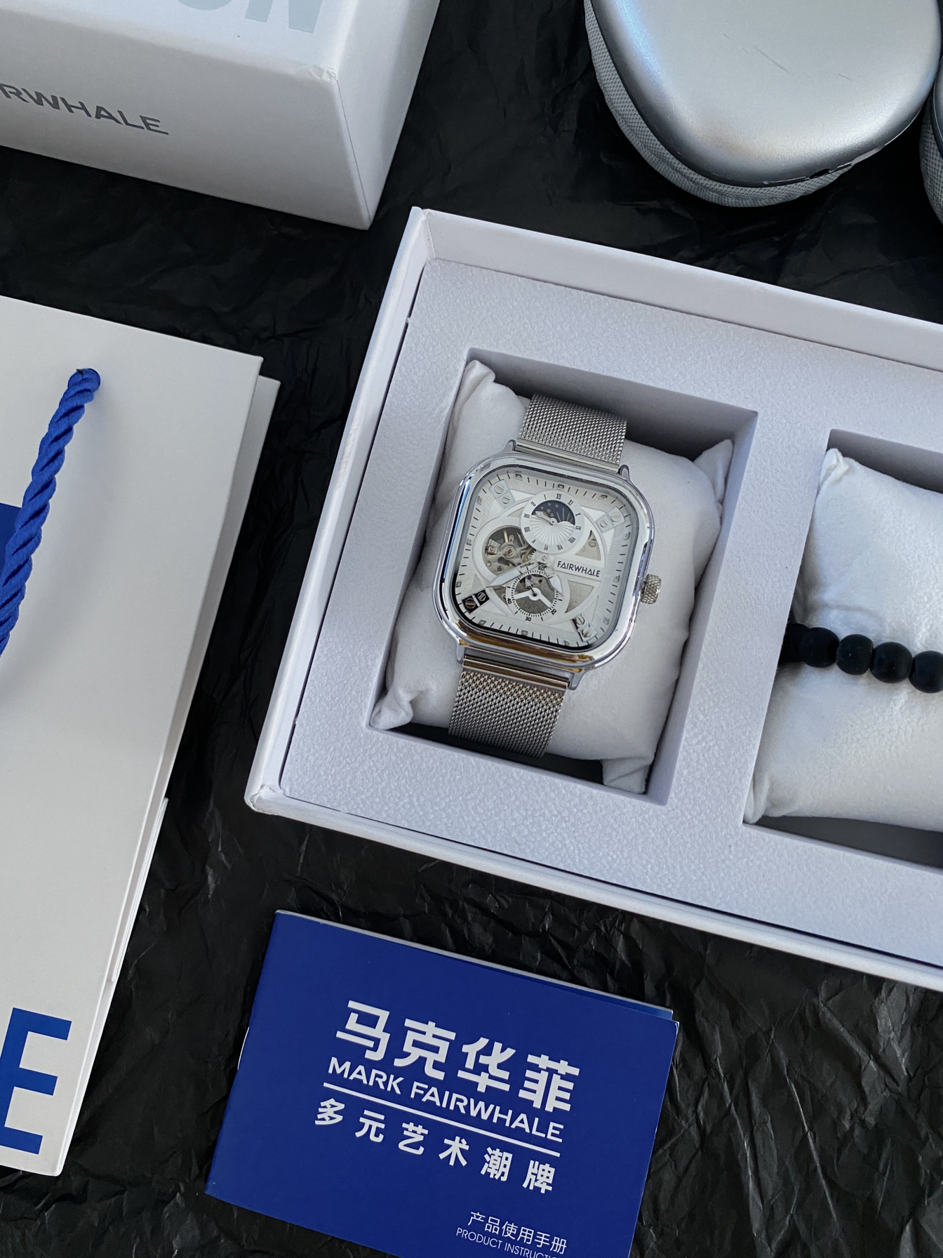 本篇笔记关联了Mark Fairwhale/马克华菲 正方形防水夜光精钢网带陀飞轮镂空自动机械男士手表 银壳白面银网带 等商品,为用户提供真实的使用体验和购买参考。