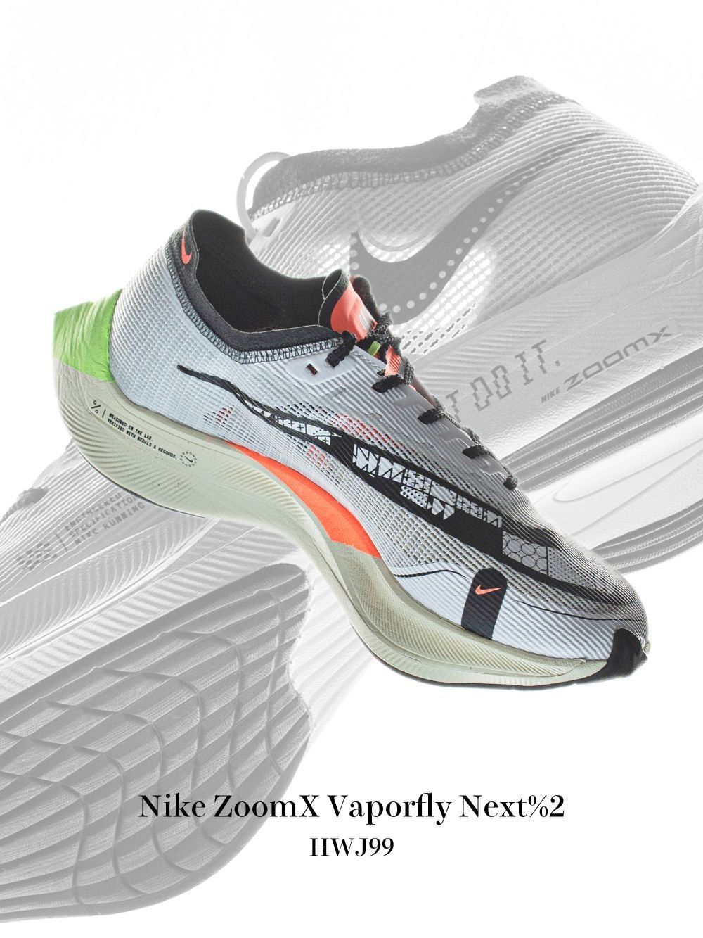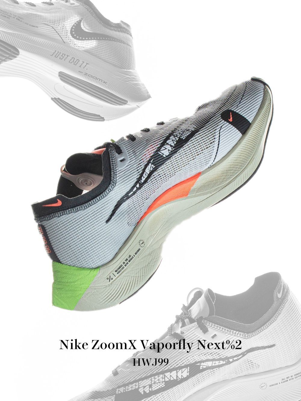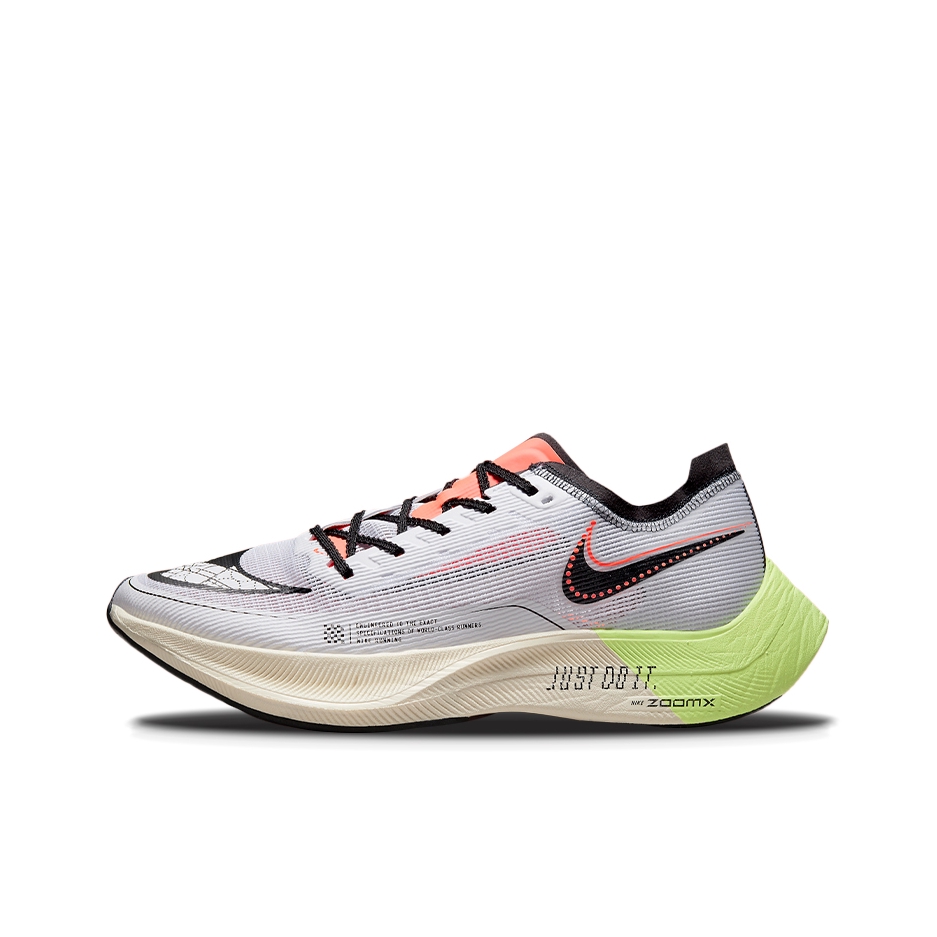 Nike ZoomX Vaporfly Next% 2 低帮灰橙 首先整款鞋拿在手上是非常轻盈的,上脚最直观的感受就是轻弹,很有跑步的欲望。 鞋子的鞋面采用了白色极轻的ATOMKNIT搭配一系列黑色细节,前掌加大swoosh标志融入一系列几何图形。 舌头沉迷于霓虹黄和橙色的色调, 在左右鞋子之间交替;久经考验的ZoomX泡棉鞋底呈现出与舌头相反的颜色。中底侧面印有“照单全做”字样。 总的来说Vap...