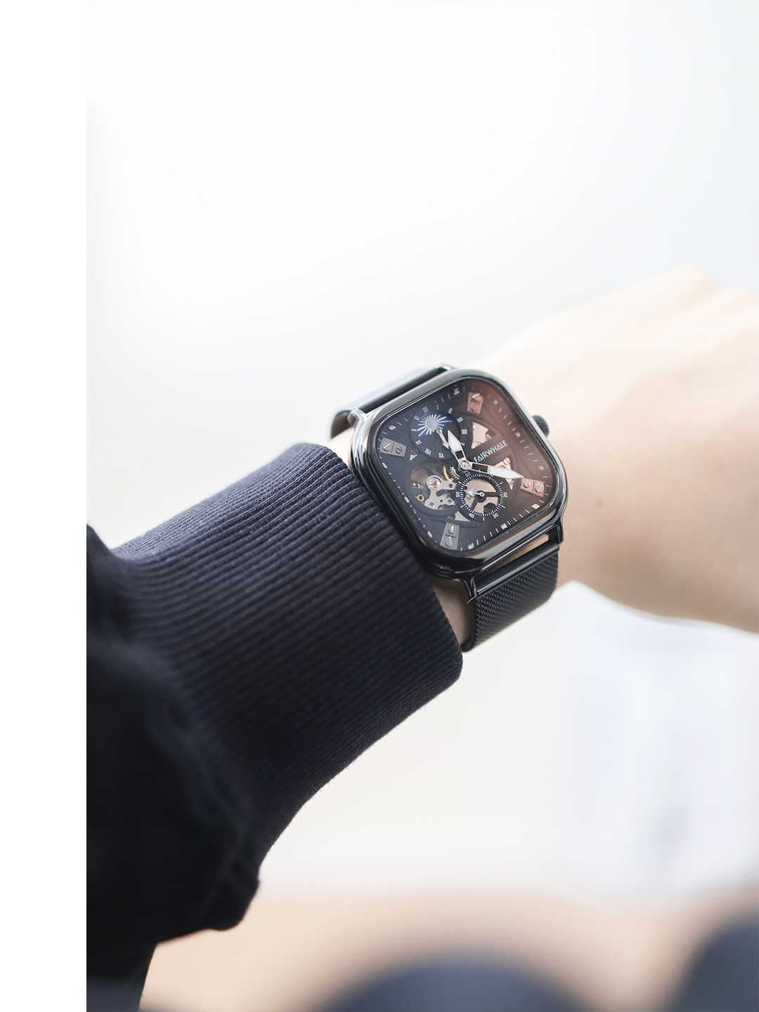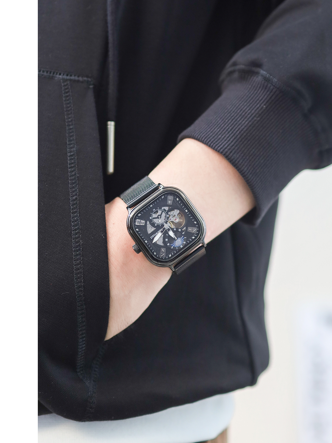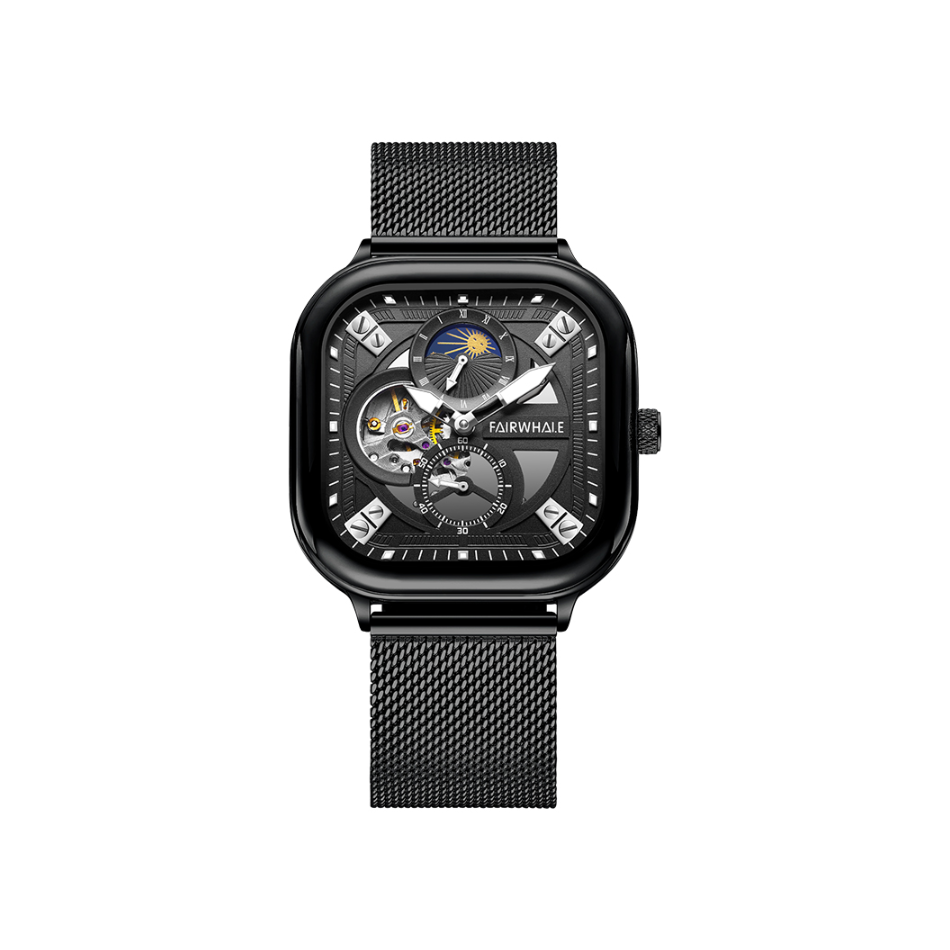 本篇笔记关联了Mark Fairwhale/马克华菲 正方形防水夜光精钢网带陀飞轮镂空自动机械男士手表 黑壳黑面黑网带 等商品,为用户提供真实的使用体验和购买参考。