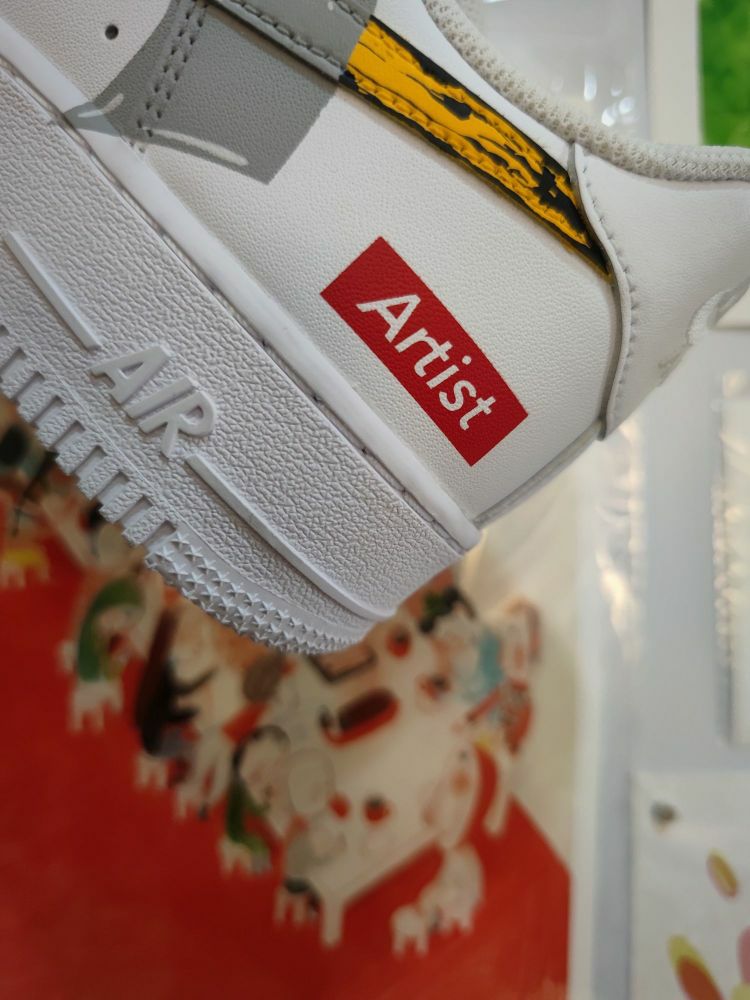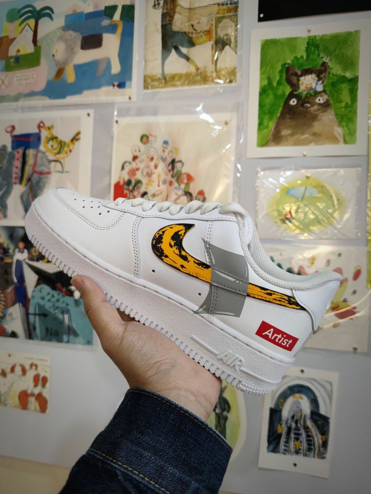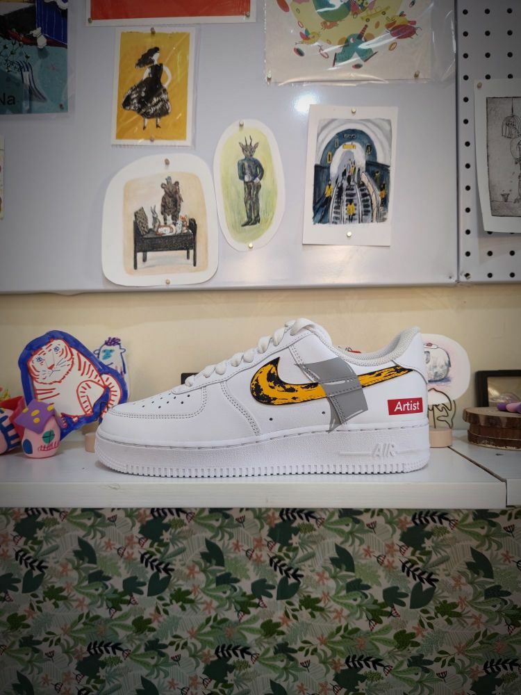 这个后跟是不是有点熟悉呢?今天我们不说那个联名,说一说艺术感的球鞋。 🍌香蕉与胶带的荒诞艺术被人津津乐道,“球鞋艺术家”往往也带有讽刺意味。 工业制品空军一号AF1遇上荒诞艺术,人人都可以是有态度有思想的艺术家 只有热爱艺术的你才懂得这双鞋的内涵。 关注我持续分享定制球鞋资讯。欢迎同学们评论区交流。