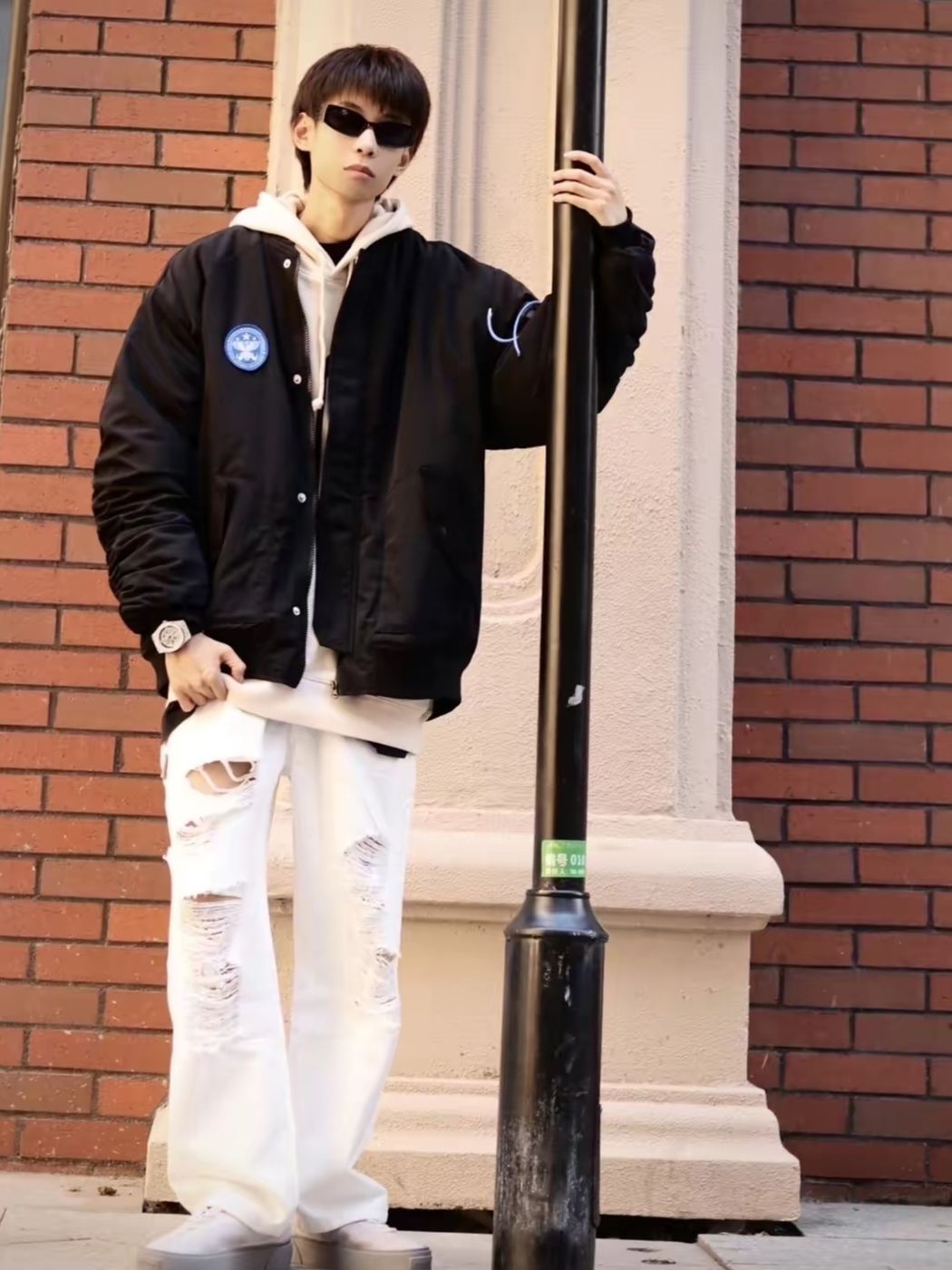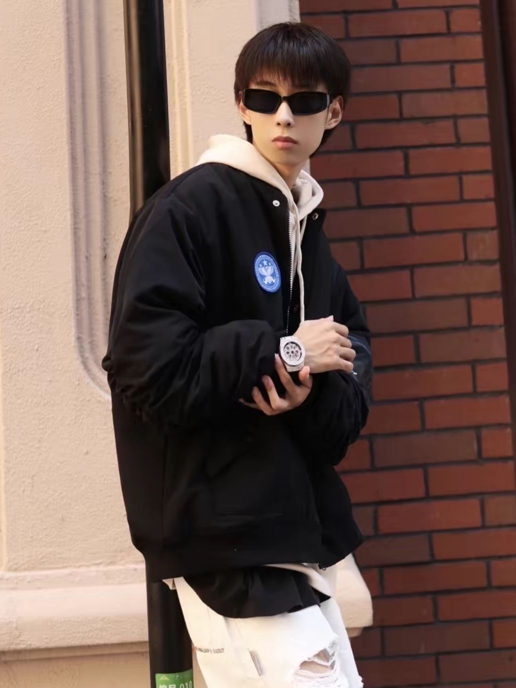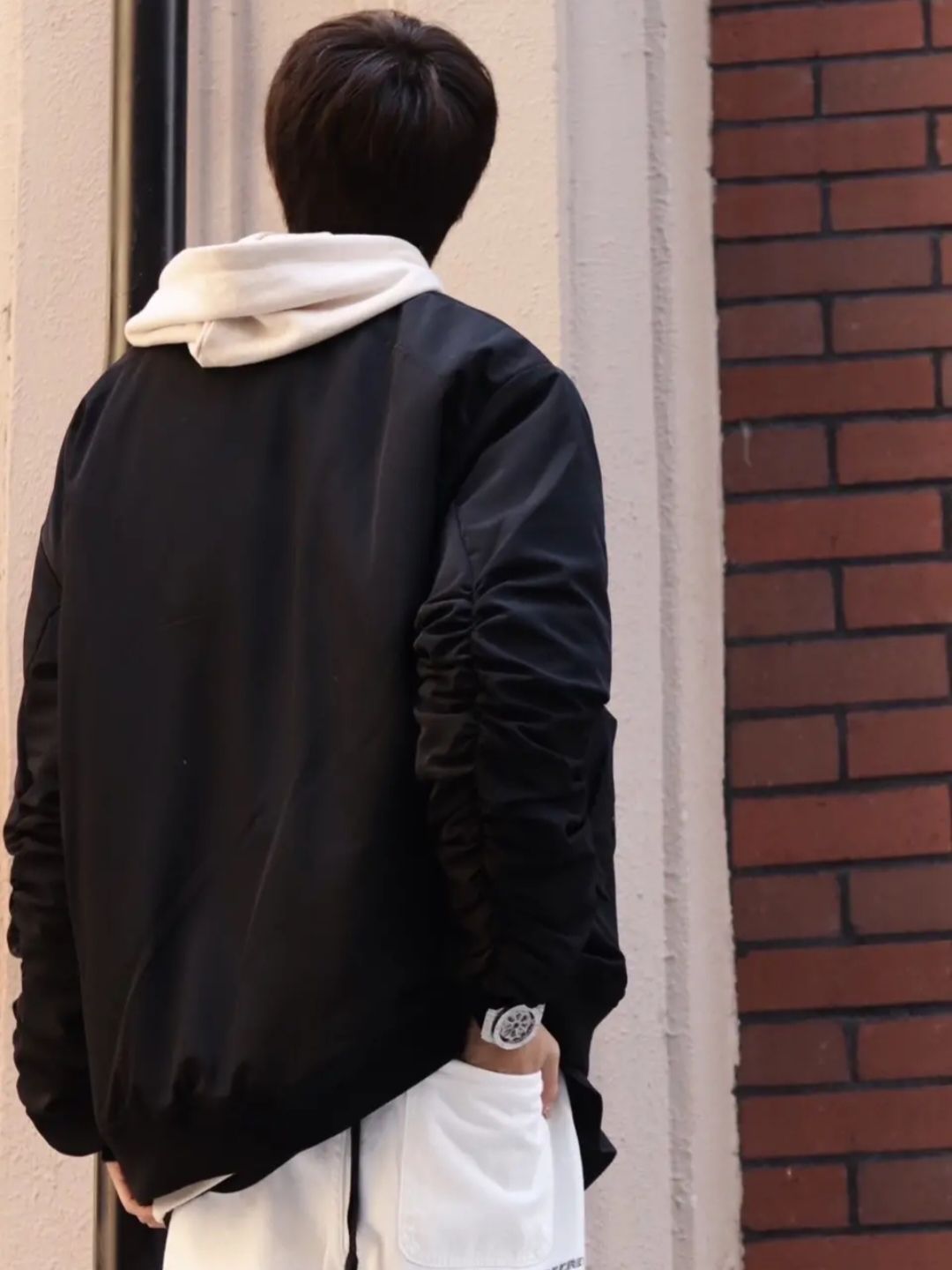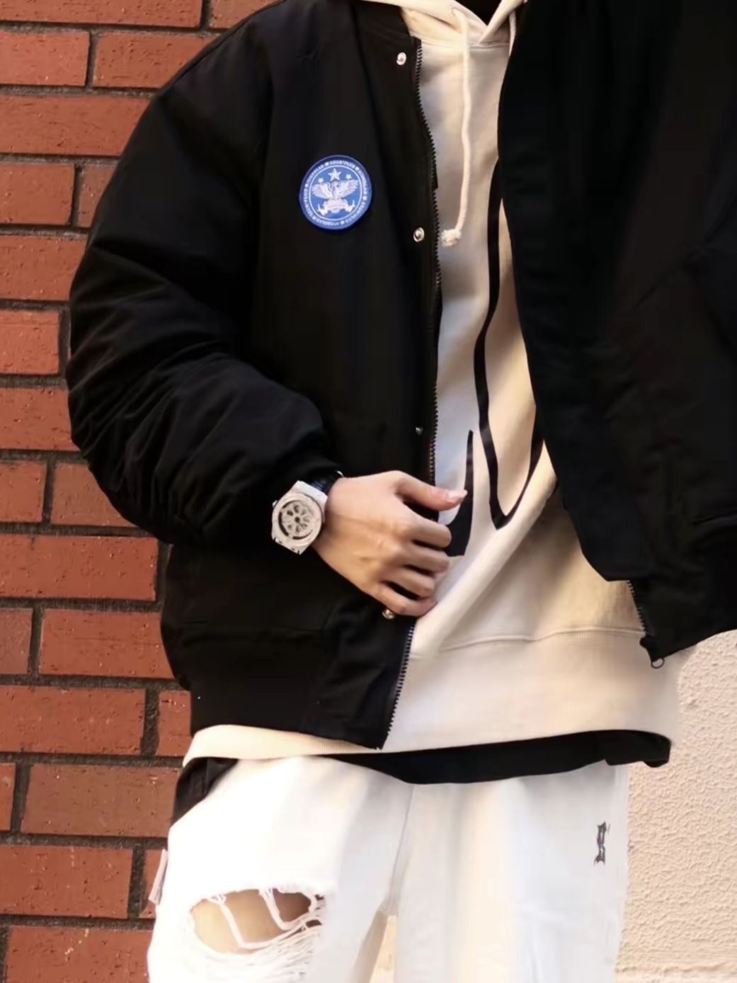 💎look:黑色夹克+浅卡其色连帽卫衣+黑色T恤内搭+白色破洞牛仔裤。 💎整体搭配就是黑+白的穿搭思路,既有层次又很帅气! 💡北方的早晚真的有凉意了,换季必须买新装,一件黑色的夹克,一定是男生衣柜最少不了的一件衣服! 💡经典的飞行夹克版型,袖子的设计是个亮点,而且还是夹棉的,可以穿到深秋和初冬,还是很实用的。