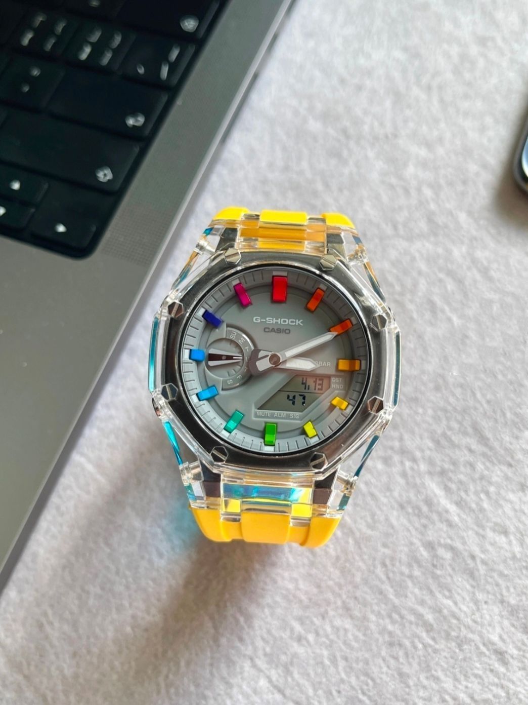 💡想要的彩虹刻度终于来了!视觉上的纯粹,潮流又百搭,整体上手非常轻便舒适。 💡VENCREW冰川系列的透明表壳与夏天无敌搭配,有机玻璃材质的表壳,不易发黄氧化,打破市面上多数的透明表壳! 💡别再盯着劳力士的彩虹迪了,农家橡树届的彩虹迪满足你期待已久的梦想! 💡手表:卡西欧GA-2100 💡配件:VENCREW冰川黄