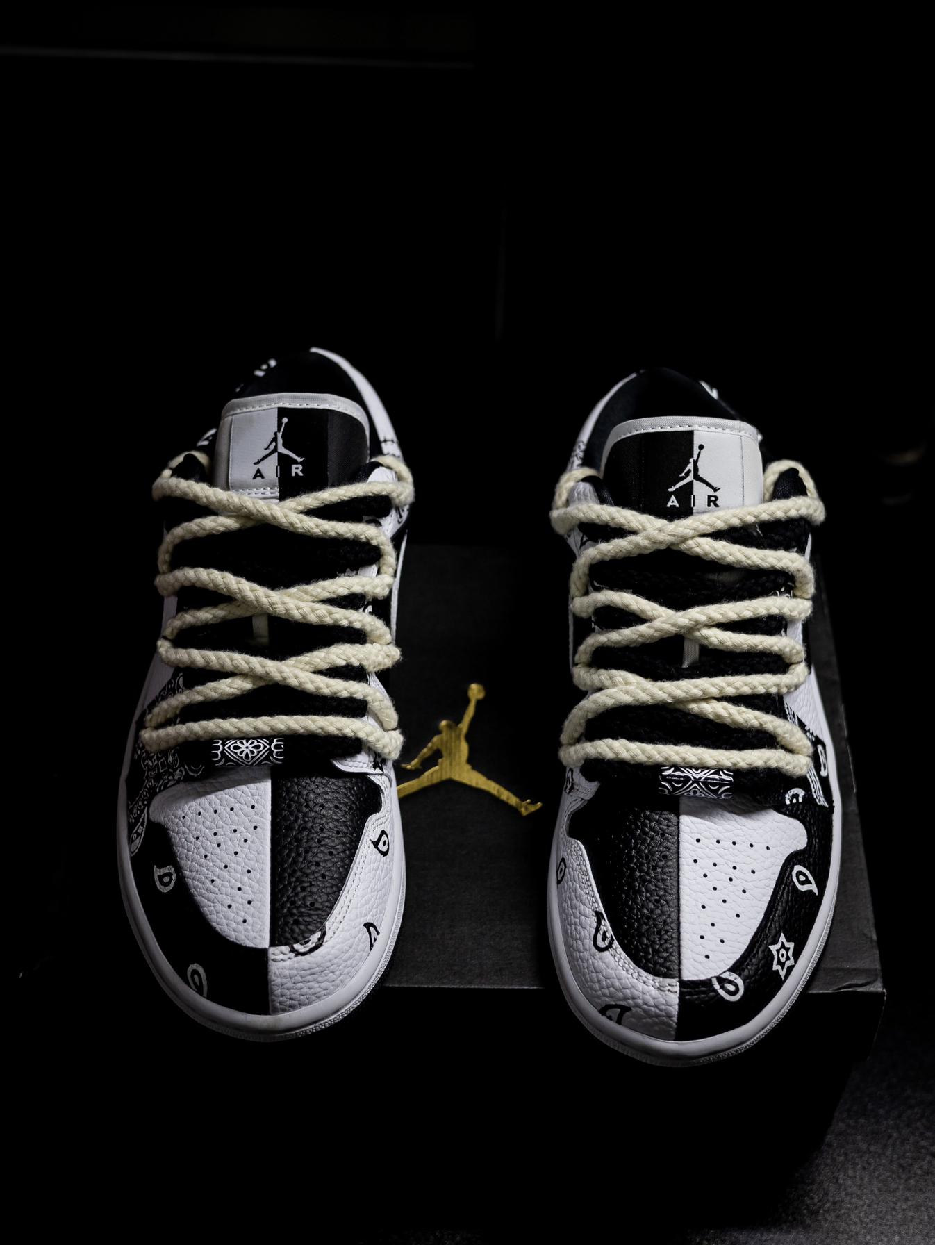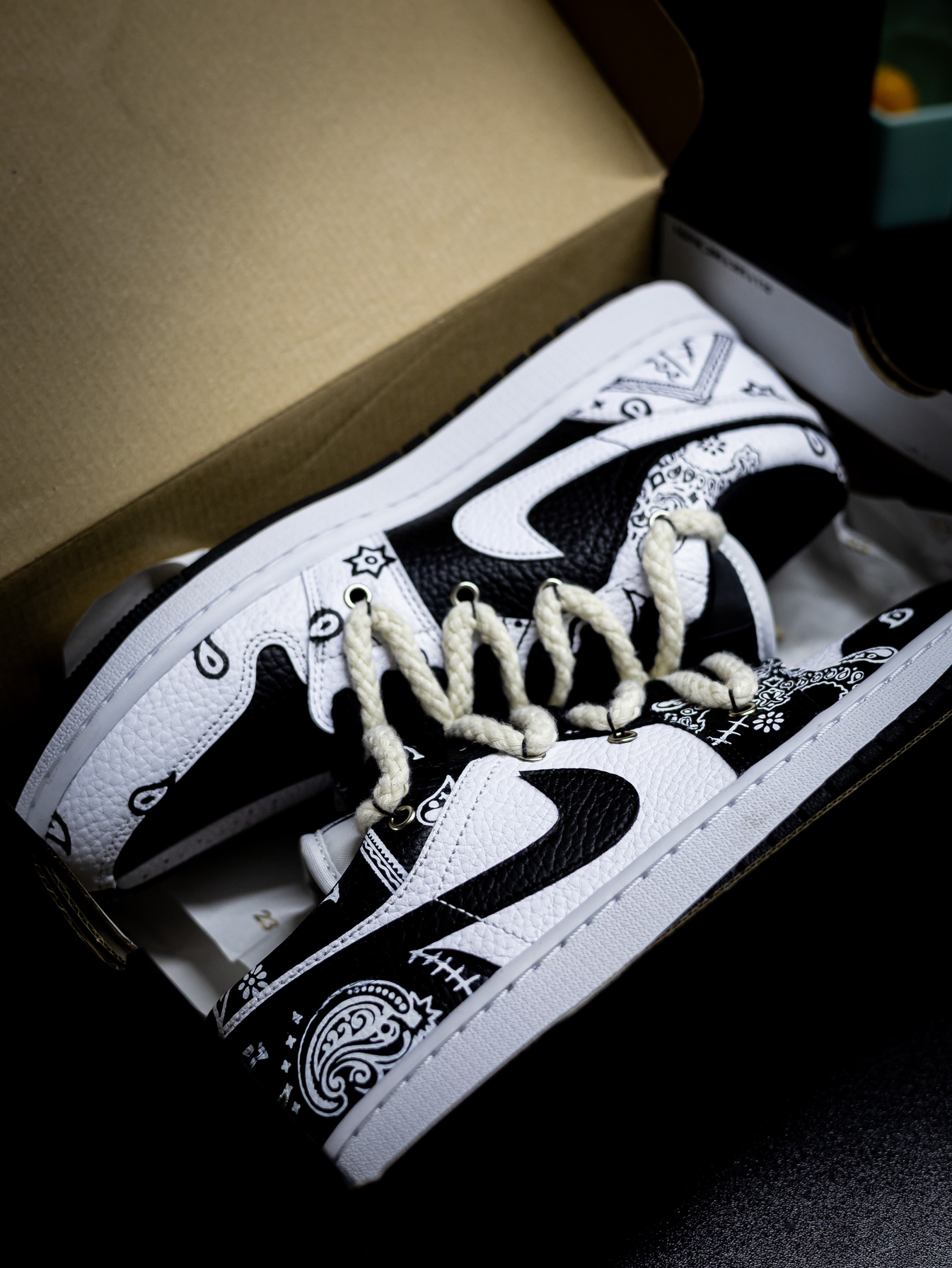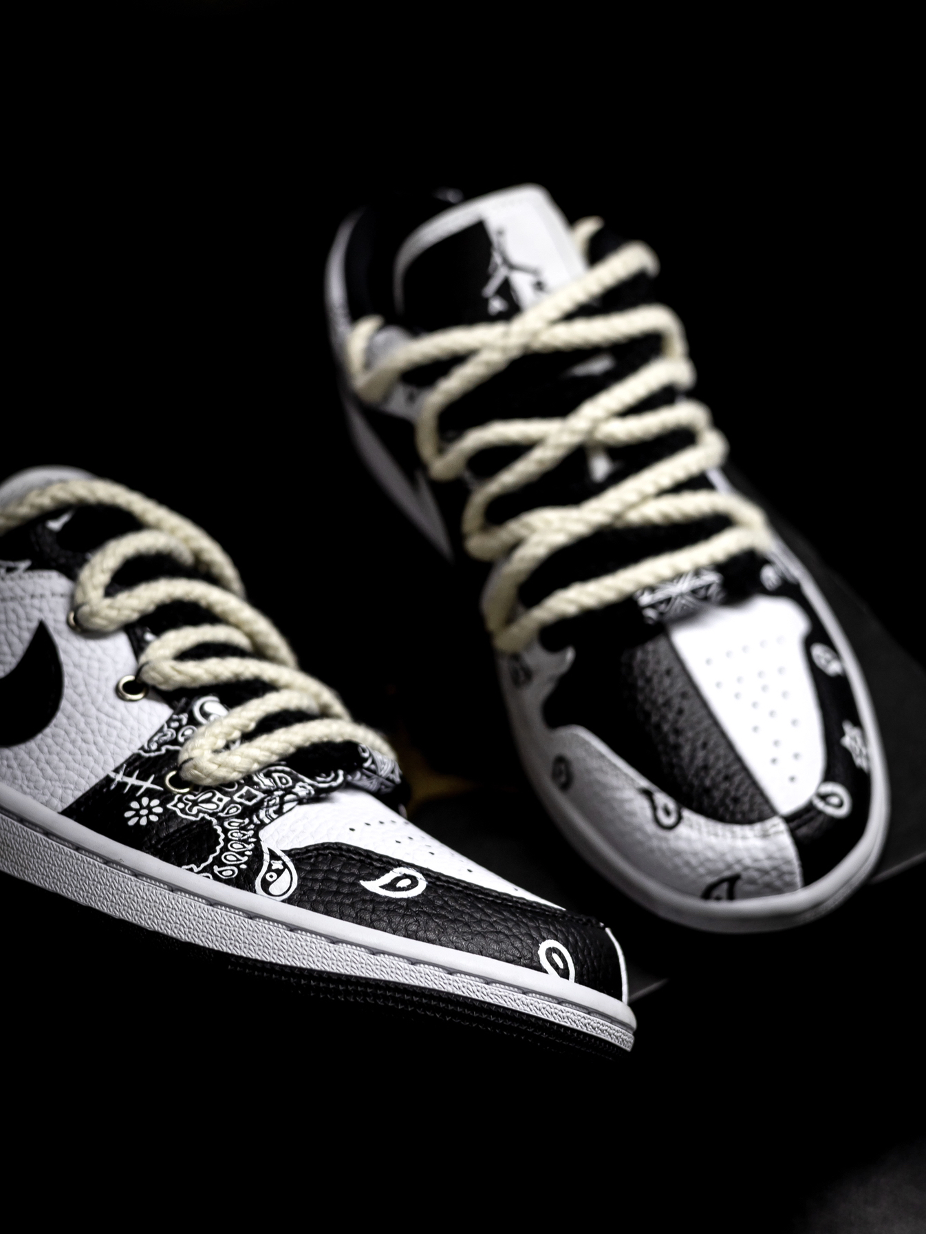 腰果花元素可以说是潮流的象征了,今天给大家分享一款非常酷帅的球鞋定制版Air Jordan 1 Low阴阳 腰果花! 鞋身以AJ1 Low 阴阳为蓝本进行改造,在鞋头及鞋身上辅以腰果花图案,非常具有潮流气息,黑白相搭配的鞋身十分独特又个性,穿在脚上辨识度极高! 鞋带部分在保留原有的基础上另外添加了一根白色粗麻绳鞋带,非常有质感!并在鞋头处加入了脏辫风格的束扣,整体搭配非常好看,穿去出街一定回头...