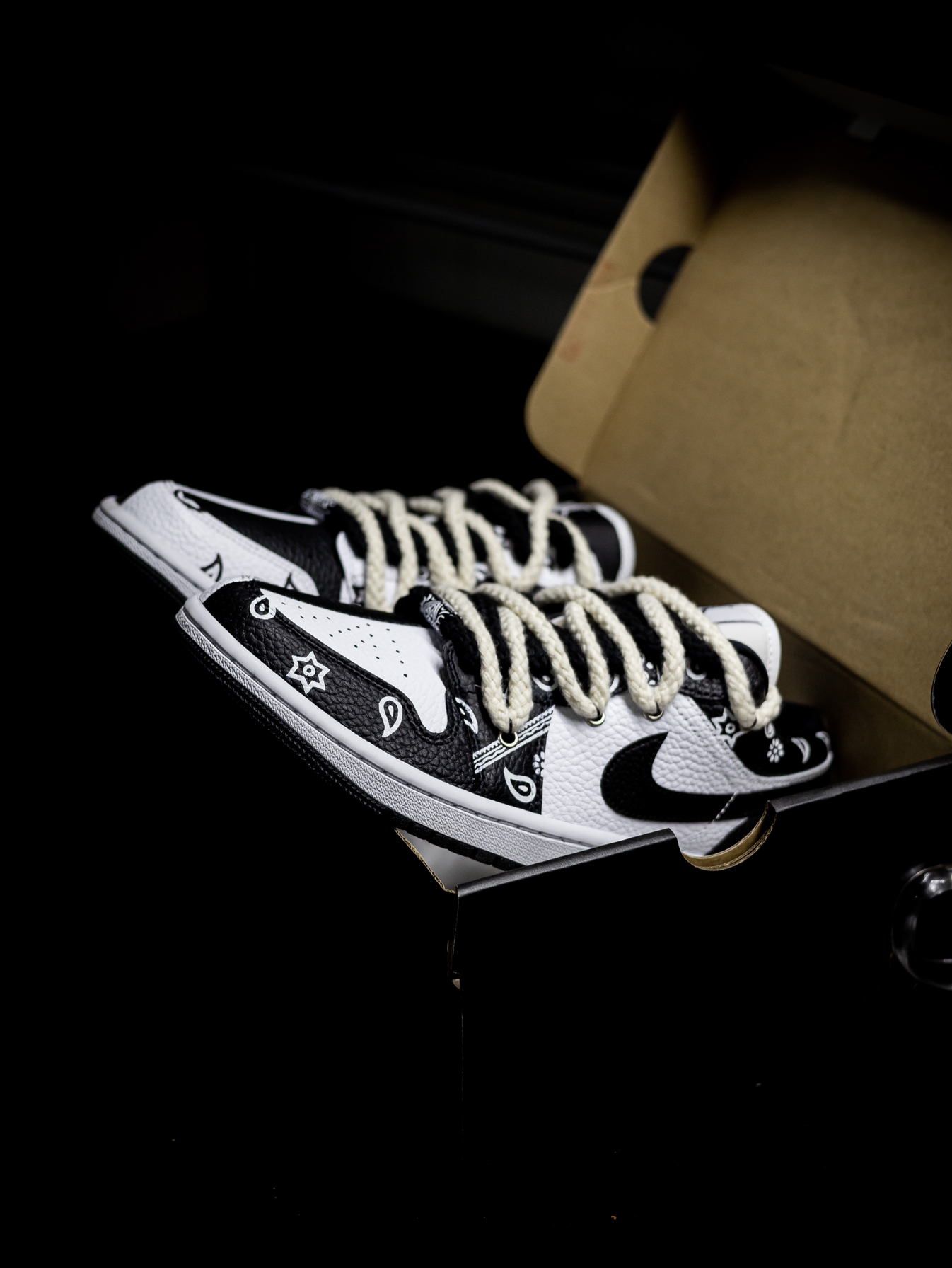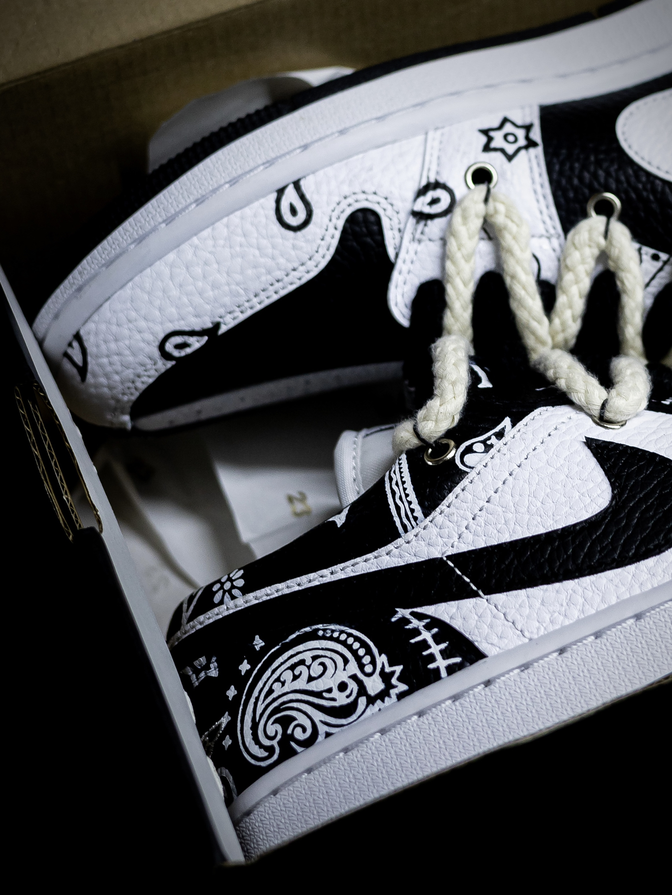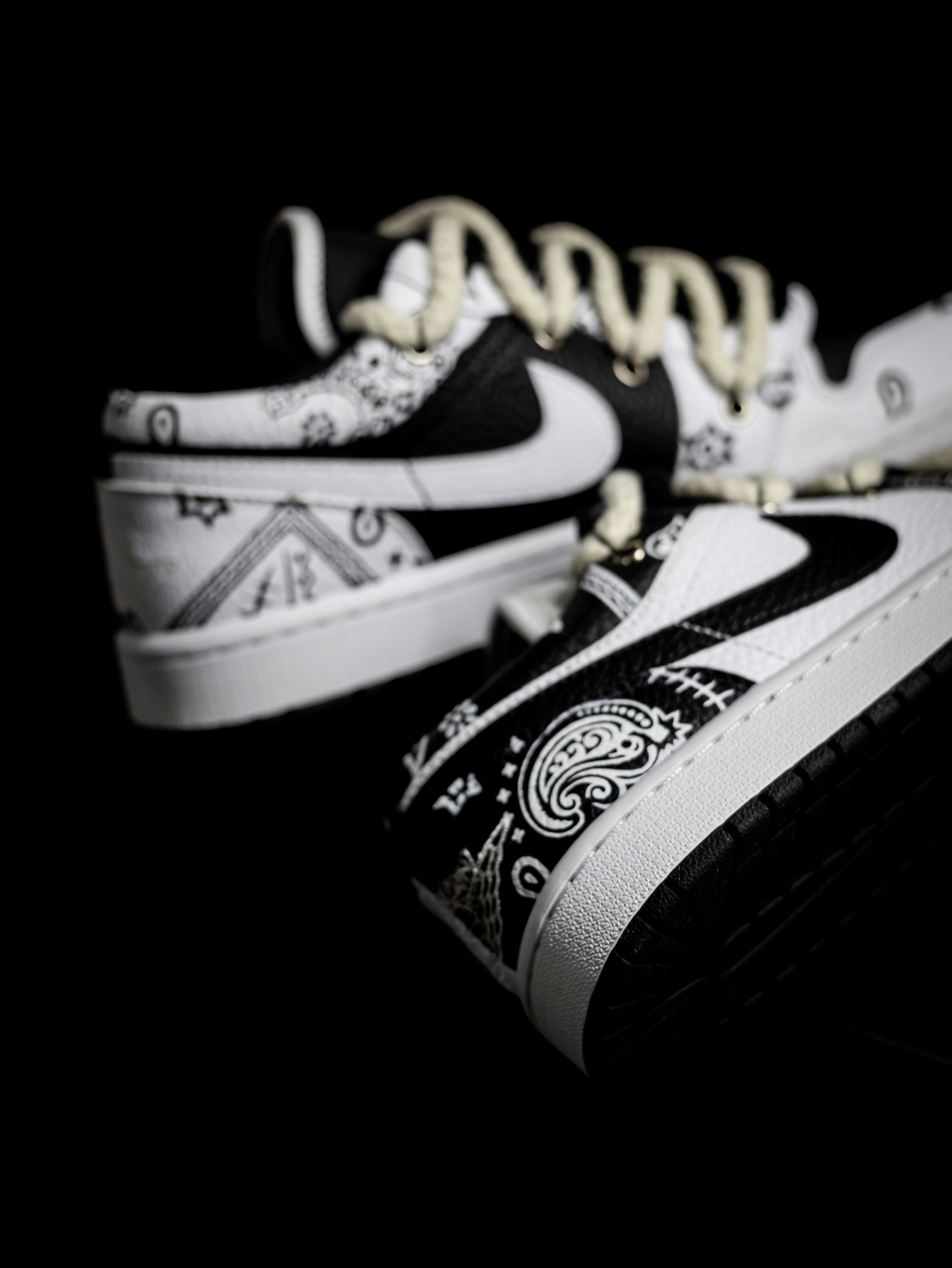 腰果花元素可以说是潮流的象征了,今天给大家分享一款非常酷帅的球鞋定制版Air Jordan 1 Low阴阳 腰果花! 鞋身以AJ1 Low 阴阳为蓝本进行改造,在鞋头及鞋身上辅以腰果花图案,非常具有潮流气息,黑白相搭配的鞋身十分独特又个性,穿在脚上辨识度极高! 鞋带部分在保留原有的基础上另外添加了一根白色粗麻绳鞋带,非常有质感!并在鞋头处加入了脏辫风格的束扣,整体搭配非常好看,穿去出街一定回头...