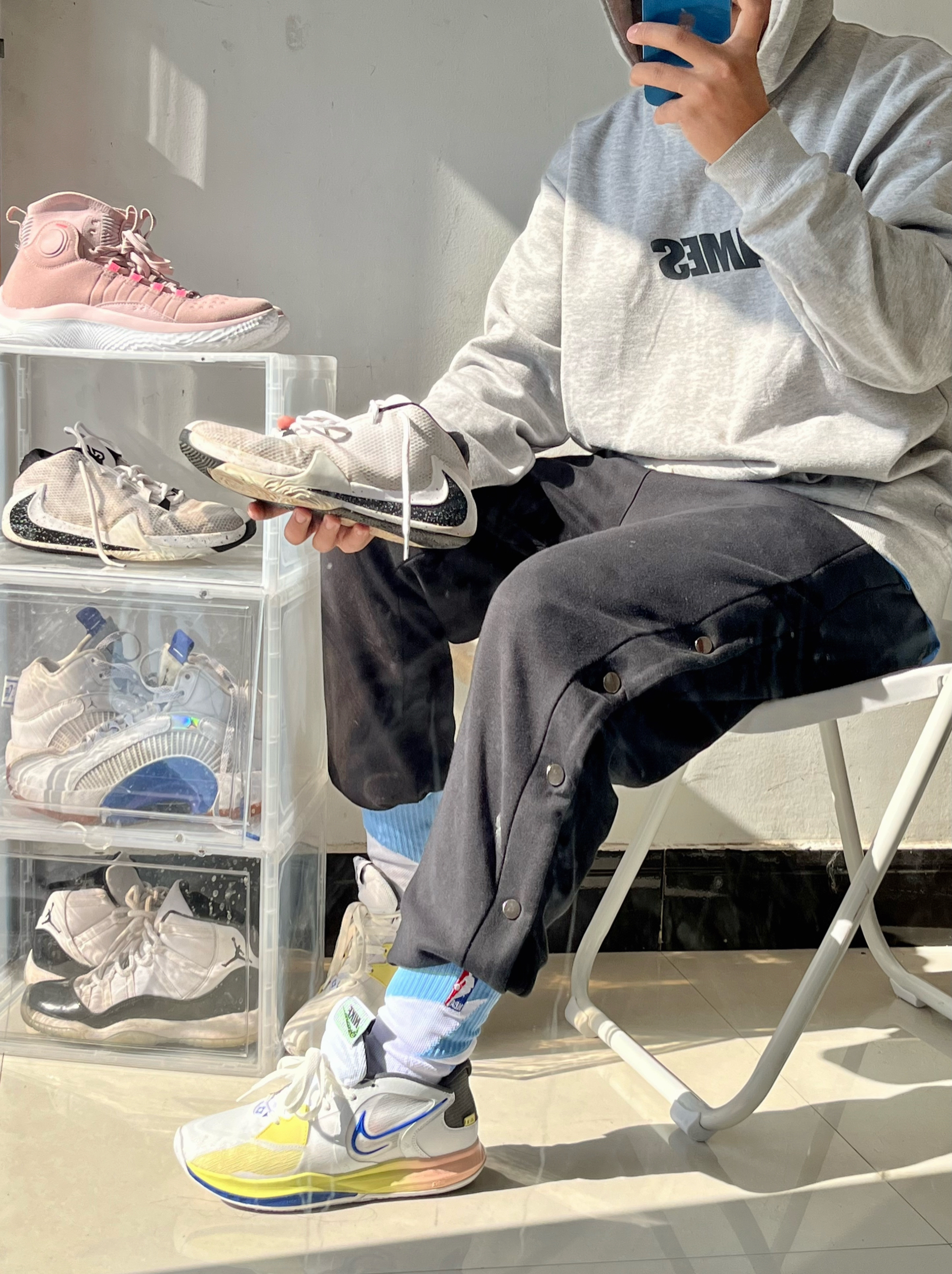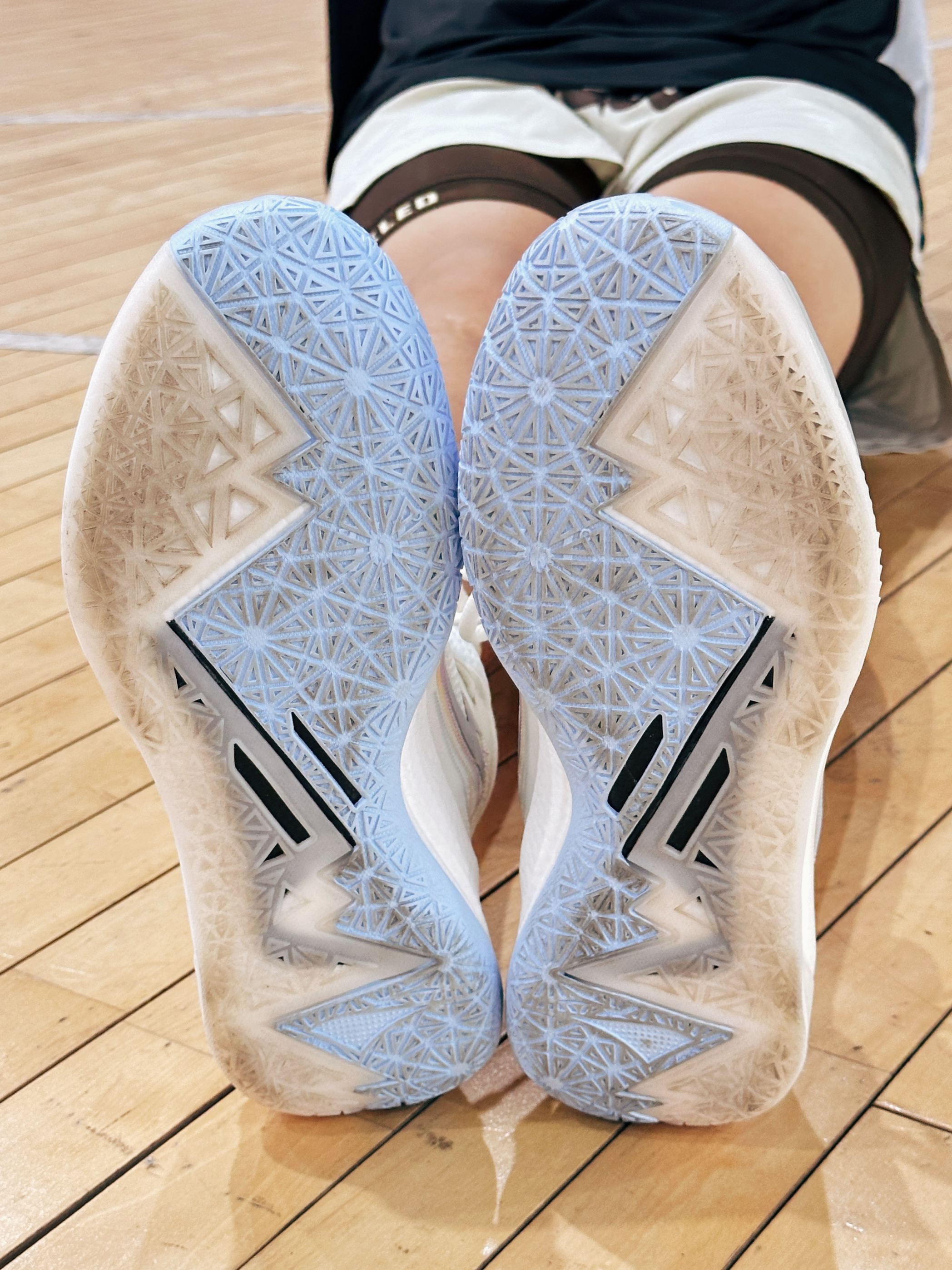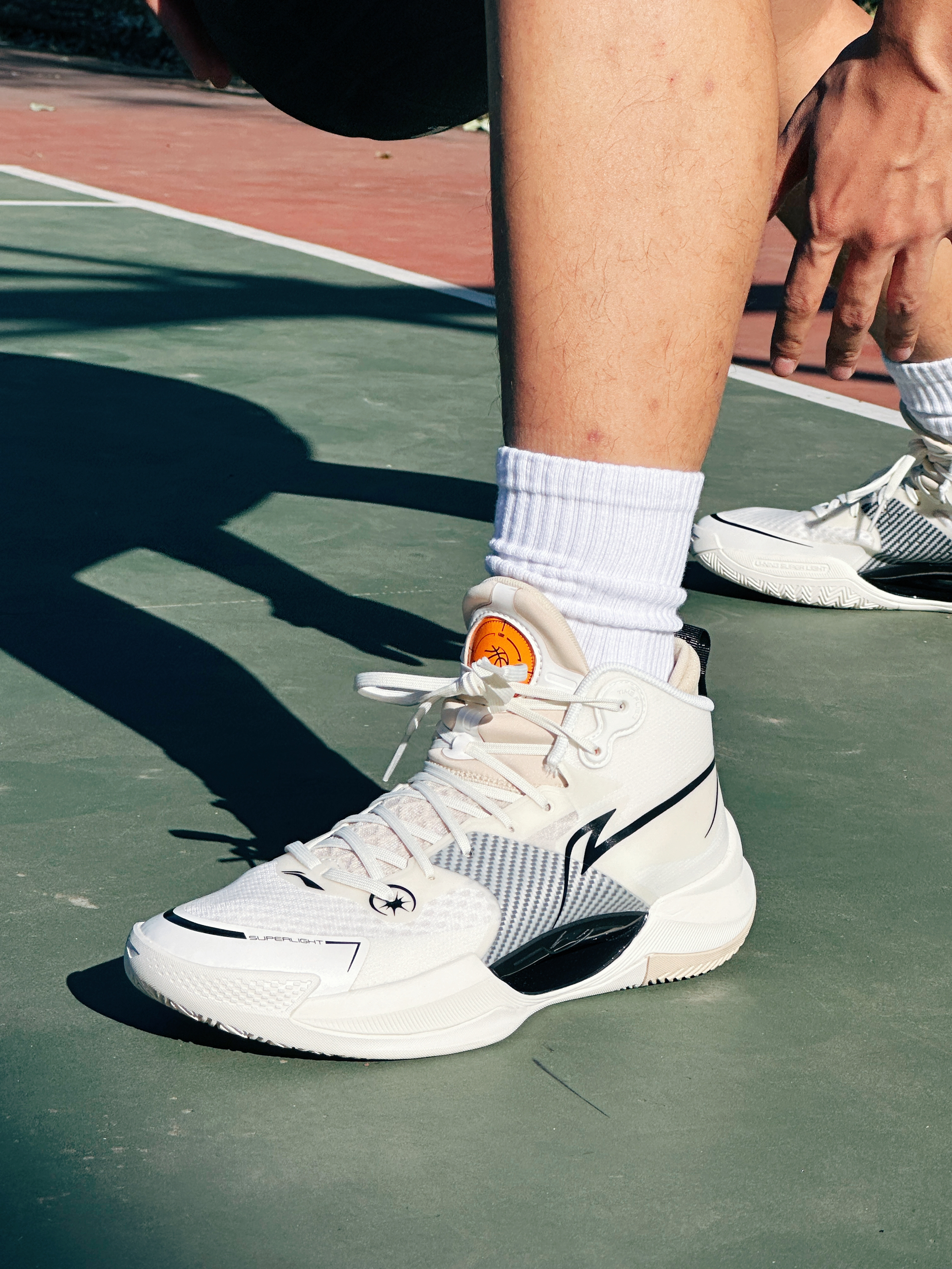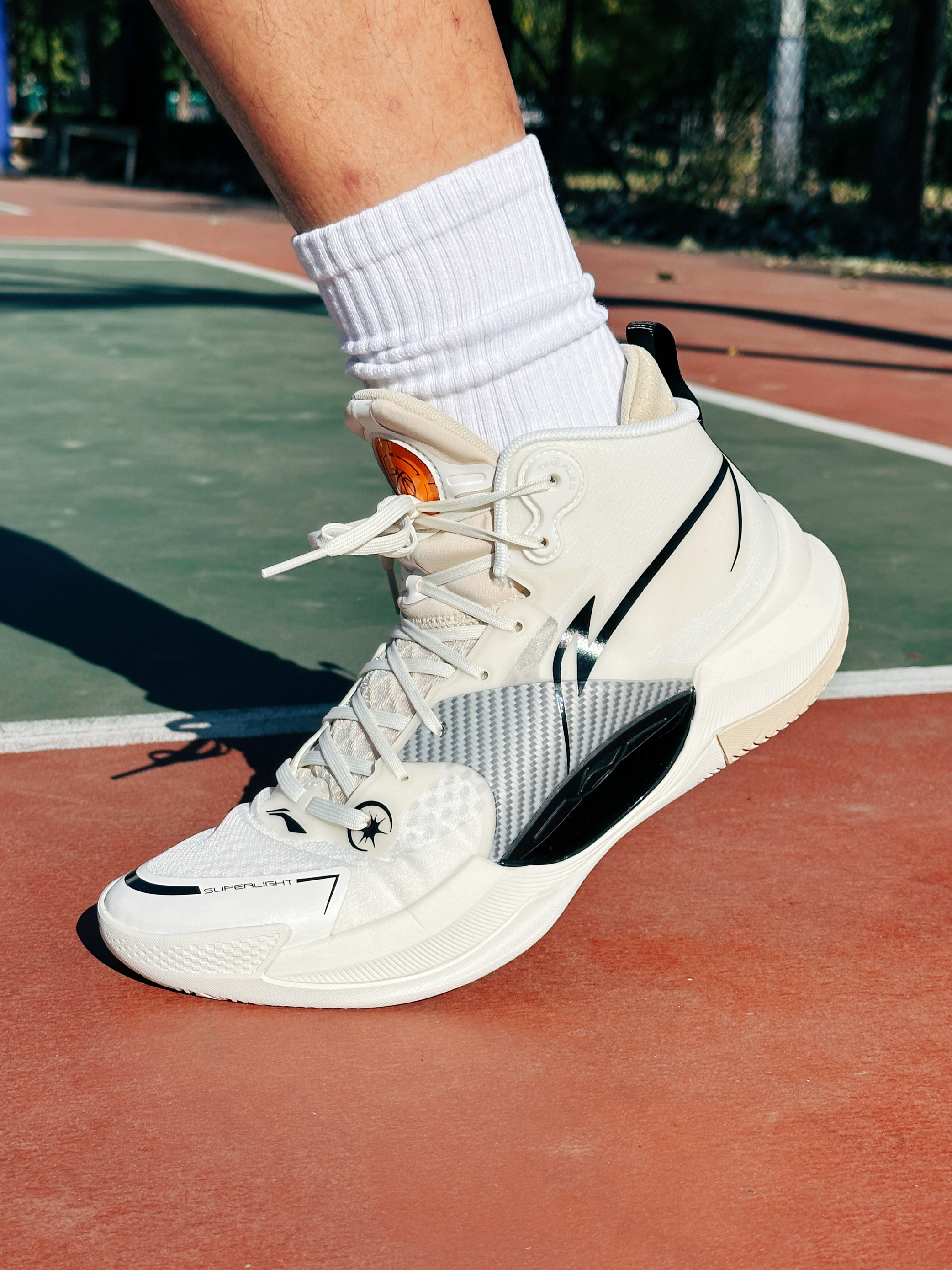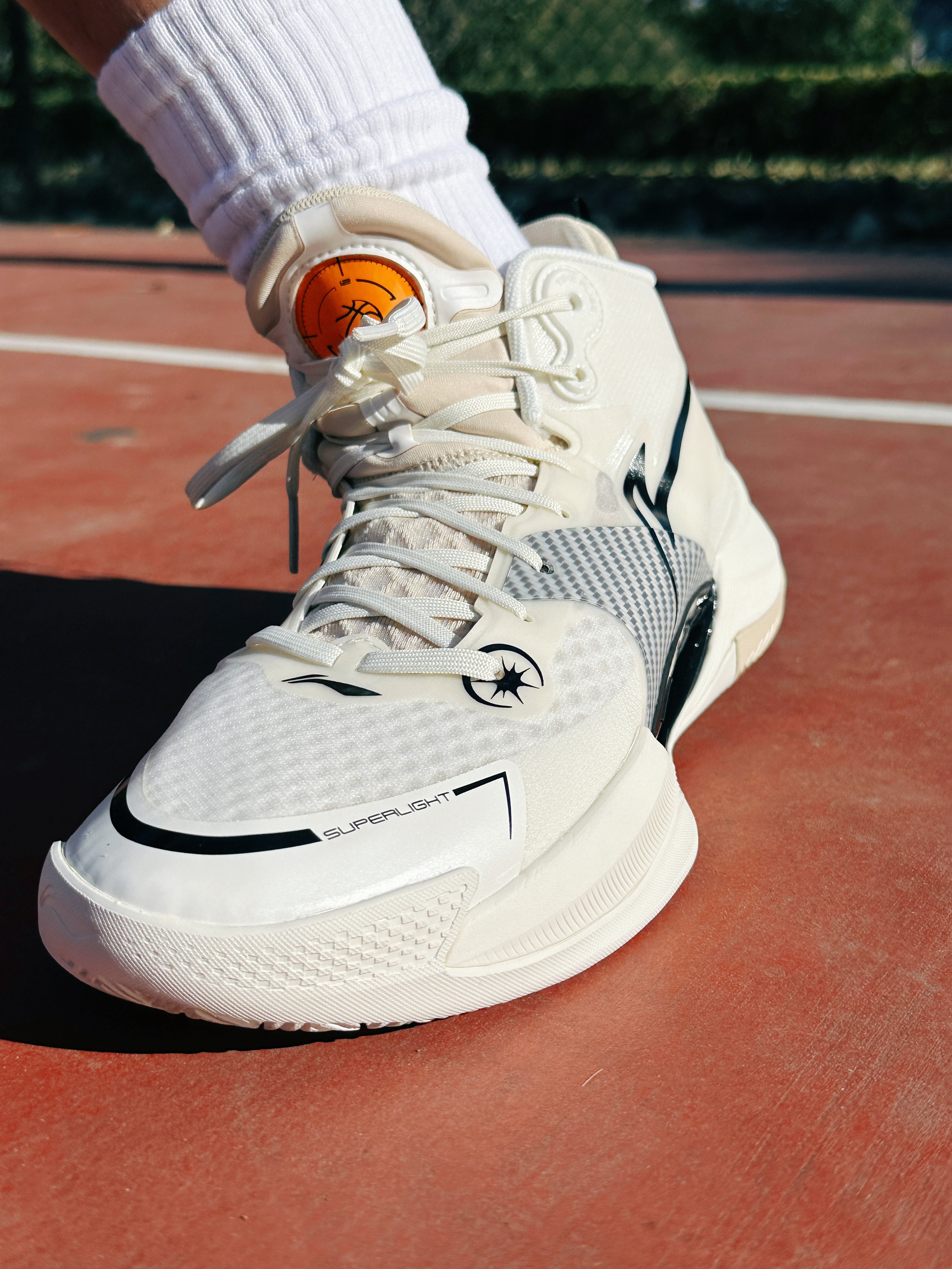 我手里的这双全身以白色为基调打造出干净简洁百搭的气质,再配上鞋头橙色的点缀,低调的同时又很有细节。 细节方面:鞋舌的LOGO换成了一颗篮球,这一点让我觉得很帅。后跟看似内靴化,实则就是做了个样子,并不是真正的内靴化结构,这样做也是防止掉跟。 配置方面:鞋面采用了三层 MONO纱材质,透气性无需多言,重点是鞋身侧面的碳纤维布,给到了相对应的强度支撑!中底采用了前掌 䨻 + 后掌 Light ...