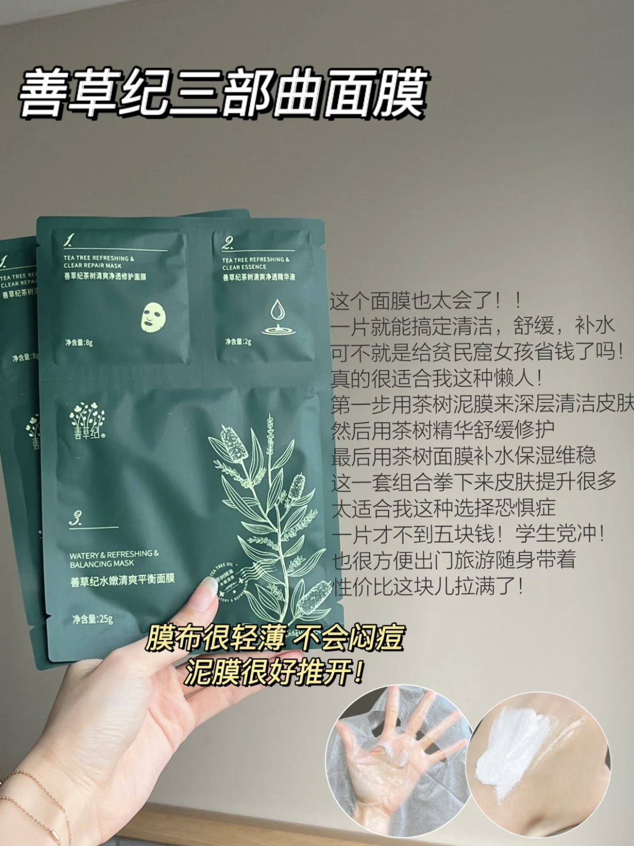 本篇笔记关联了善草纪 清影版茶树控油舒缓透感水乳套装 紧致毛孔祛痘水油平衡淡痘印油外油内干敏肌适用 水130ml+乳130ml、【张佳宁同款】善草纪 洋甘菊舒缓沁润保湿护肤套装 三部曲 退红干敏肌 水130ml+乳130ml、善草纪 茶树三部曲泥膜面膜 三合一清洁控油补水去黑头去角质 补水保湿等商品,为用户提供真实的使用体验和购买参考。