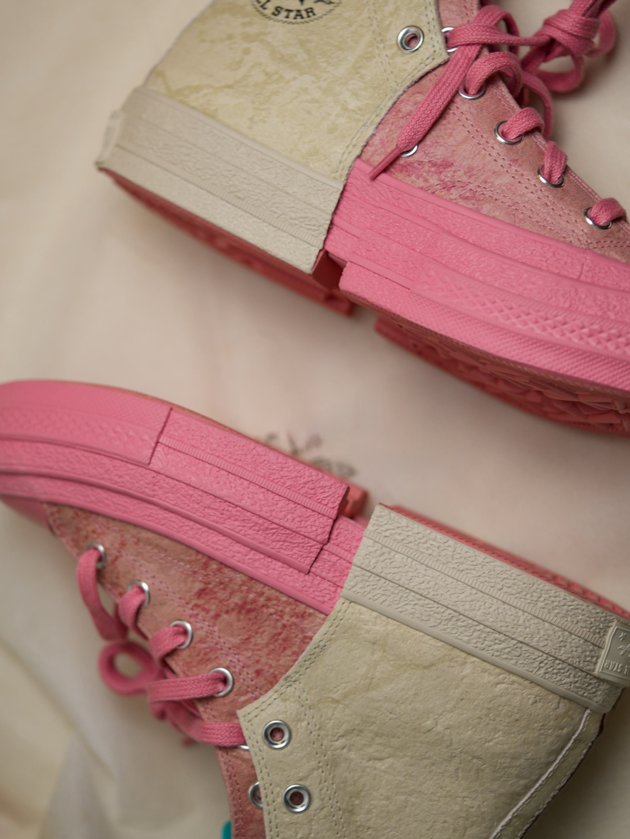 是猛男也会心动💗的匡威粉 Converse匡威和Feng Chen Wang的联名高帮帆布鞋 灰粉配色 解构风 2in1的二合一拼接设计 双层鞋底 双层鞋面(后半部分) 鞋底也有纵横的十字型凹槽 设计感十足 增高效果显著👍