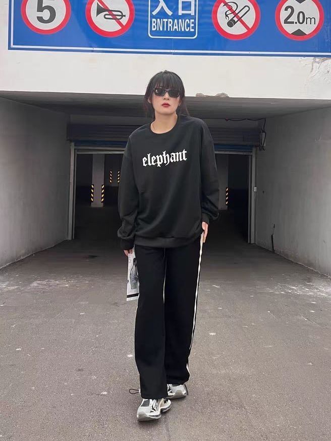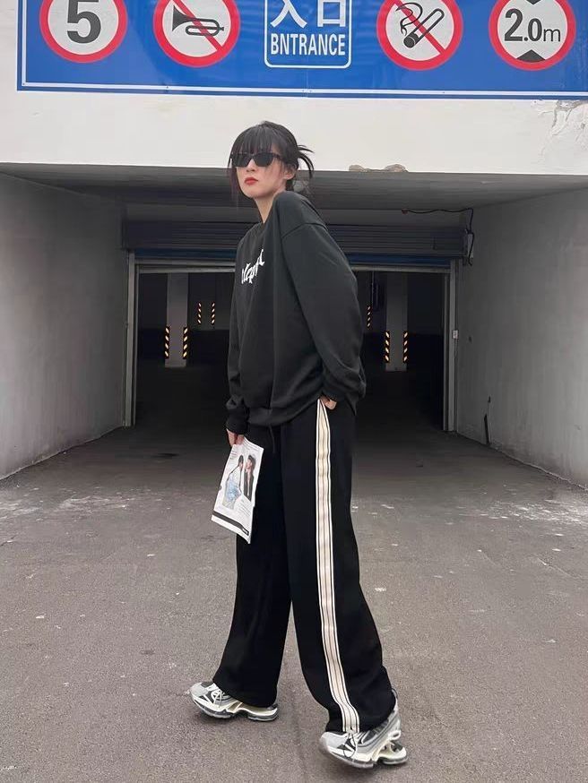 💡黑色圆领卫衣面料是特别舒服,而且贼百搭哦~ 💡面料柔软不易起球,圆领设计,不溜肩,版型立体感贼强 👍 💡不只是胸前字母印花设计有特色,后背的印花更是一绝,简直太爱了😍 💡真的蛮有特色的一条裤子,特别侧边条纹爱到不行,搭配黑色卫衣,简直就是绝配。 (图源网络侵删)