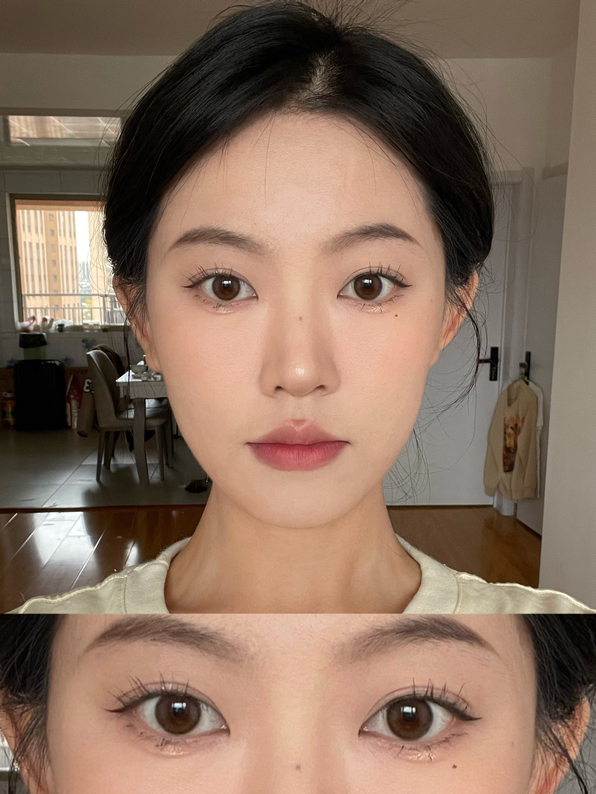 素人日常妆容分享第122天(妆容难度系数:0!) 愉快的假期结束了 上班第一天也要做一个精致早八人! 通勤真的需要get这种有手就会的妆容~ 既快速又美貌! 1⃣️底妆选用气垫快速上妆 2⃣️眉毛选用眉粉打造毛绒感眉毛 3⃣️直接用腮红扫眼皮和脸颊 4⃣️夹睫毛画卧蚕来个同色系口红 5⃣️出门!