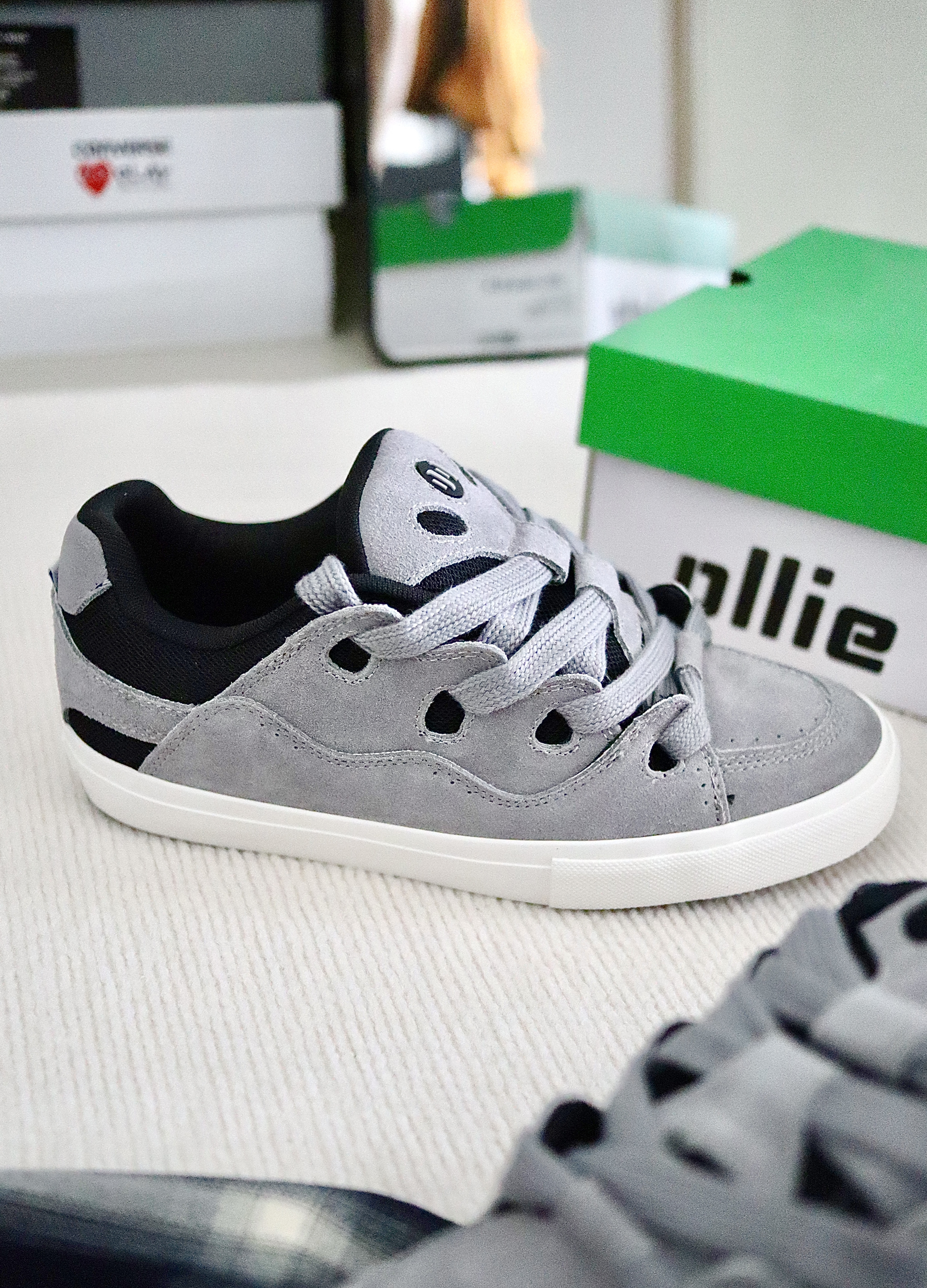 夏天买了好几双面板鞋,上街太热了,一直在吃灰~ 秋天穿面包鞋,就是对板鞋最大的尊重。 顽刻板鞋也是近期国潮的热门鞋款! 这款面包鞋圆乎乎的鞋头配上宽大的鞋带~ 而最有意思的设计,当属灰色的鞋舌👽像一只外星人! - 明天上脚再给大家发测评哈,有想要了解的,可以评论区留言!!!