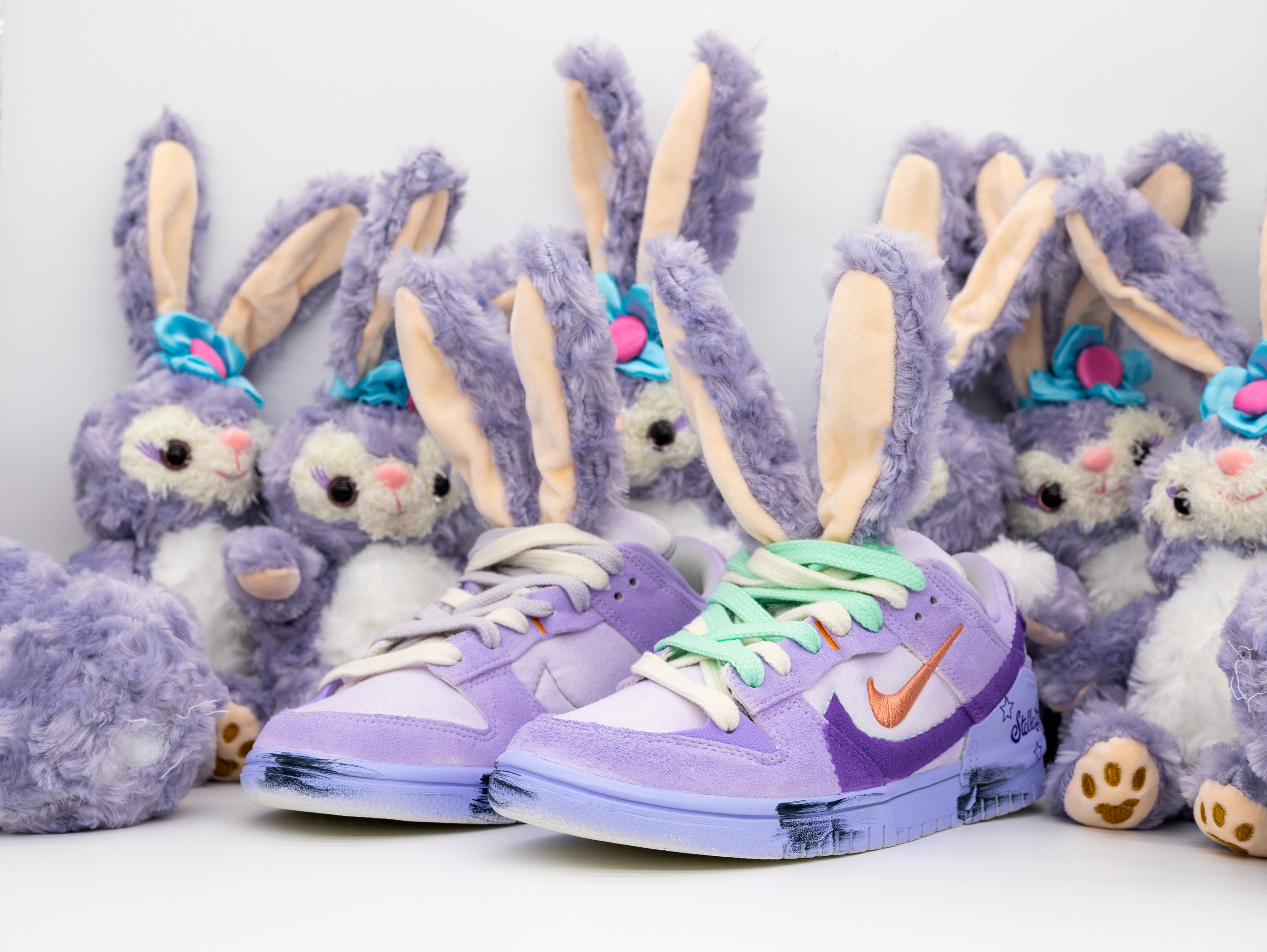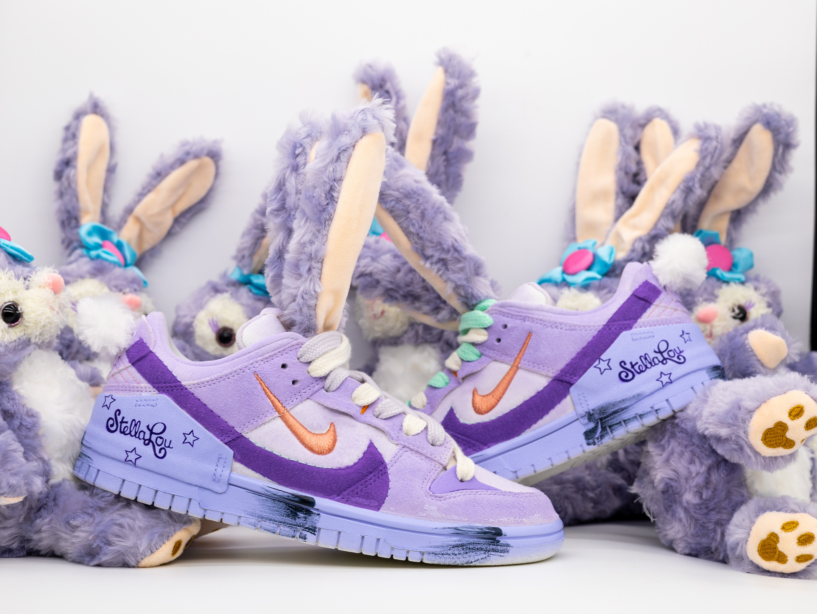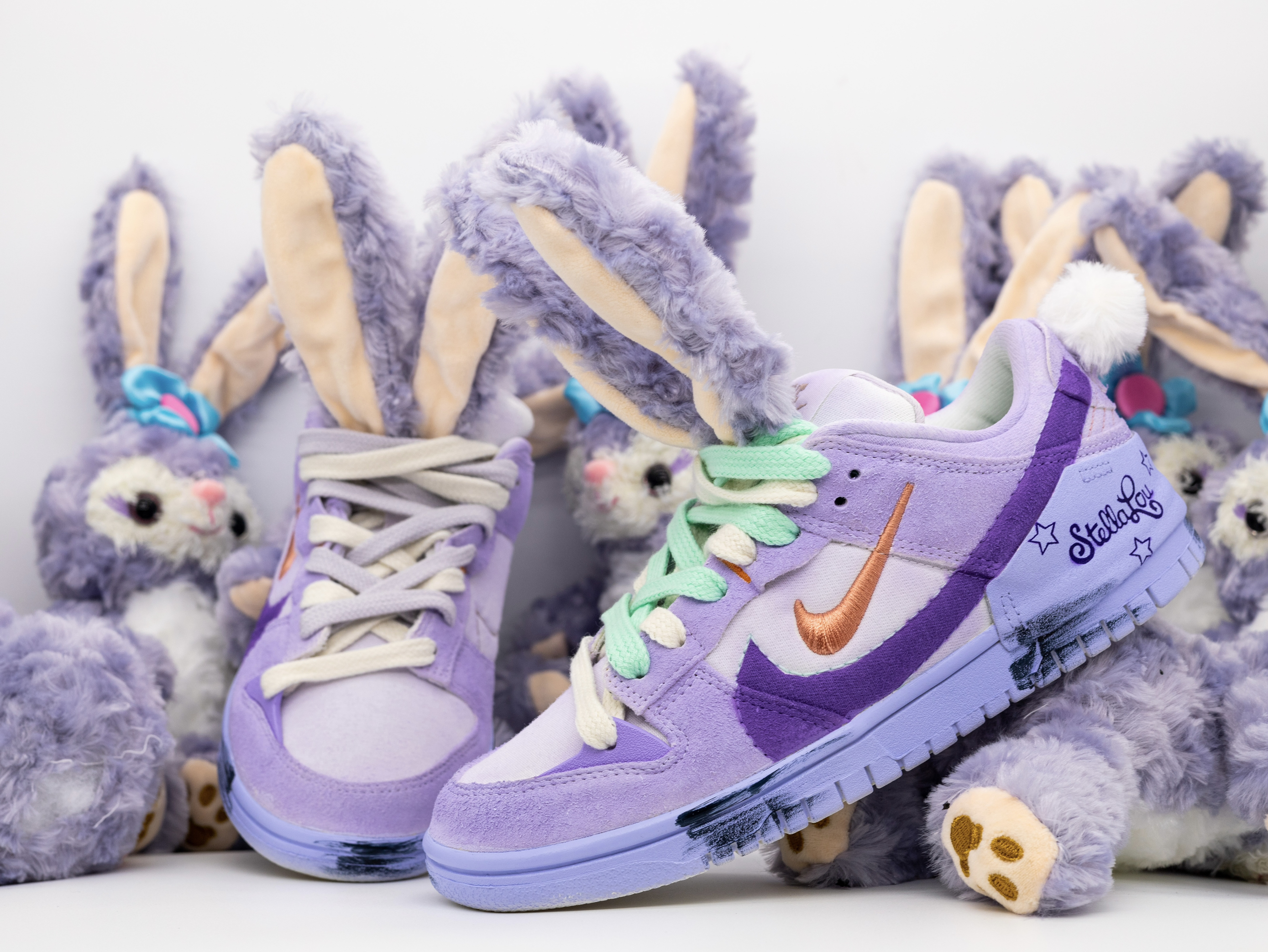 最近给女朋友入手了一款超级可爱的鞋子!相信没有女孩子会不喜欢星黛露吧?!区别于市面上普通的星黛露玩偶、这款可以穿在脚上的鞋子真的是太令人惊艳了! 球鞋以 Dunk Low Disrupt 2为设计原型、融入了星黛露的元素!鞋面采用了粉紫配色、鞋带则是绿紫鸳鸯配色!鞋舌以及后跟分别用裁缝的工艺做了毛茸茸的长耳朵和短尾巴!可以说还原度很高!视觉体验也是特别的惊艳!另外在后跟也做了英文涂鸦和五角星图案...