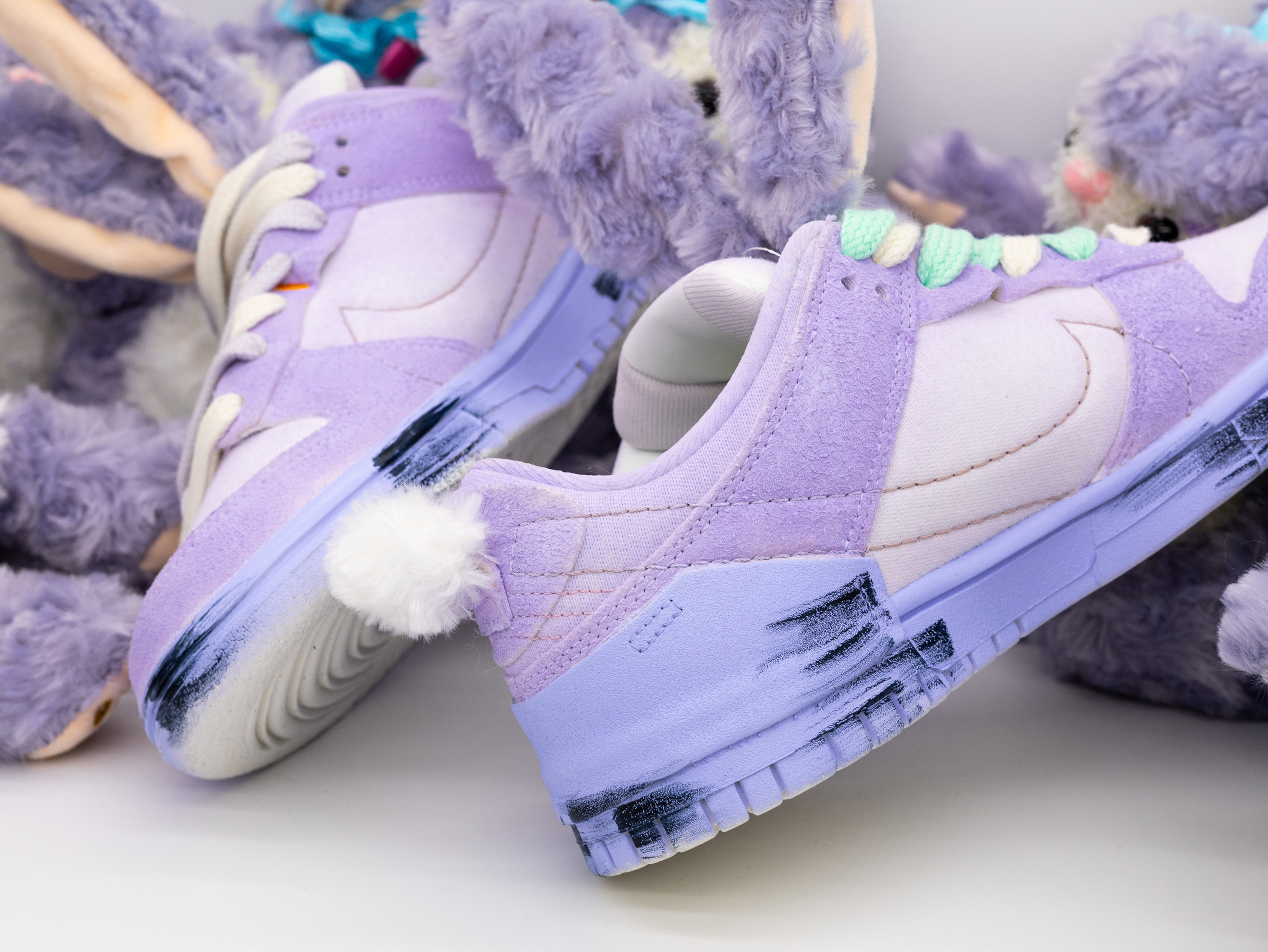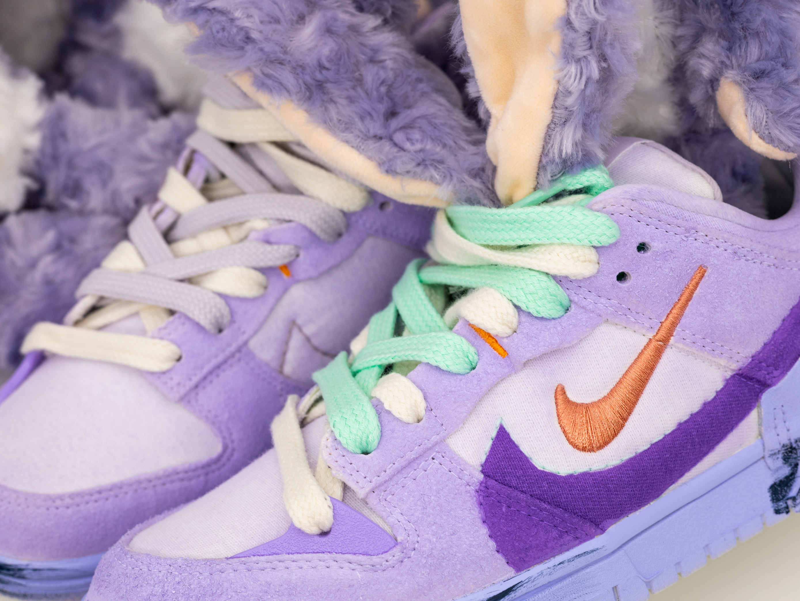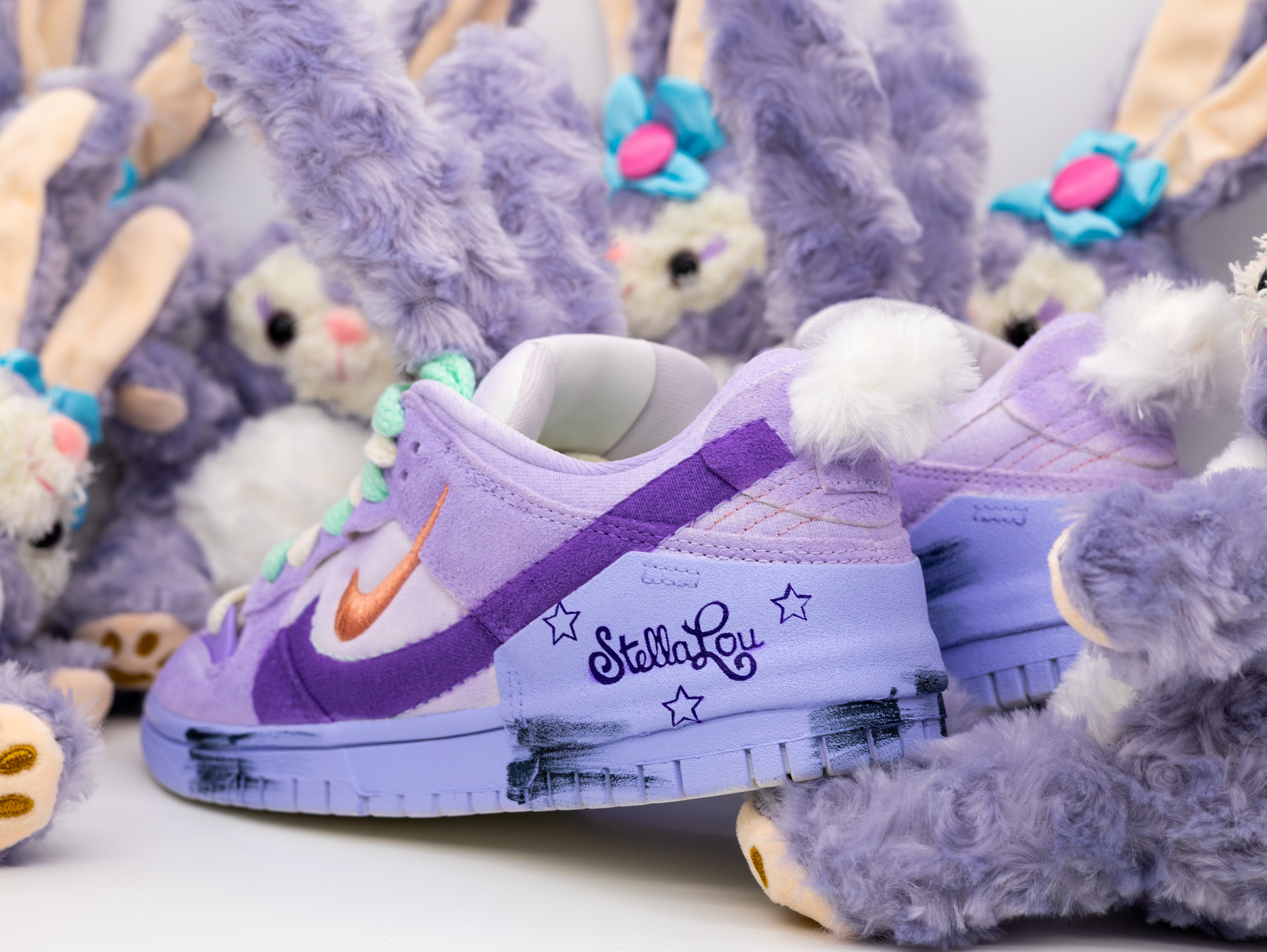 最近给女朋友入手了一款超级可爱的鞋子!相信没有女孩子会不喜欢星黛露吧?!区别于市面上普通的星黛露玩偶、这款可以穿在脚上的鞋子真的是太令人惊艳了! 球鞋以 Dunk Low Disrupt 2为设计原型、融入了星黛露的元素!鞋面采用了粉紫配色、鞋带则是绿紫鸳鸯配色!鞋舌以及后跟分别用裁缝的工艺做了毛茸茸的长耳朵和短尾巴!可以说还原度很高!视觉体验也是特别的惊艳!另外在后跟也做了英文涂鸦和五角星图案...