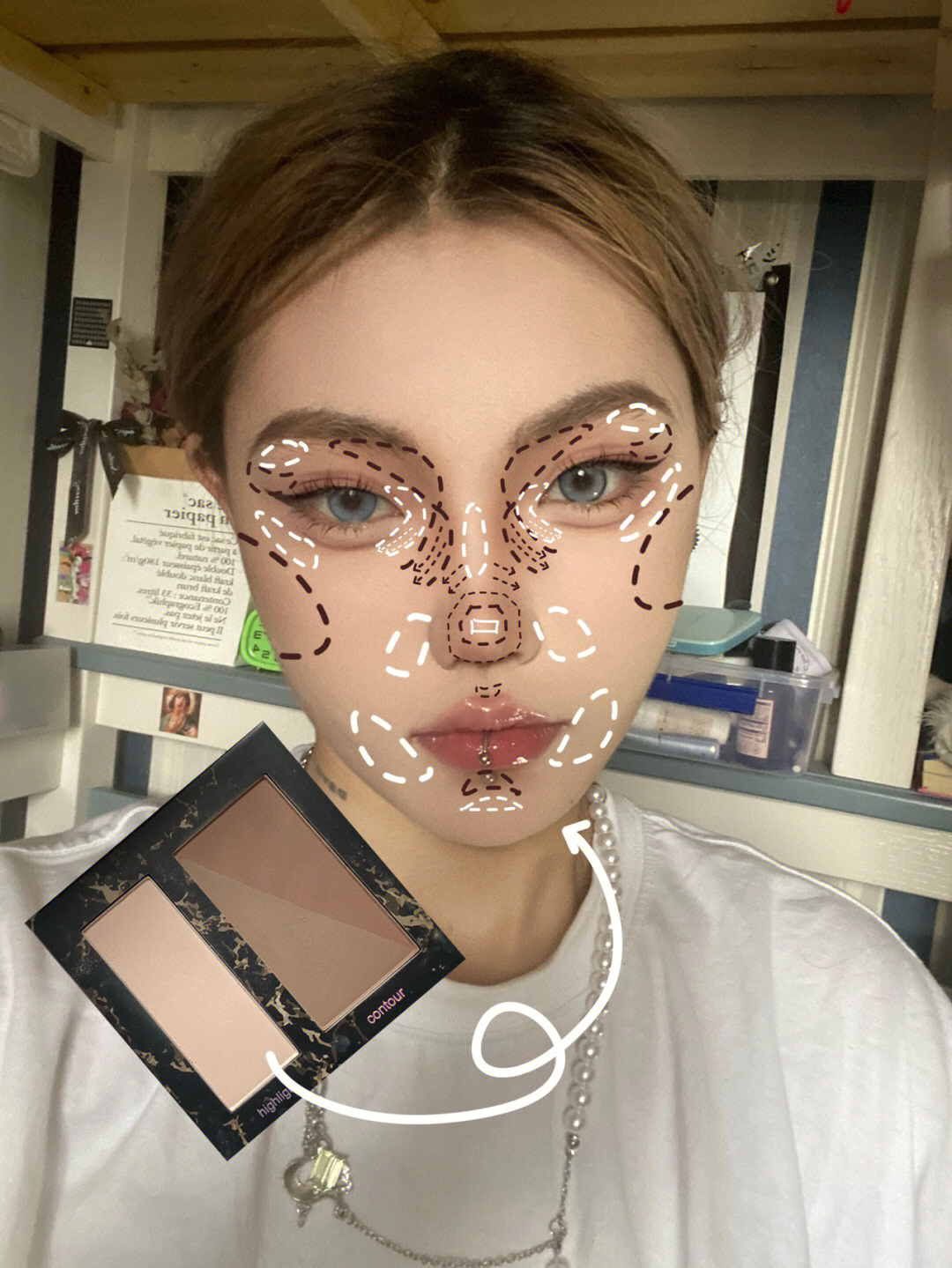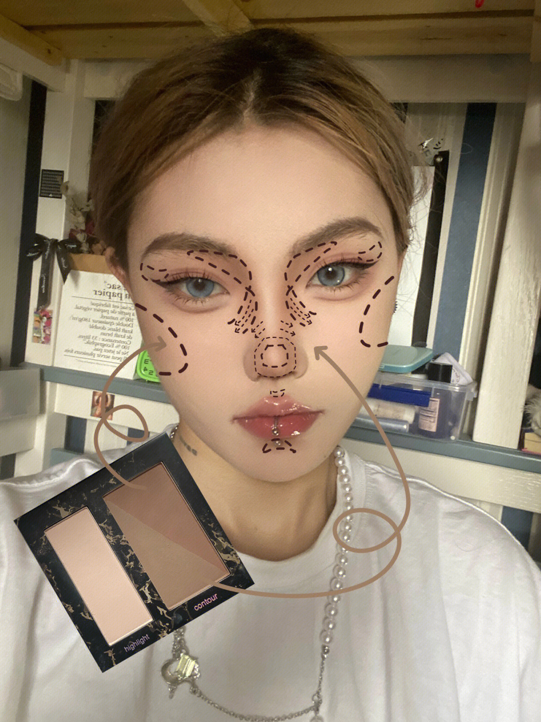 这个的精髓就两个:骨感混血的修容和大面积的粉嫩腮红 修容是Nycemakeup 之前我的铁皮合集里就分享过我用空了他家两盘 出了这个新款的带哑光高光的盘子我就立马入了 颜色调得很绝非常适合亚洲人 不会显脏 粉质也很好晕染 教程附上! 腮红又是我们的老朋友奈玑子 老网红BH04 草莓糯米团 画眉推荐的颜色 属于甜妹的牛奶色腮红 打在鼻梁 卧蚕 脸颊 下巴 太阳穴和眉心也稍微带一丢丢 嫩出天际真的太美...