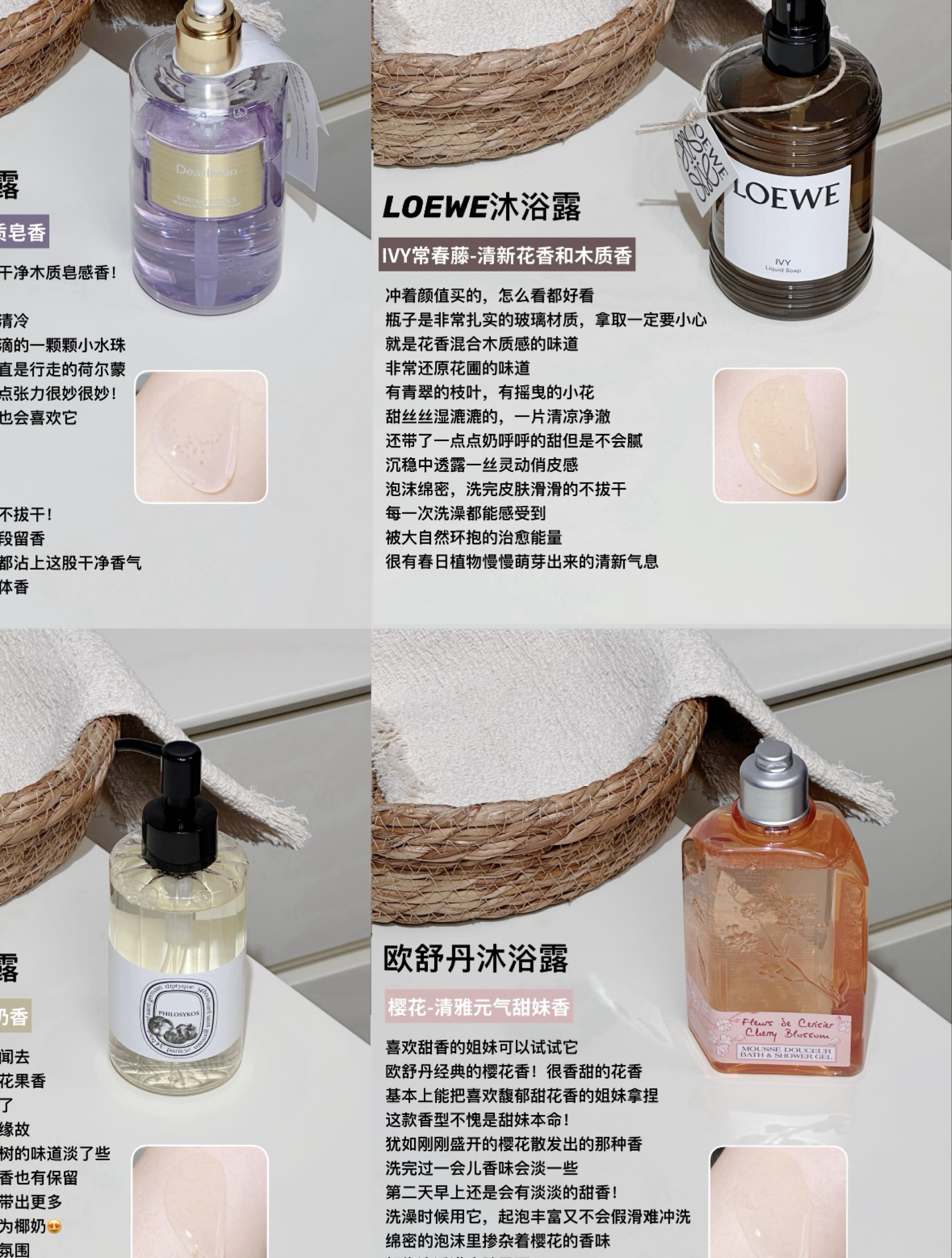 最近泰爱买香香的沐浴露和身体乳了 秋冬天就是要追求被窝香香 睡觉会很治愈~ 伪体香+保湿 这个秋冬天谁能拒绝啊啊啊 - ·Demiki身体乳 好好闻!山茶花+蓝莓的花果香 甜甜的有点淡雅(很像🐟书欣的香味) 奶霜质地涂在皮肤上的肤感别提有多jue 而且很好吸收 不会跟我衣服黏在一起 这个季节来用刚刚好 我发4!介个是用一次就会很喜欢的呜呜呜 保湿+留香+好吸收 把我拿捏住了 - ·Roopy身体...