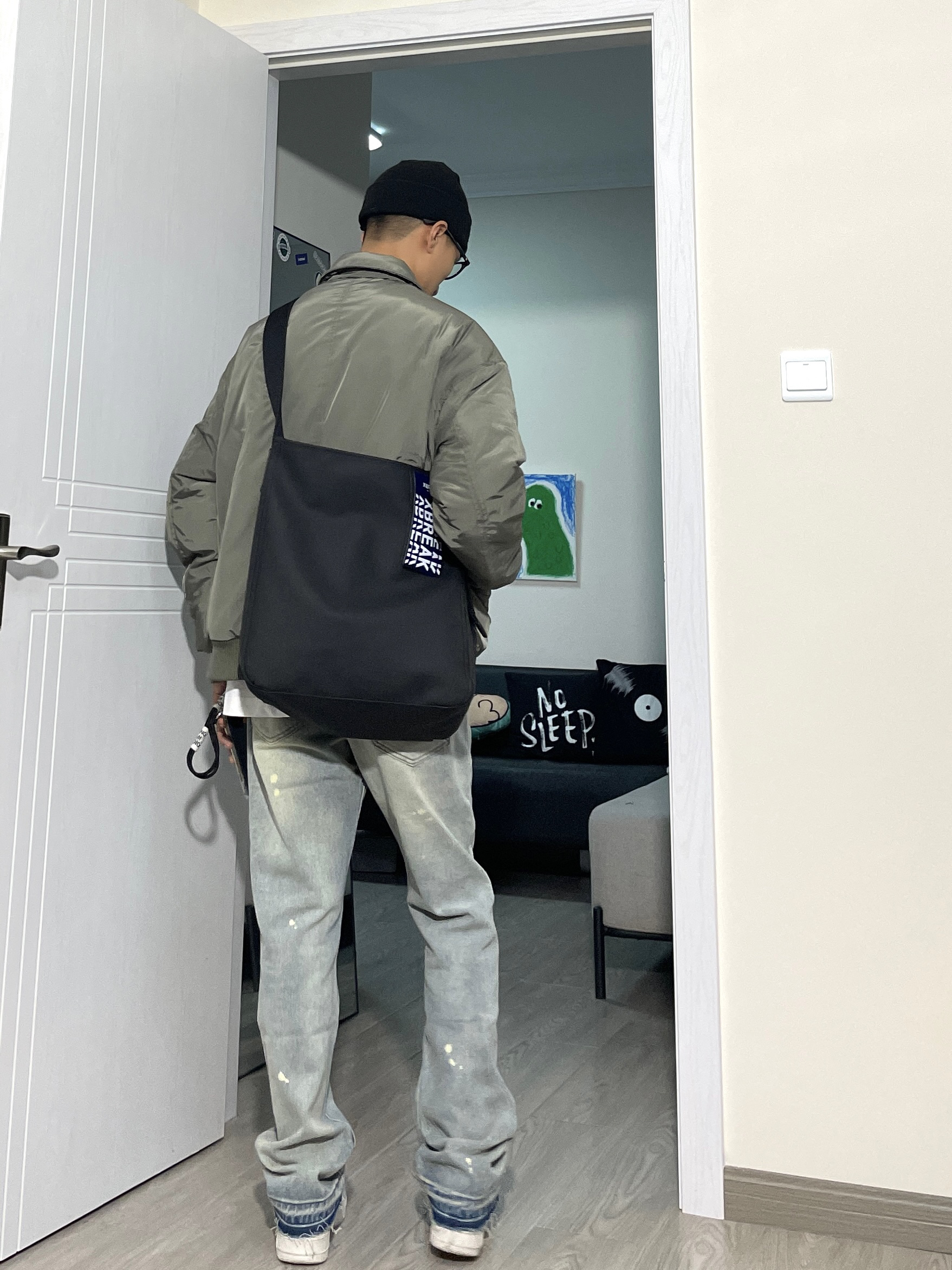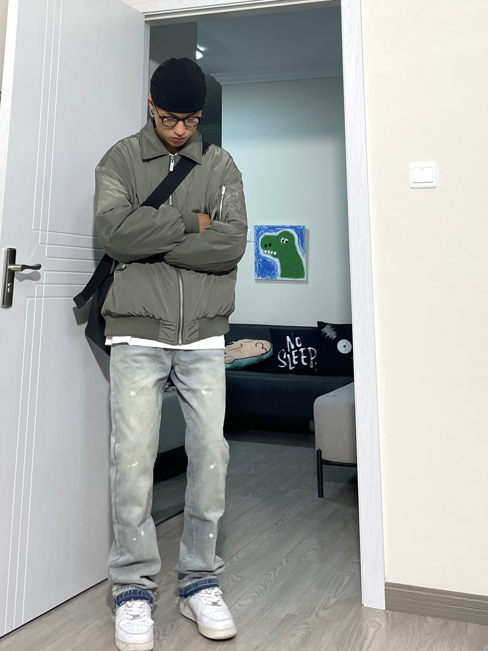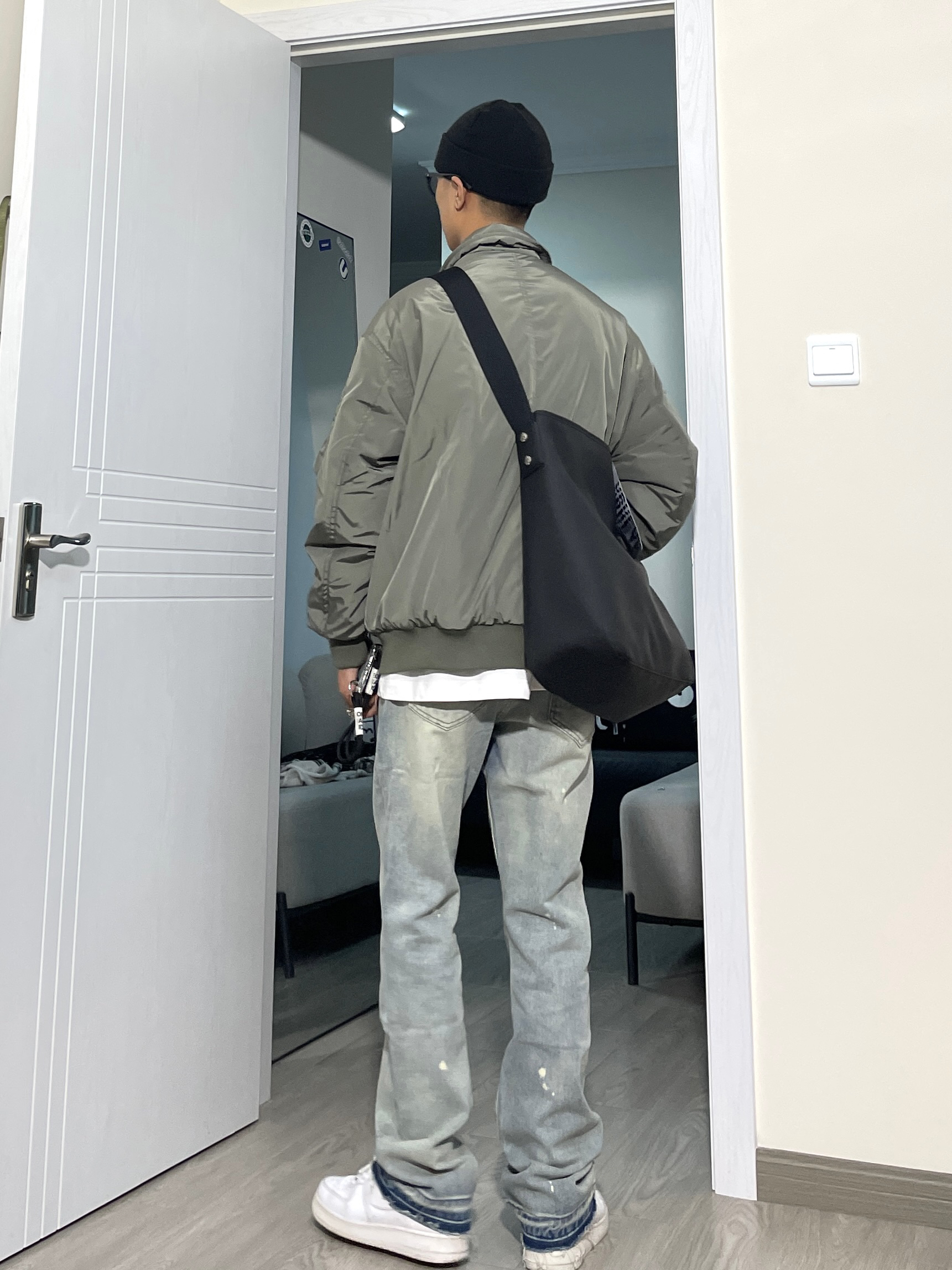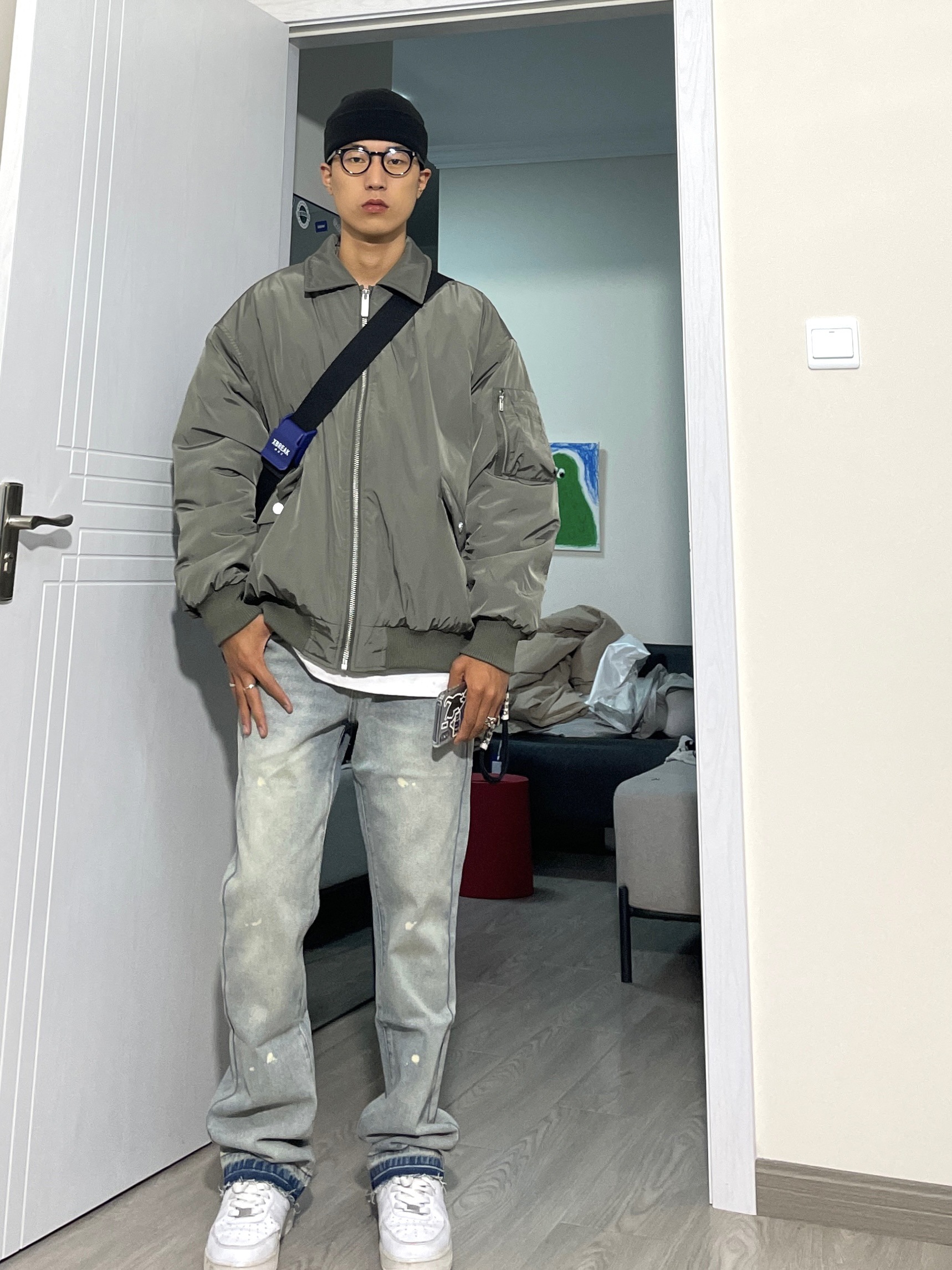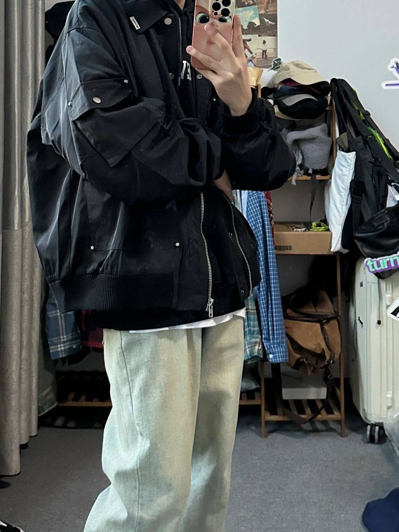 上衣来自CHINISM的纯色飞行夹克,没有过度复杂的配色,版型合身,日常搭配也没啥难度,随意搭配一条牛仔裤就很好看。 👖 来自KBNF的破话微辣牛仔裤,微修身版型,好穿! 👟 AF1