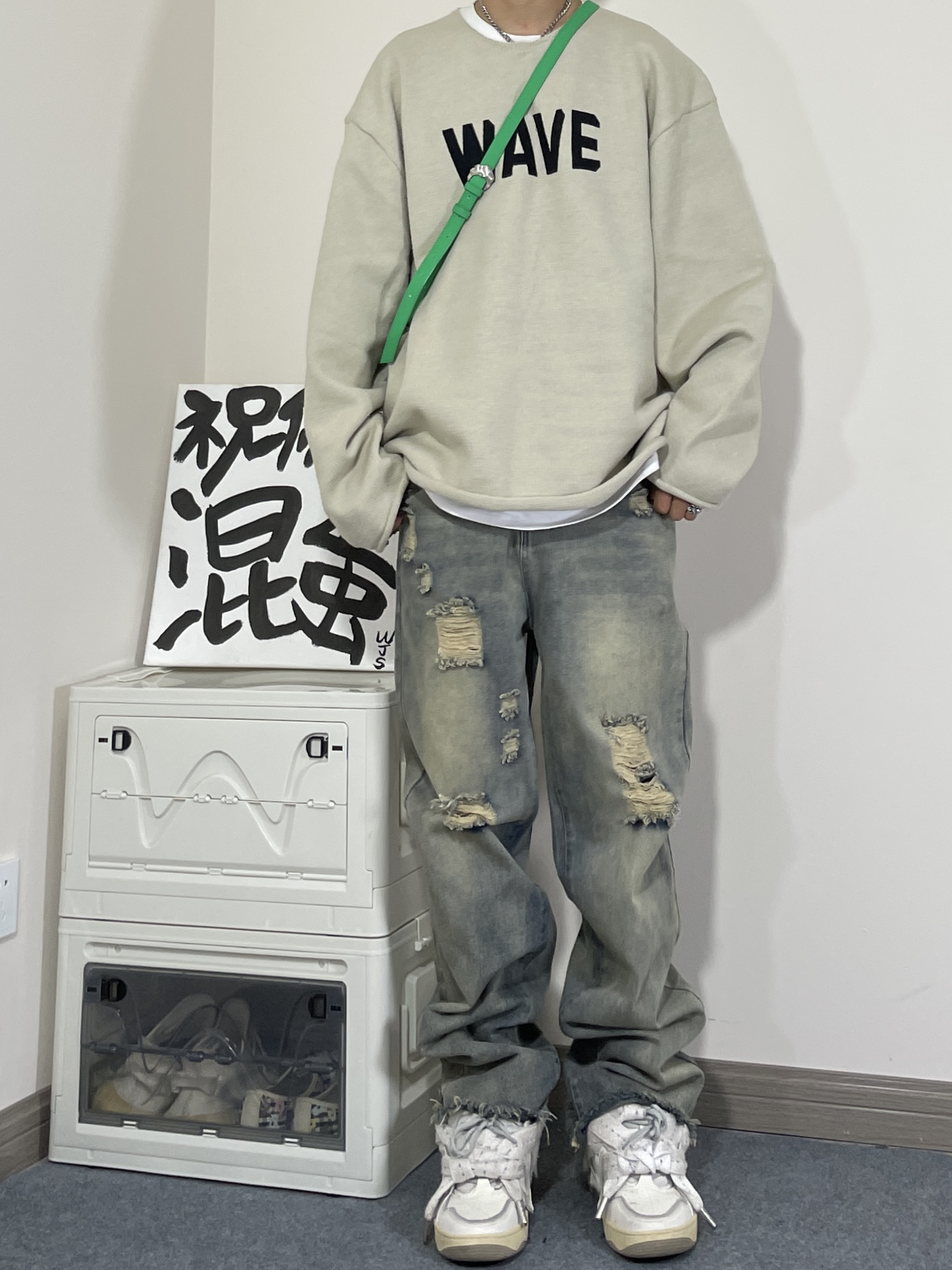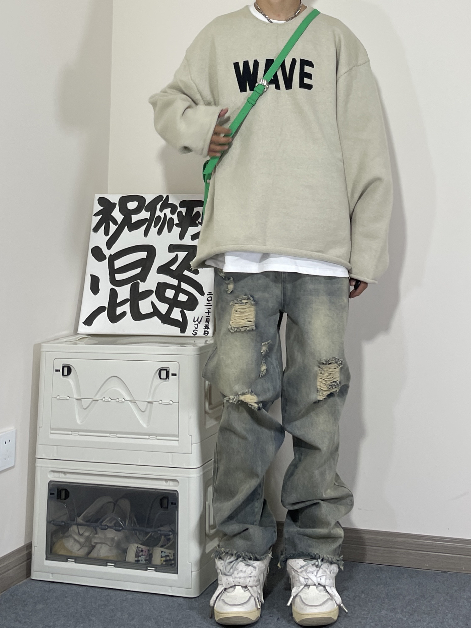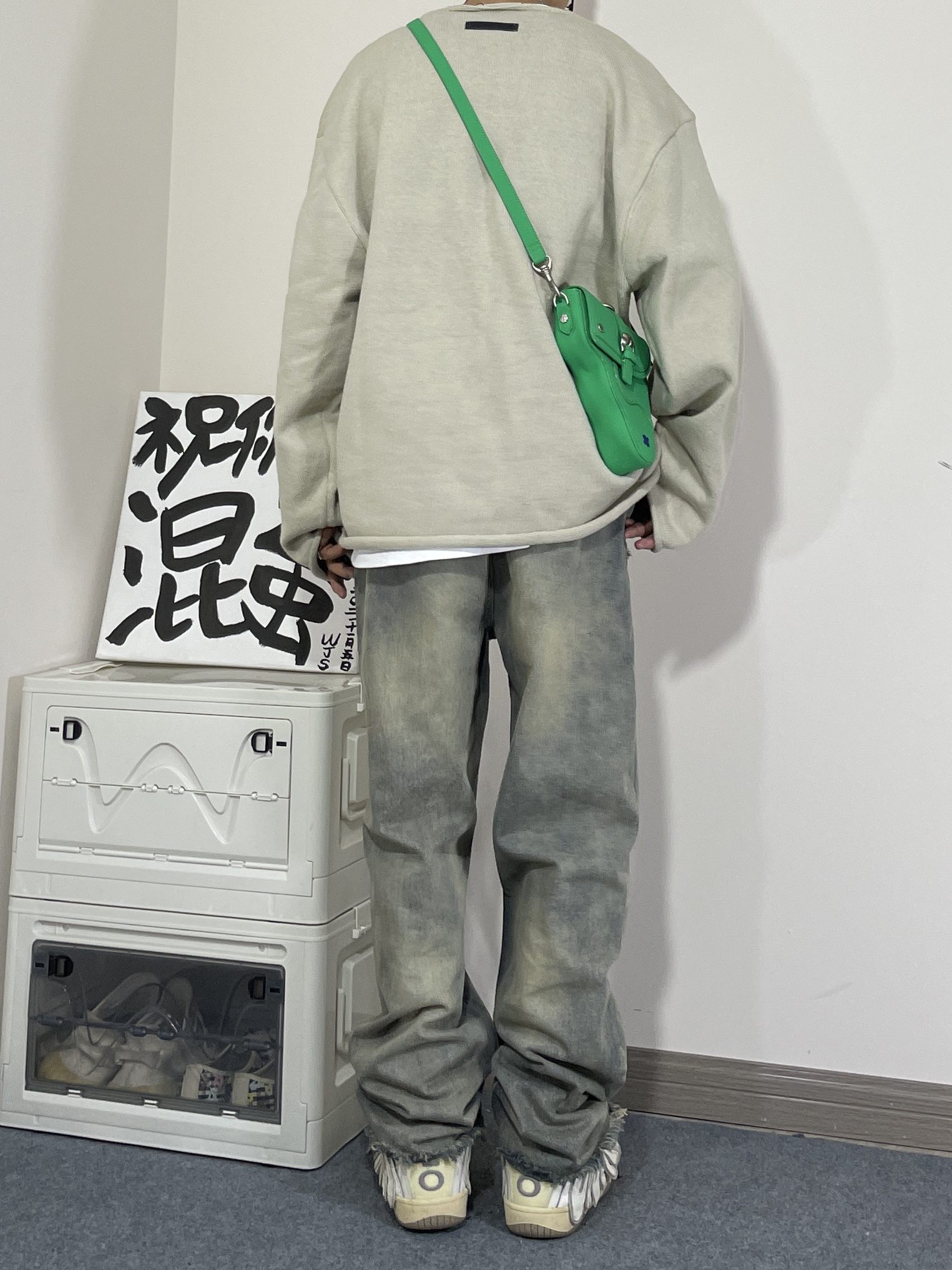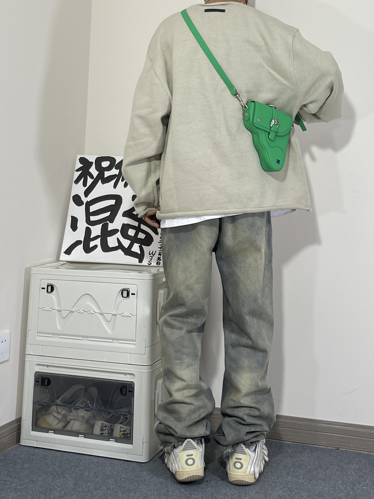 套浅色系搭配。 👔 上衣来自WAITINGWAVE候浪的毛衣,整体宽松版型,边角的卷边设计很有意思。整体面料很厚实,很有重量感。 👖 来自春春本CHUN的直筒牛仔裤,浅黄泥水洗配色和衣服很搭,裤子的长度也很合适,裤脚处的堆叠感是我喜欢的效果。 👟 来自OLD ORDER的面包鞋,入了大半年了,穿长裤效果是真的好看。 🎒 GL双肩包