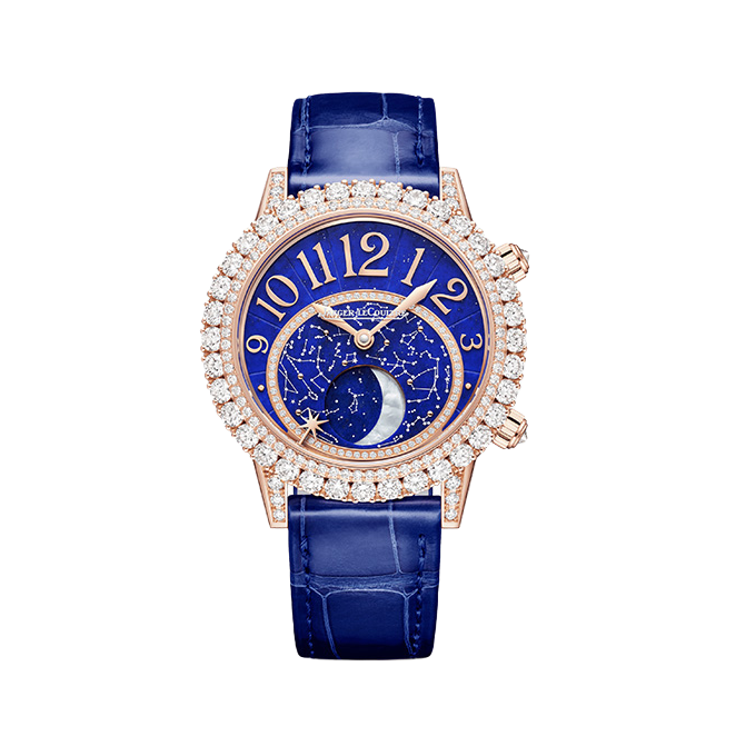 积家约会系列月相表 【表壳】腕表尺寸36mmX10.6mm,质感同步正品。镶嵌124颗顶级钻石勾勒腕表圆润外观,与镶满美钻的表圈相辅相成共同散放着星空一般的璀璨光芒 【表盘】搭配一枚星形指针以最富诗意的方式,提示佩戴者约会的时间,珍珠贝母月相在缎面打磨的星图映衬下尽现柔美 【机芯】CITIZEN9015改CAL.935A机芯,完美实现原装星辰月相功能,走时稳定 意大利小牛皮质感上佳,搭配积家原装折...