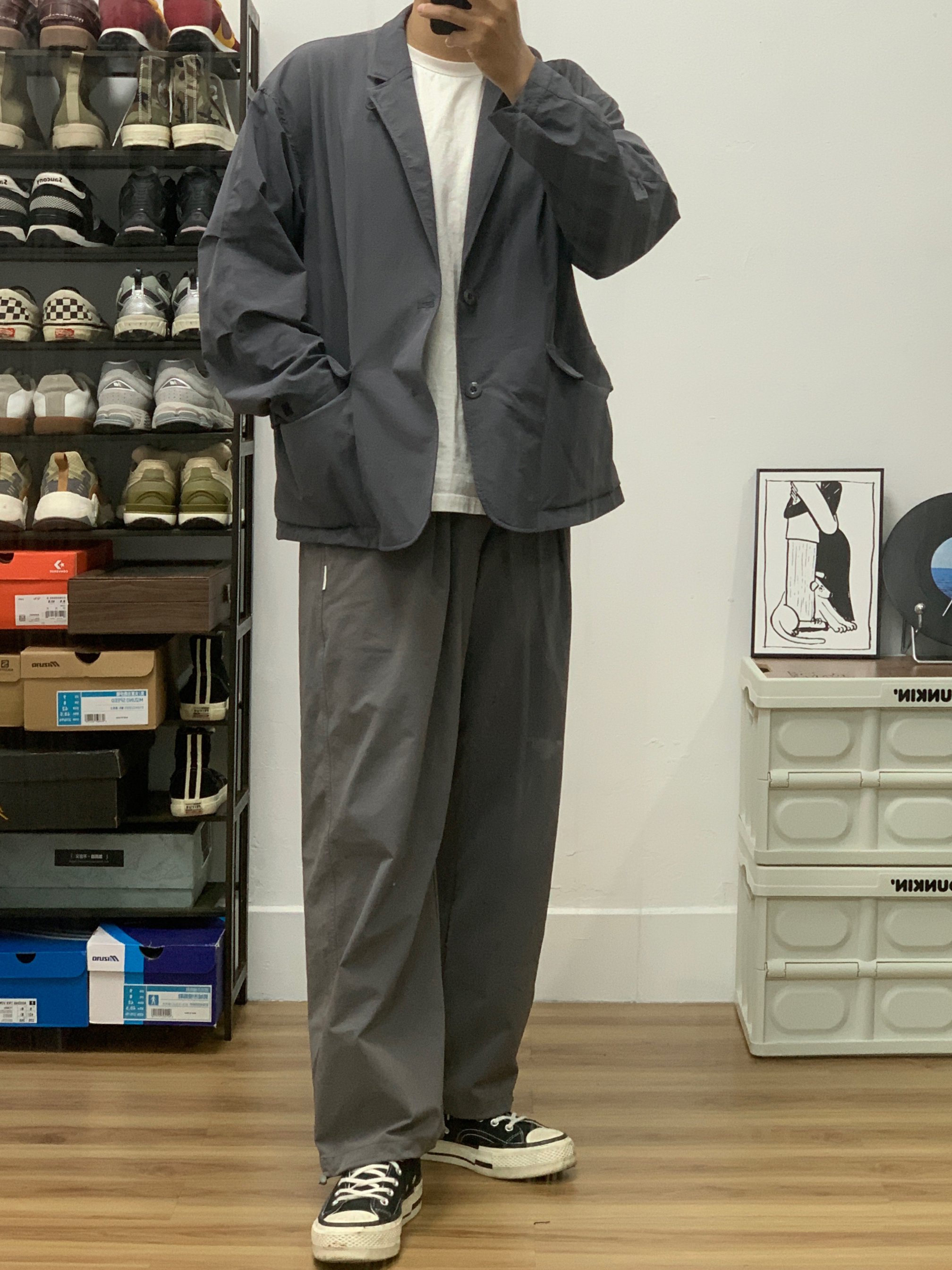 hey 这里是每天记录穿搭的社畜日记。 年底的社畜真的是忙到没日没夜 这个点才刚到家 迅速码完字准备洗洗睡了 家人们晚安💤💤💤 今日乱搭: 灰色西装套装+匡威1970s plus