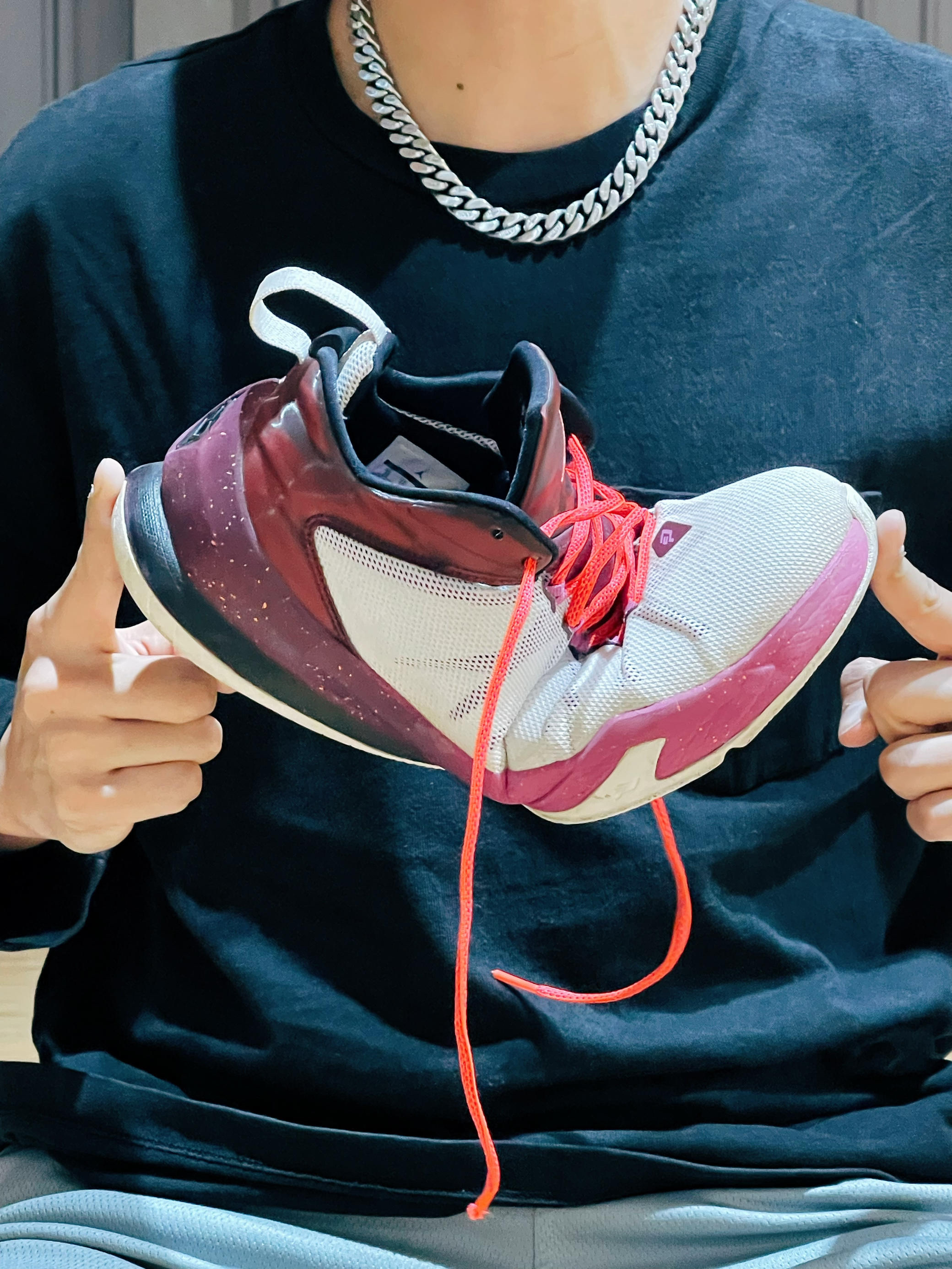 注意看!两只手指头就能轻松完成对折!你们说这是好不好呢? 我手里的这双是 AJ CP3 8 AE 版本也就是季后赛加强版本,和普通版本到底有哪些不同,知道的朋友可以说出来告诉大家。怎么样整体造型 1—5 分老规矩你们能给到几分可以写在评论区!整体配色以 白和玫红色打造,干干净净现在看都不丑。鞋面采用了工程网面加内嵌的动态飞线,并且飞线和鞋带孔合在了一起。鞋舌正面分别是 Jordan 的 LOG...