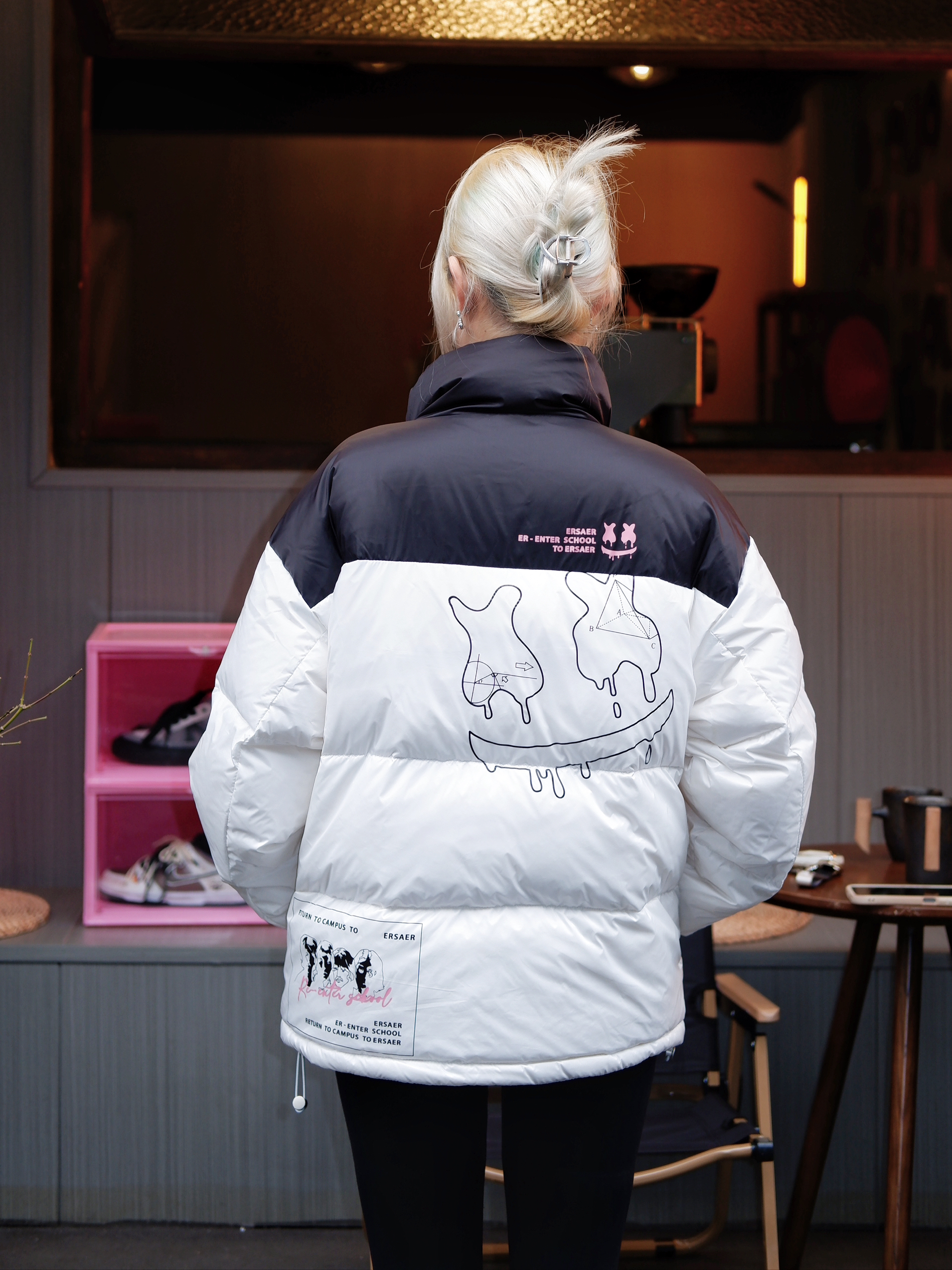 最近穿棉服有点冷,我还是要掏出来我的羽绒服穿啦。 今天是 ER 数学公式的羽绒服,黑白🔅配色这个真是怎么搭配都不会出错。羽绒服轻便的同时还很保暖,出去逛街走起来完全不会有压力。衣服上的几何图案也是细节满满。 今天的鞋👟来自 PONY Street,板鞋穿起来就是舒适又休闲,因为我的鞋多还买了一个 GOTO 的侧开款马卡龙🍰鞋盒,粉粉的超级少女!