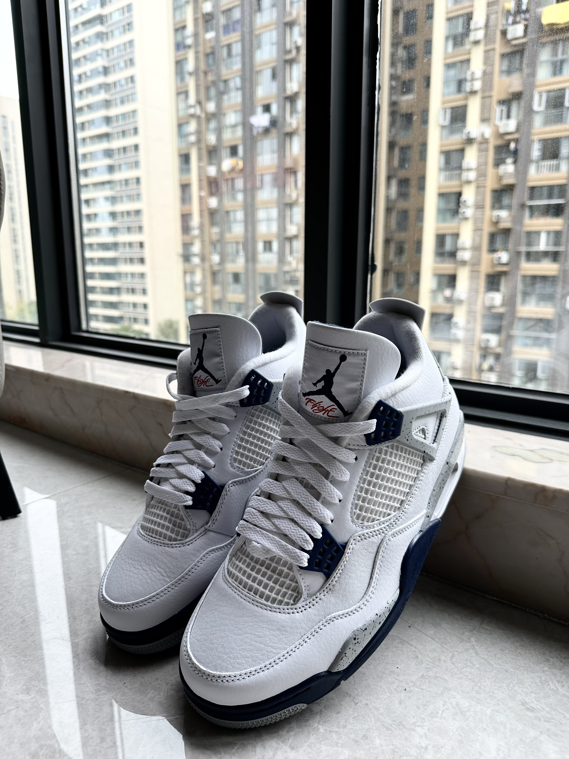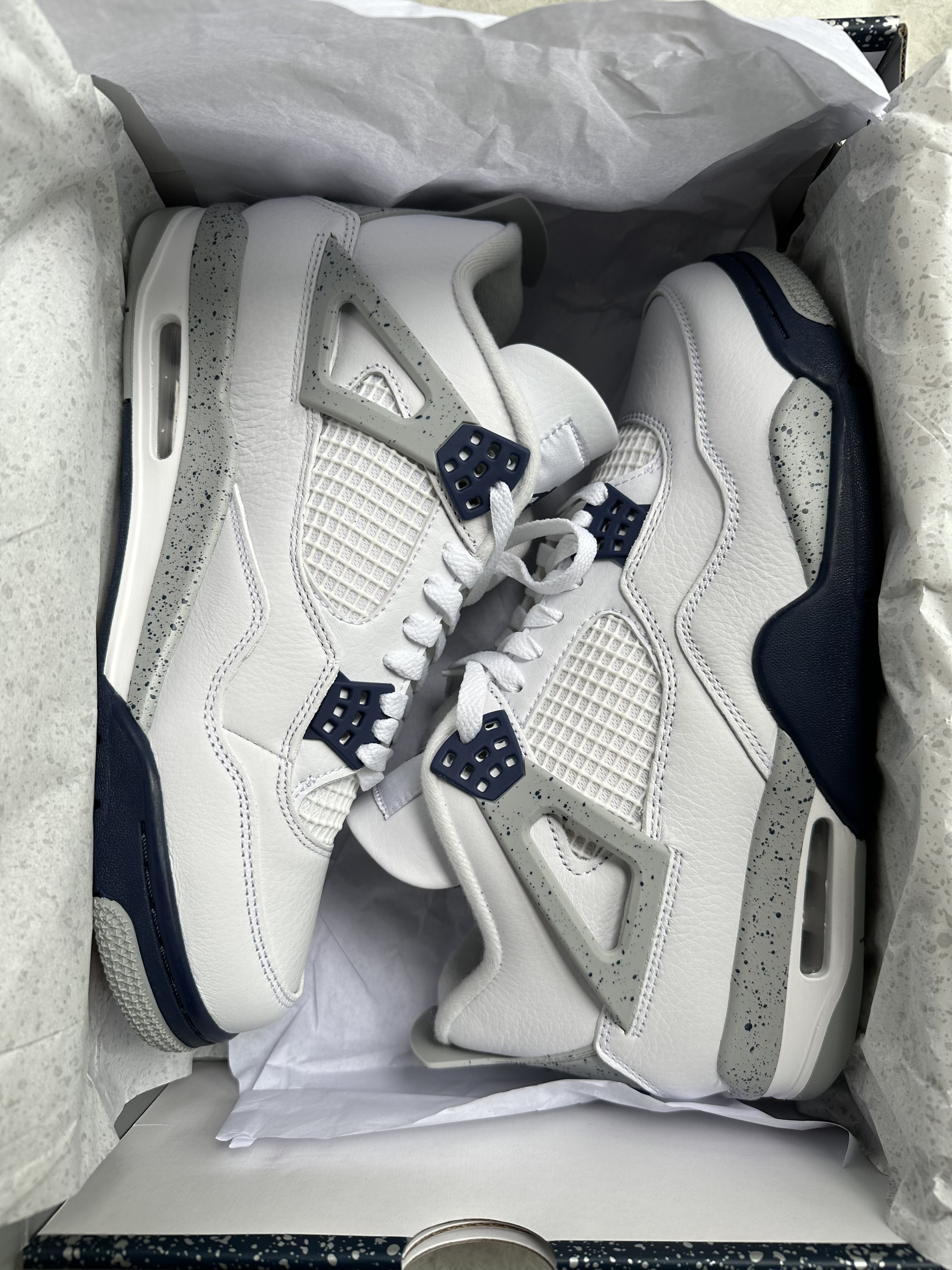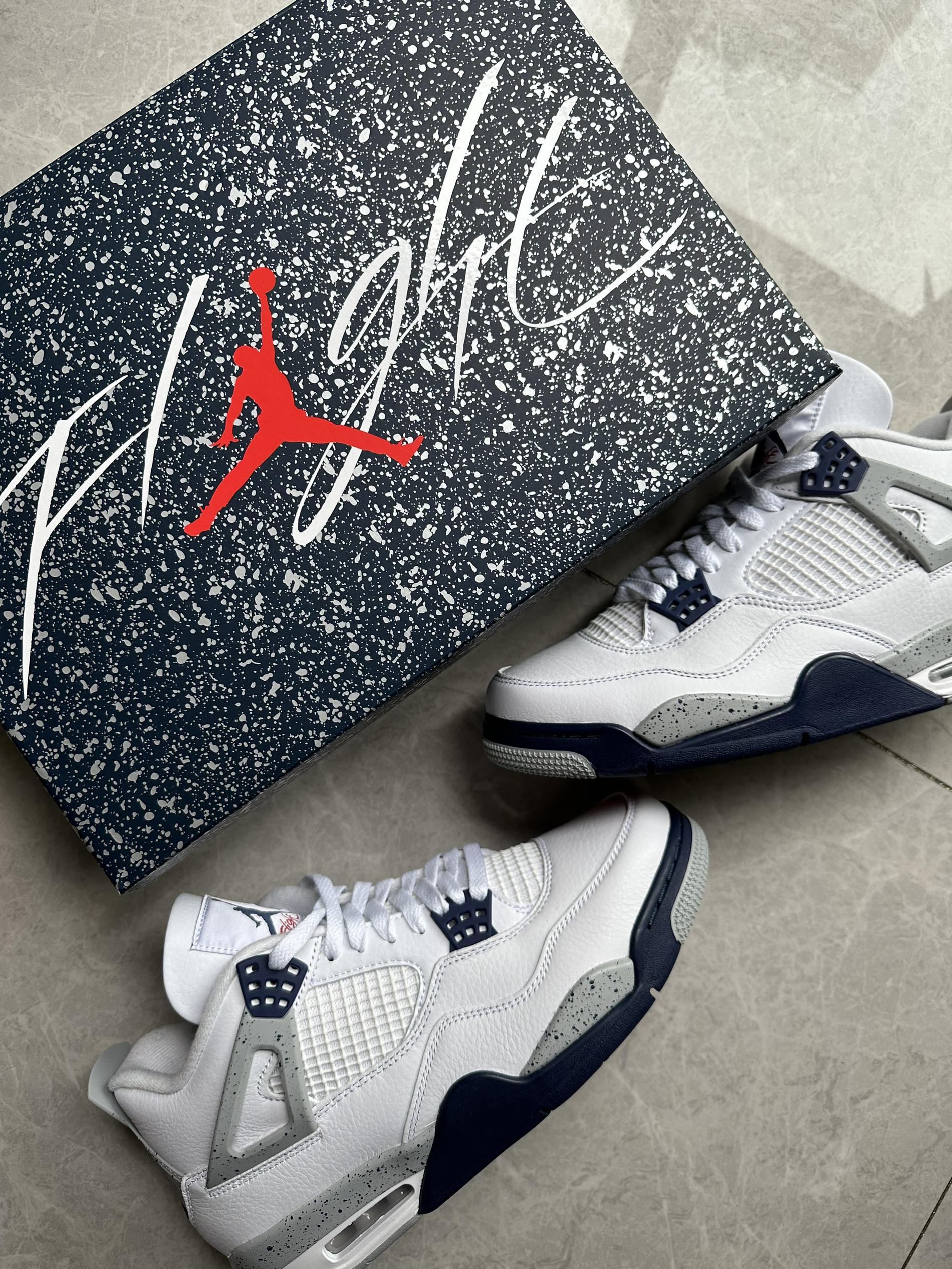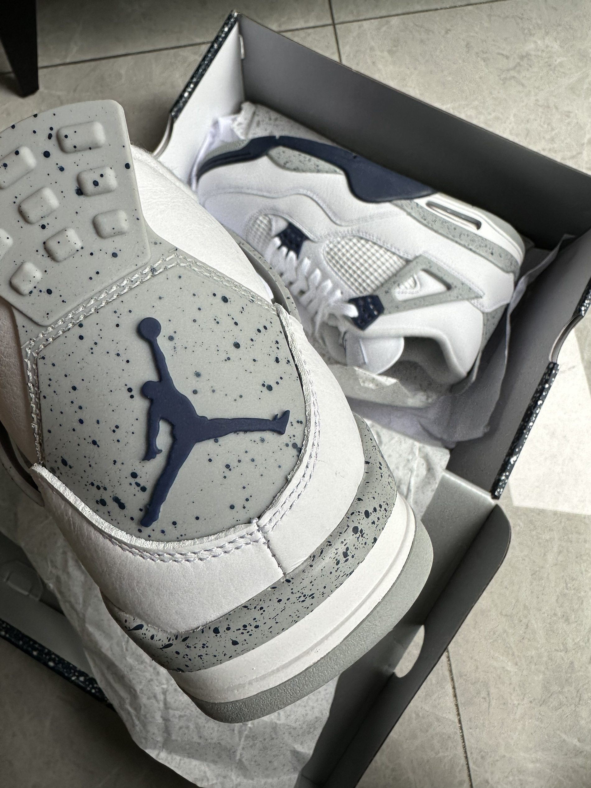 🔥在高中的时候就想穿一双AJ4灰绿,但是当时读书没有收入,所以这双AJ4严格意义上来讲是我的第一双AJ4,颜值真的不要太高! 🔥这次AJ4做工非常好,没有线头和溢胶,鞋面材质质感非常好!这次鞋盒上的泼墨设计配上海军蓝的颜色,真的非常高级,而且鞋盒也比较厚实!穿上效果也比较好,因为采用白色的鞋面,所以这双鞋的搭配属性非常高! 🔥如果你喜欢这双AJ4的话,建议最近抓紧入手,双11...