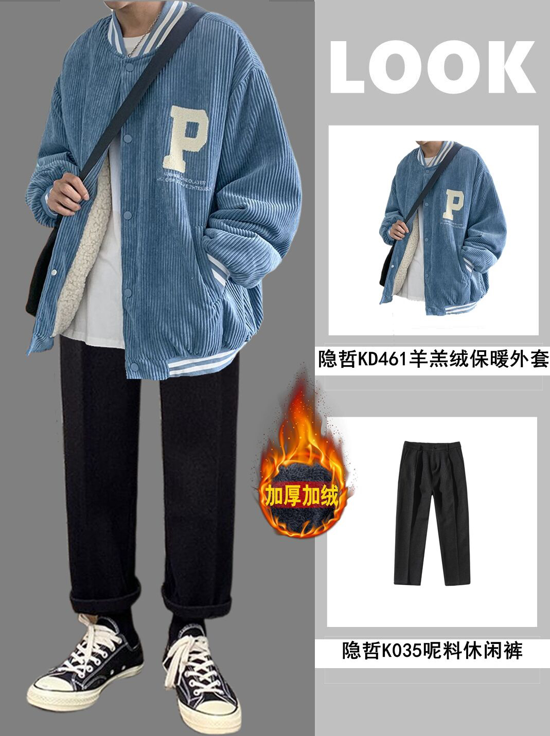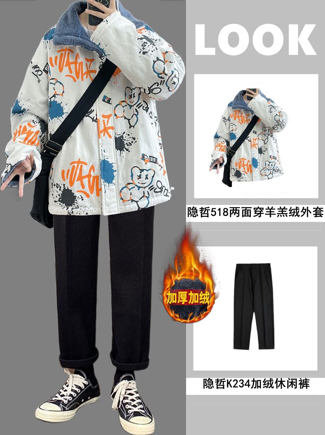 隐哲穿搭518两面穿羊羔绒外套+隐哲K234加绒休闲裤