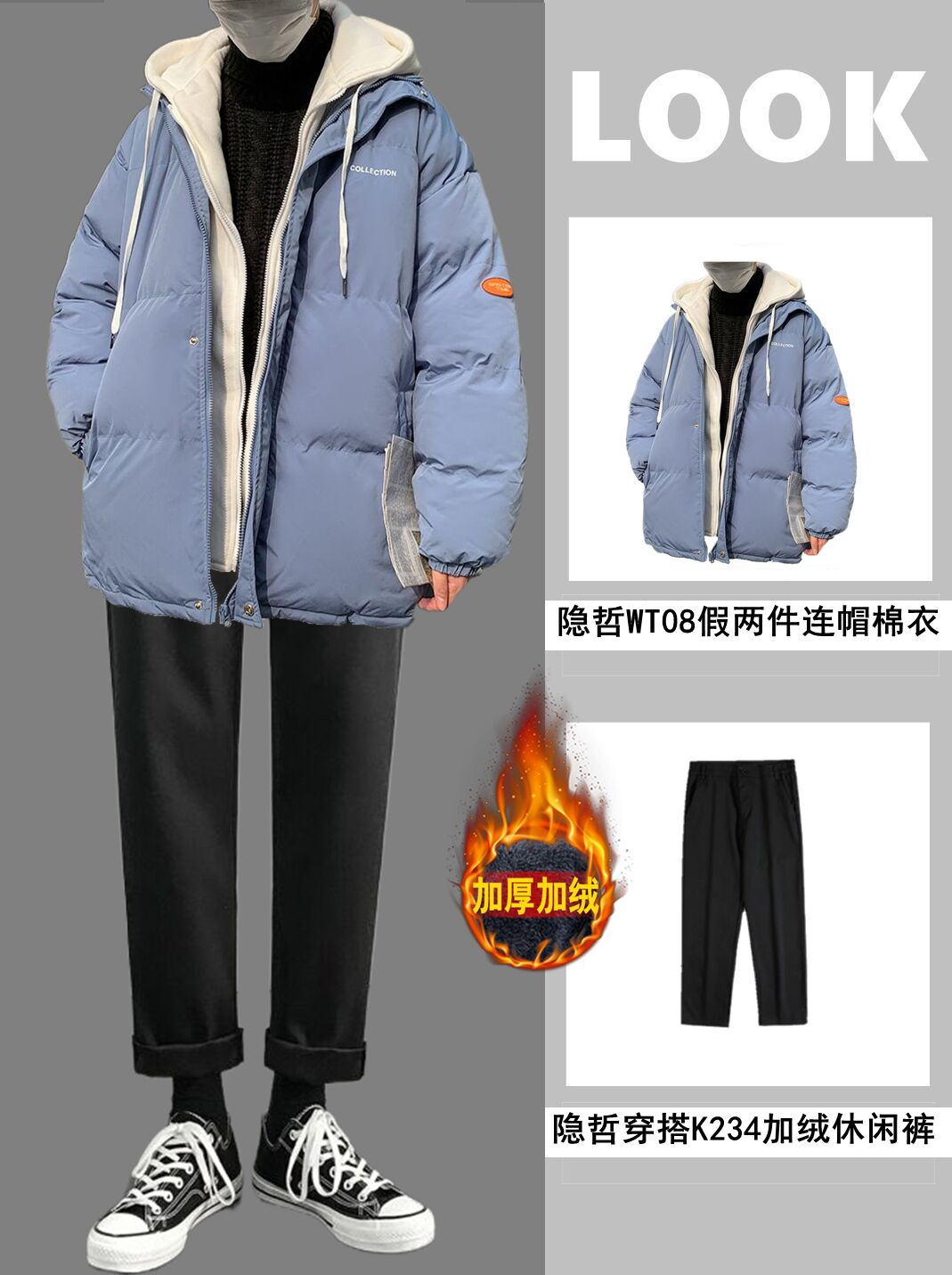隐哲穿搭WT08假两件连帽棉衣+隐哲K234加绒休闲裤