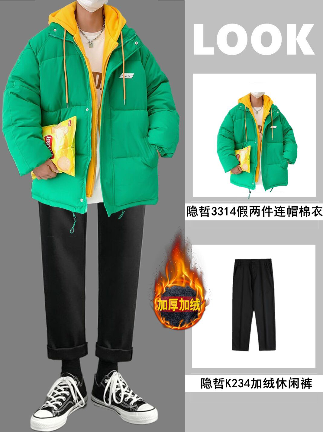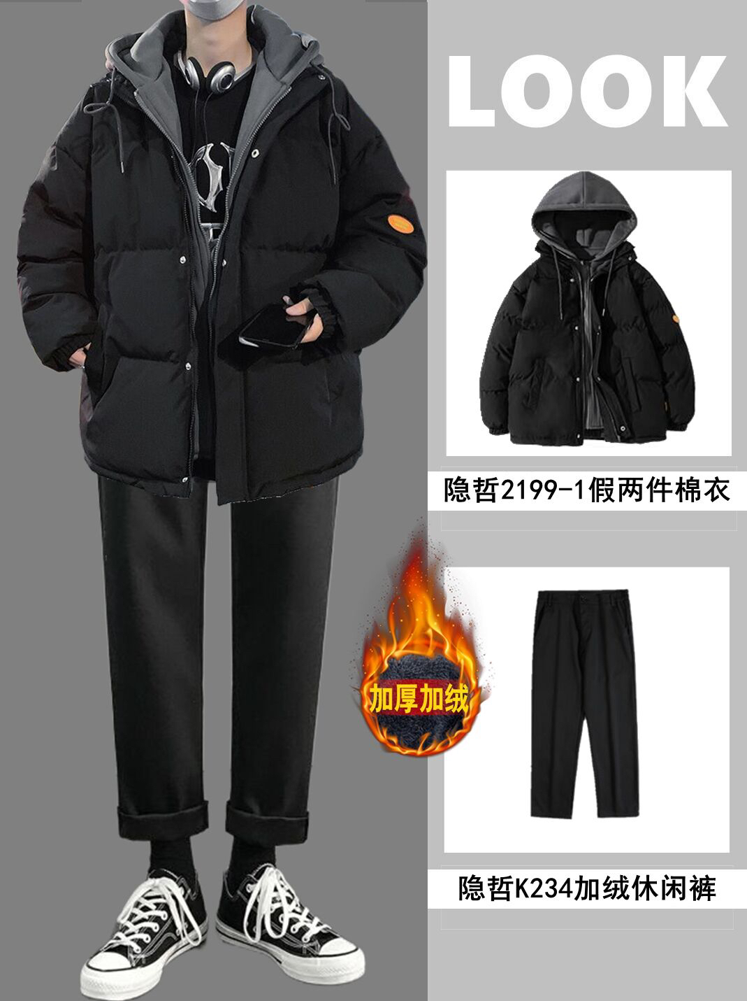 隐哲穿搭3314假两件连帽棉衣+隐哲K234加绒休闲裤