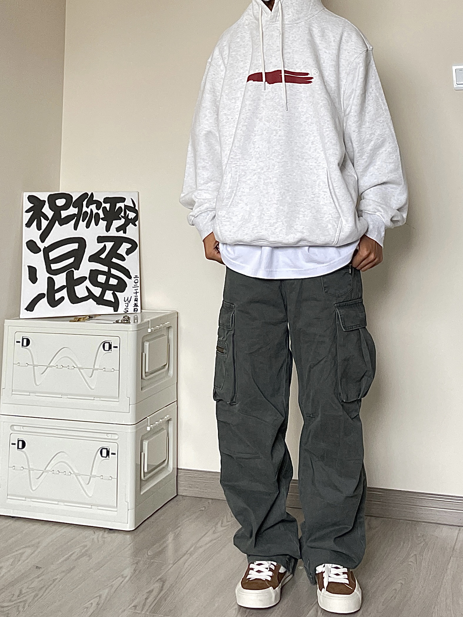 今天是街头滑板少年🛹 👔 上衣是一件来自Wassup的基础帽衫,花灰色搭配胸口的红色油漆印花,整体宽松版型。 👖 裤子搭配一条来自宾狮诺的做旧复古直筒工装长裤,整体的水洗色真的质感满满,拉链配件也是做旧颜色,细节拿捏住了🫴 两侧的立体大口袋设计嘎嘎帅气。 👟 鞋子是来自ODD CIRKUS的滑板鞋