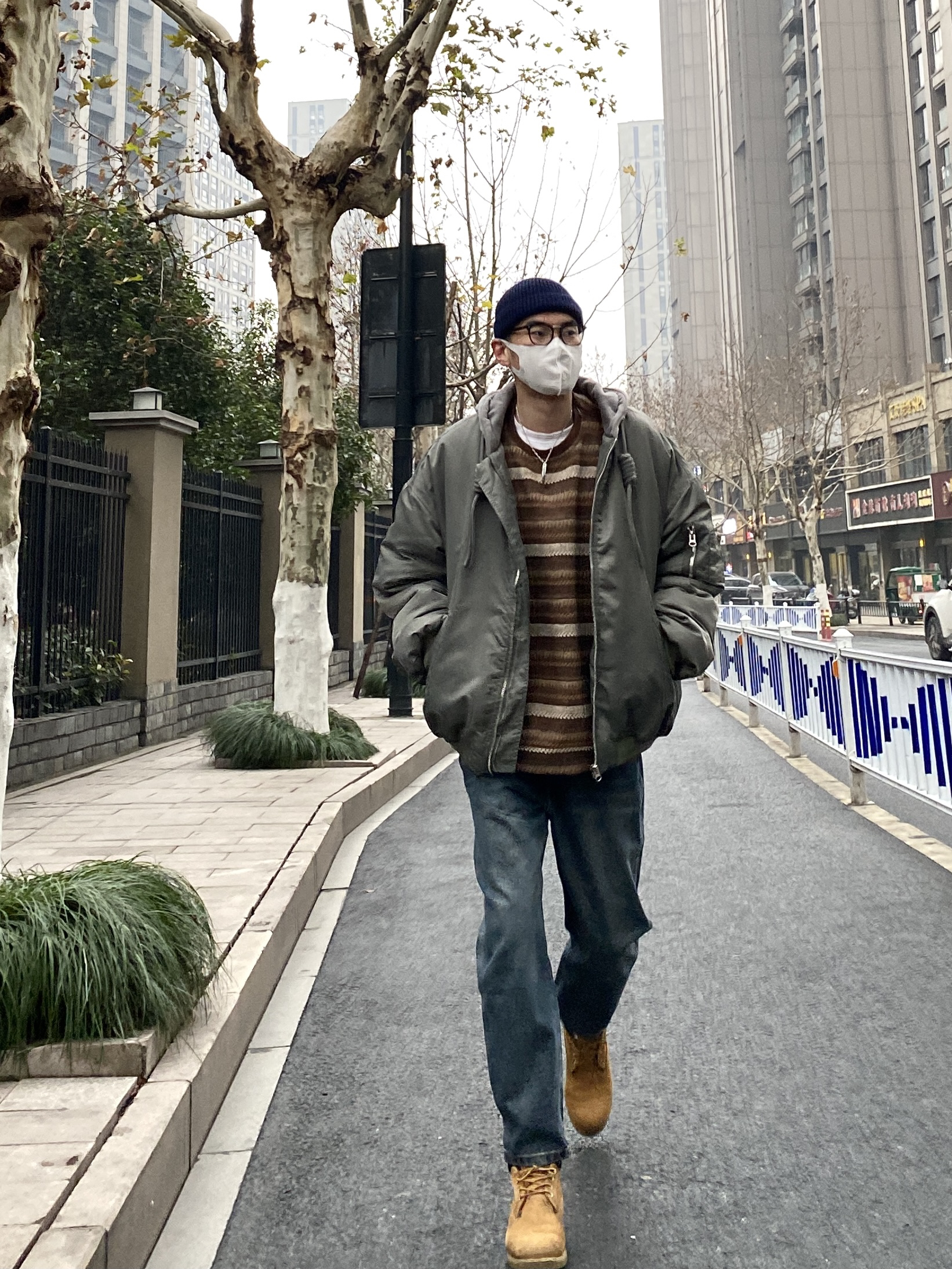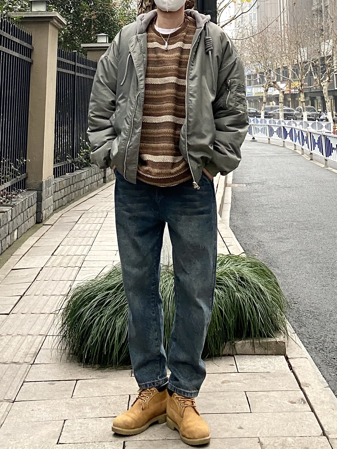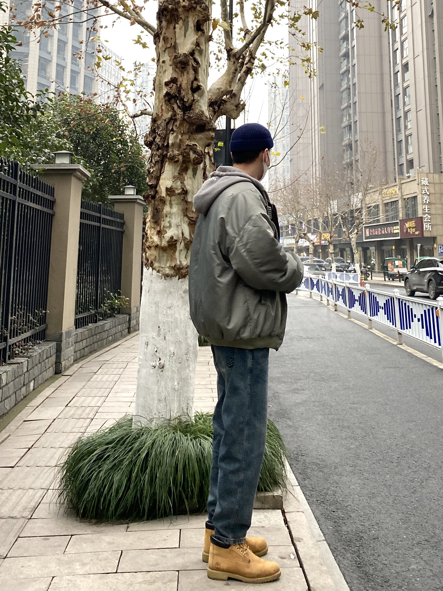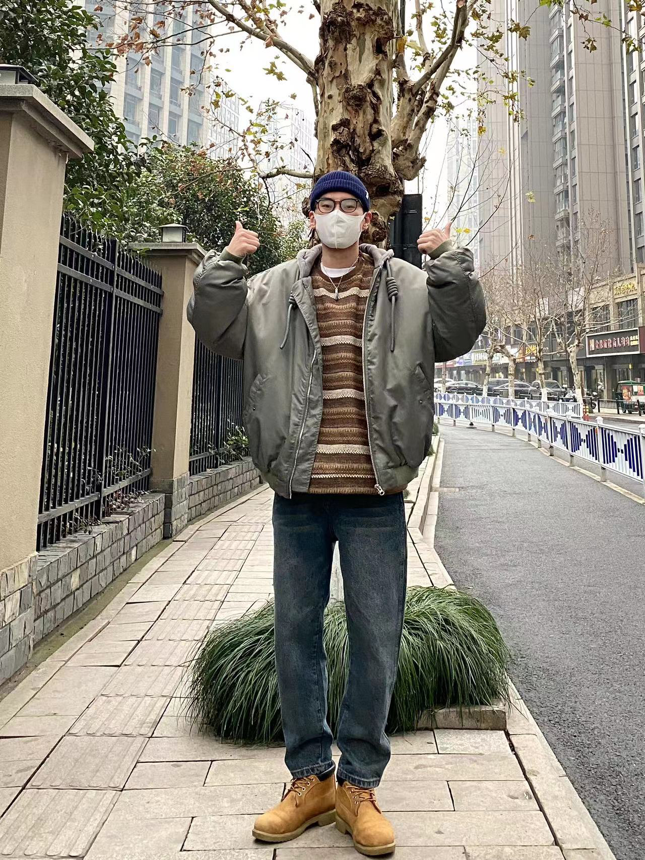 今天这套先用圆领白T做打底,内搭穿一件毛呢拼接条纹卫衣,裤子选择不挑腿型的水洗直筒牛仔裤,鞋子上脚硬汉必备的timberland工装靴,接着套上灰绿色宽松阔版连帽空军夹克棉服,最后戴一顶藏青色线帽,OK,出门看看搭配效果吧! - 今日穿搭 衣服裤子:NICE LILI 鞋子:timberland