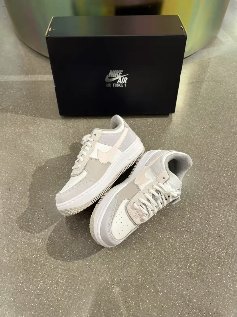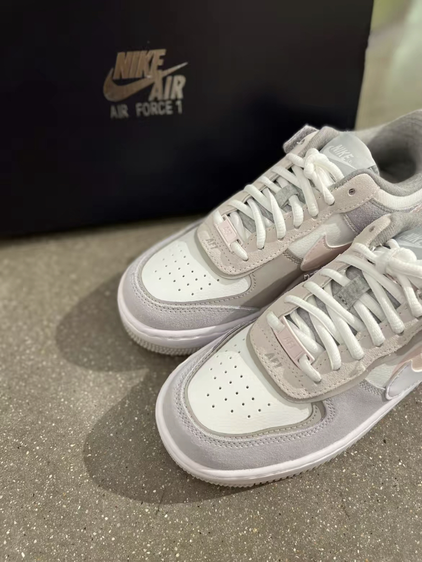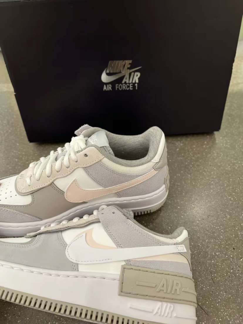 出今年空军四十周年,-下子出了好多宝藏配色, 尤其是这双米灰色Shadow女鞋,上 脚敲好看的, 简直了! ! ! 台Nike Air Force 1 Shadow低帮休闲板鞋女款米色 V解构复古鞋型,浅灰色毛皮和米白色皮革拼接而成的鞋面,白色和粉色双钩子叠加。 棕褐色的AIR包边和镂空鞋底,整体重量依旧是 很轻质,而且脚感比纯白空军柔软太多了! ! !1这种浅色系小板鞋,搭配方面根本不需要...