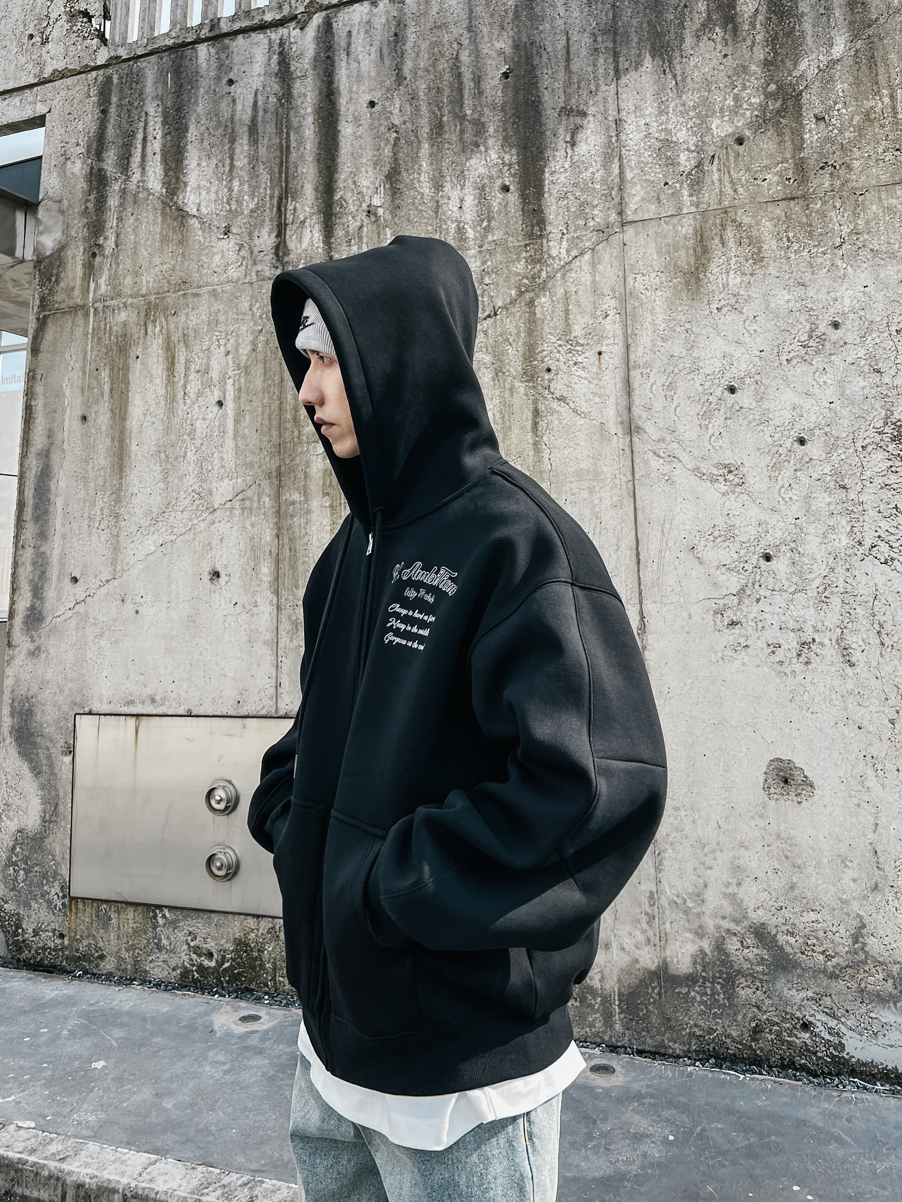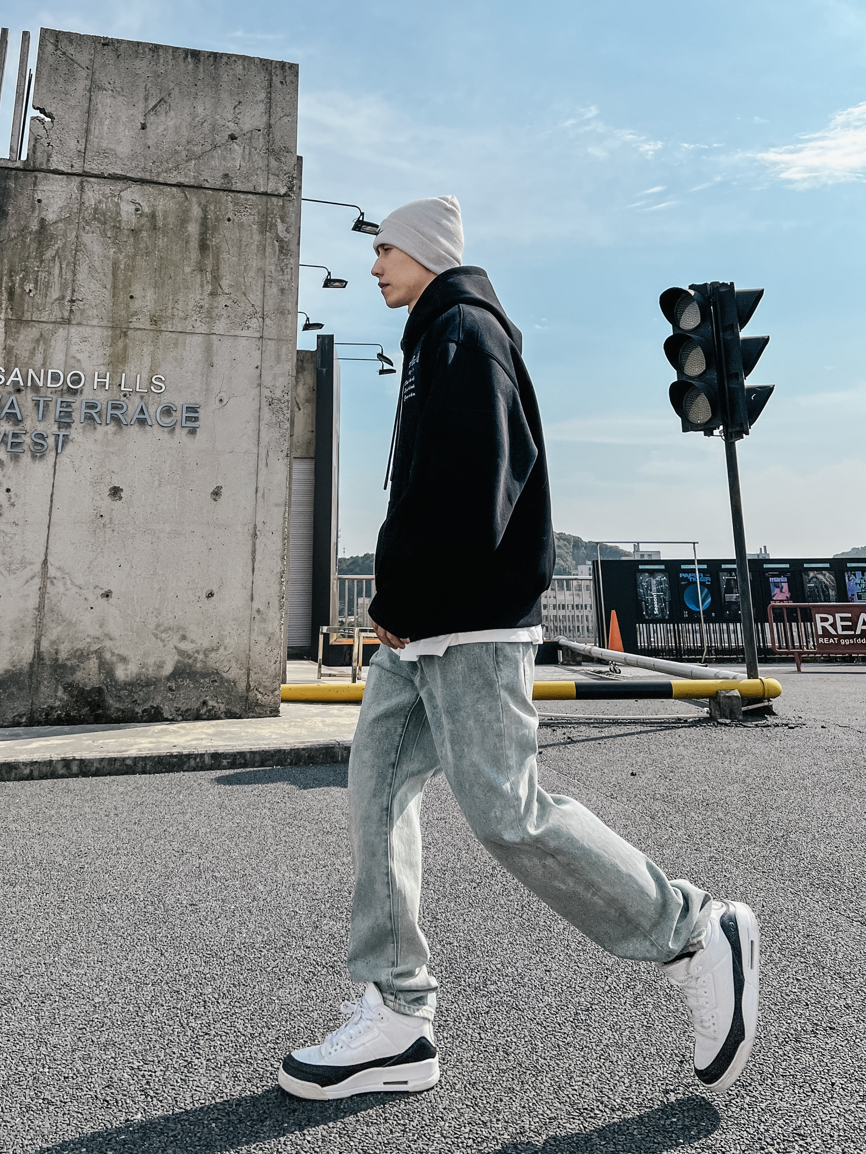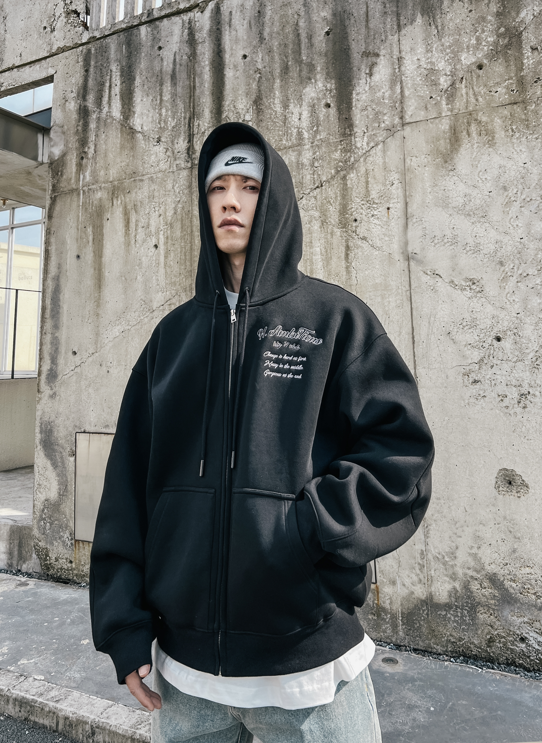 上衣👕:特喜欢这种真oversize版型,显的身材高大,自信满满🥹🥹450克薄绒卫衣料,这厚度穿起来是真的爽,挺阔感支撑力十足。防风效果也是杠杠的了。 裤子👖:牛仔裤还是直筒的最好搭配了。 鞋子👟:aj3 藤原浩,巨百搭,懂的都懂了吧。