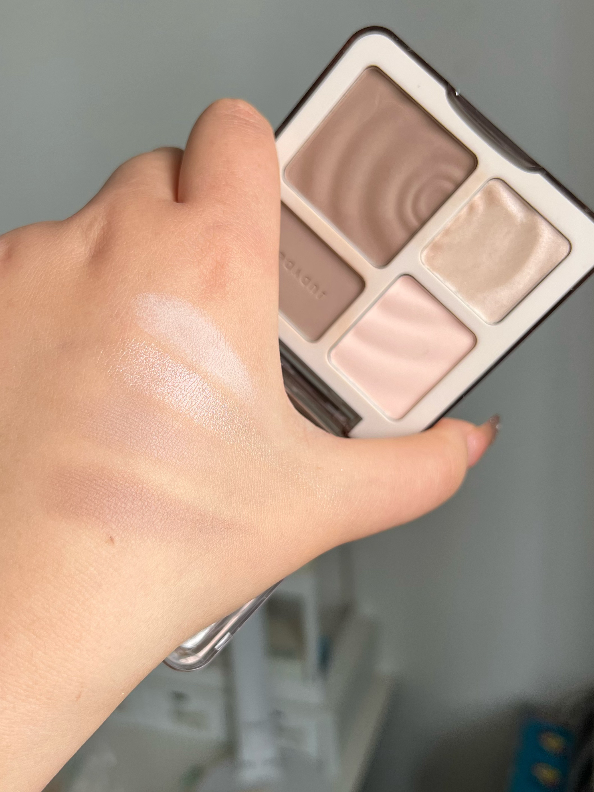 一盘有两个修容色,很贴心, 颜色都是很自然,不仔细看看不出打了修容的!和皮肤融合的很好! 一个适合鼻影,一个适合脸颊侧影~ 淡粉色的哑光高光色上脸的瞬间就嘭起来了~面中凹陷、想法令纹的真的很合适,自然不突兀 还有一个珠光色也很美丽! 不会显得妆容脏,而且粉质很细腻 而且一盘也不贵,刚好用双十一来凑单!