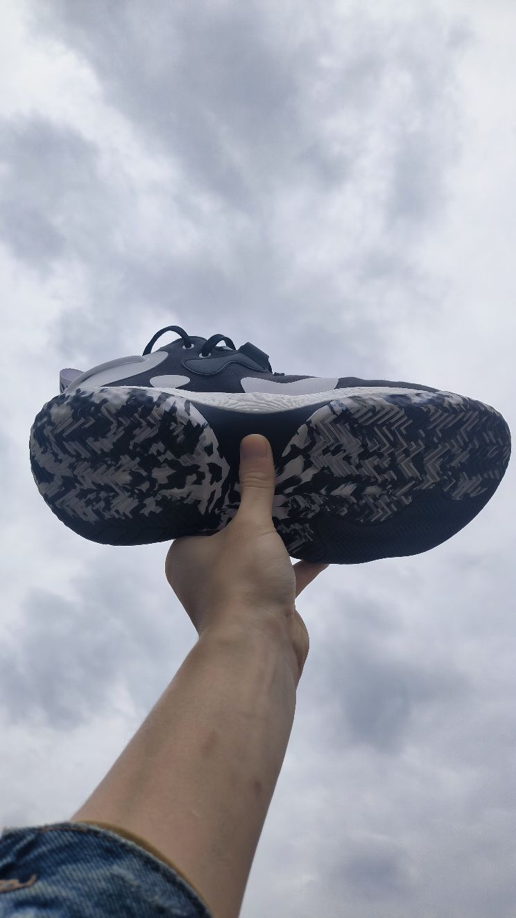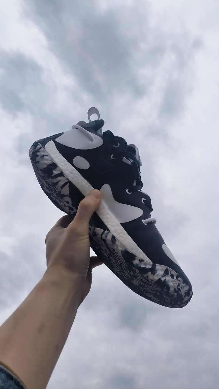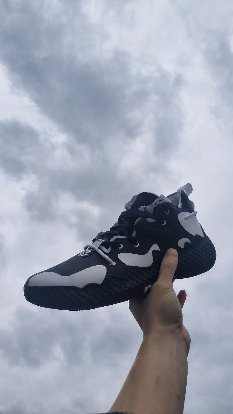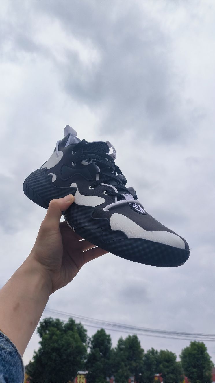 #十月再见 黑,白,灰,可能才是秋天自然色吧。就像哈登6黑白,我称之为熊猫配色。黑色麂皮打底,点缀白色皮革片,简约又好看。打球出街两相宜。