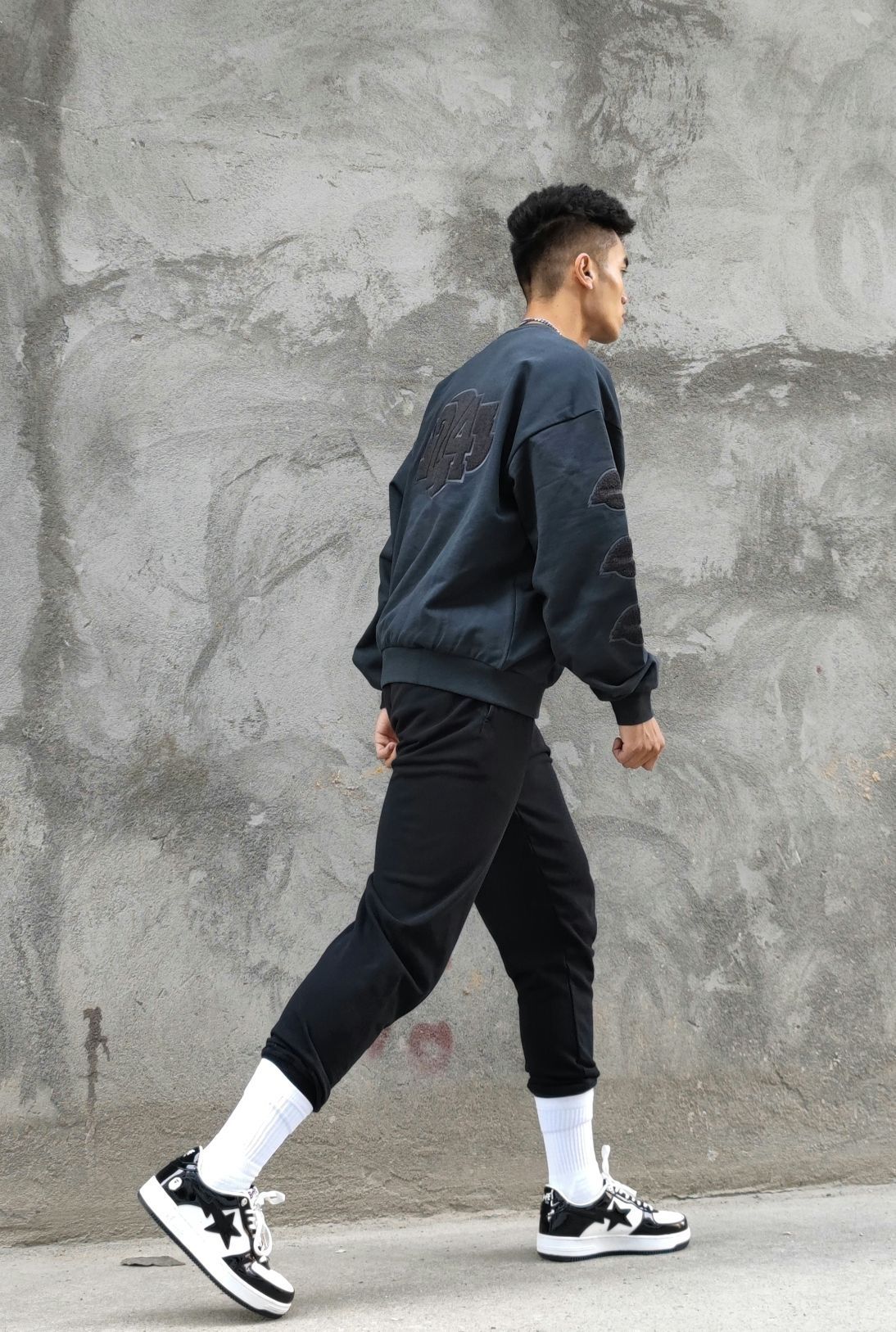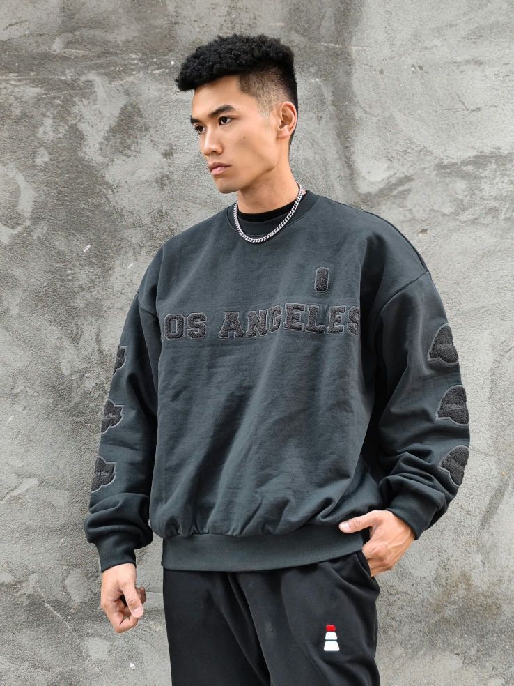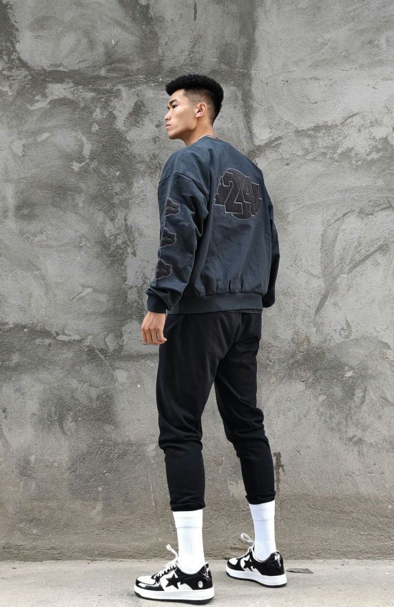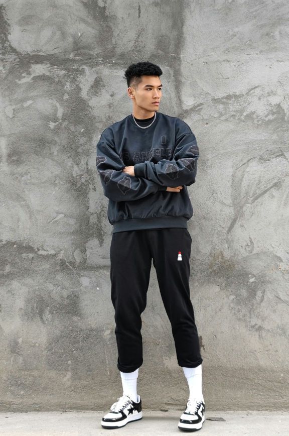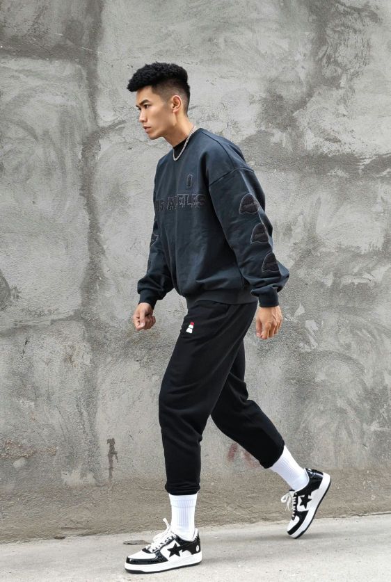 分享穿搭 _ 美式圆领卫衣,宽松版型,领口收小设计,可搭配古巴链,潮流印花,日常休闲或者秋冬运动都是不错的选择。 _ 运动休闲长裤,美式简约设计,修身版型。 _ 美式复古休闲板鞋。