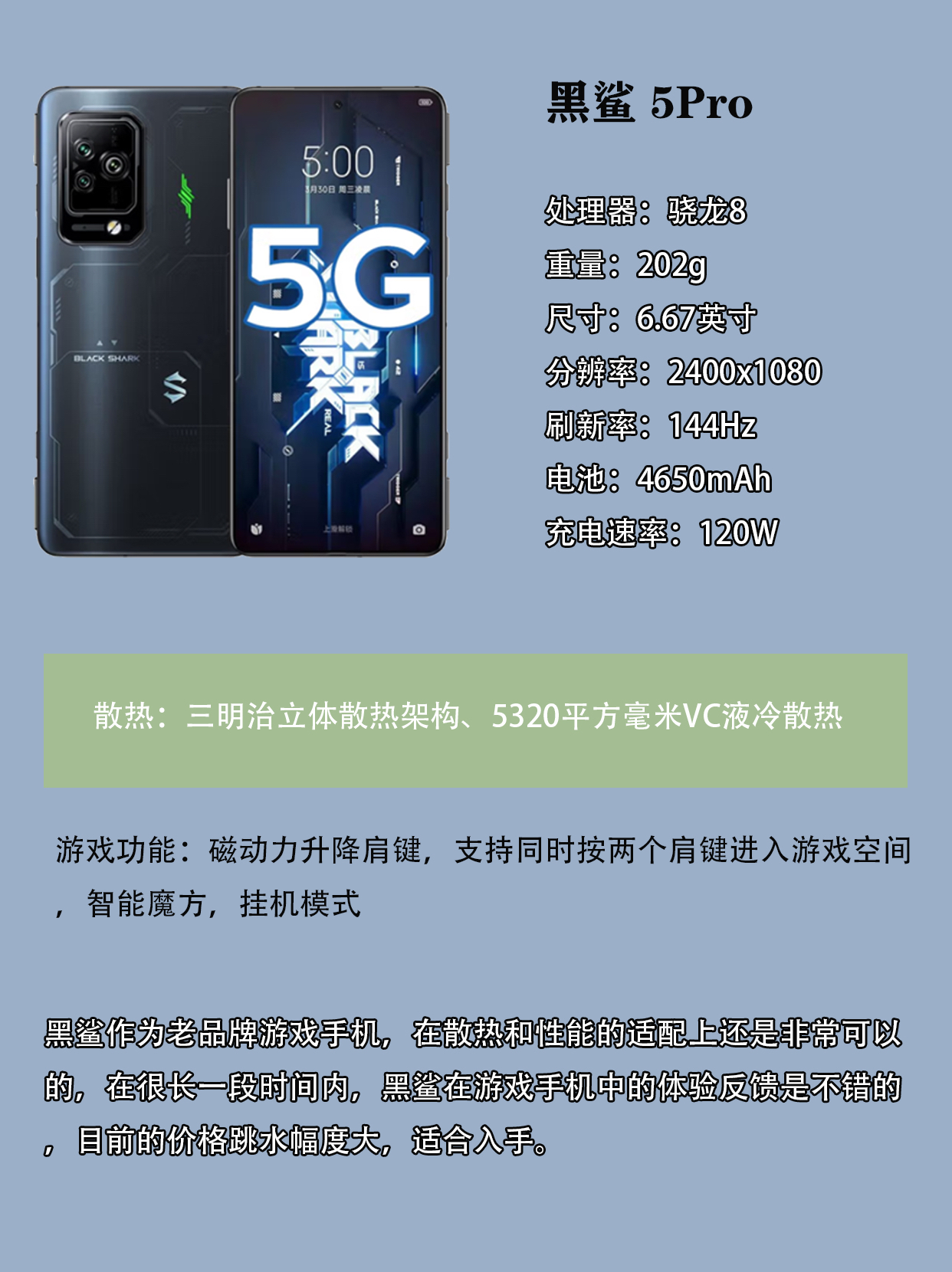 首先了解一下游戏手机的适用人群:对游戏帧率要求较高,对显示效果以及手机性能和散热要求较高的重度游戏玩家,对于手机像素的要求不是很高。 首先是四款标准定义的电竞手机: 第一款:黑鲨5Pro 参考价:8+256G¥3499 第二款:红魔7 参考价:12+256G¥3999 第三款:拯救者Y70 参考价:12+256G¥2999 第四款:ROG6 参考价:12+256G¥4...